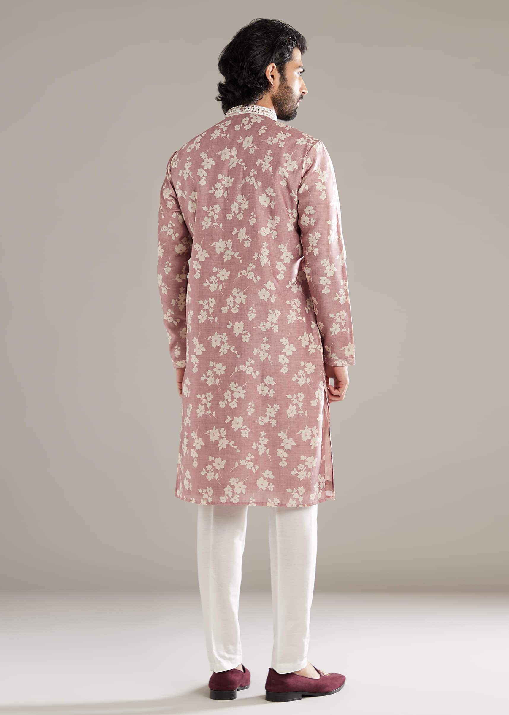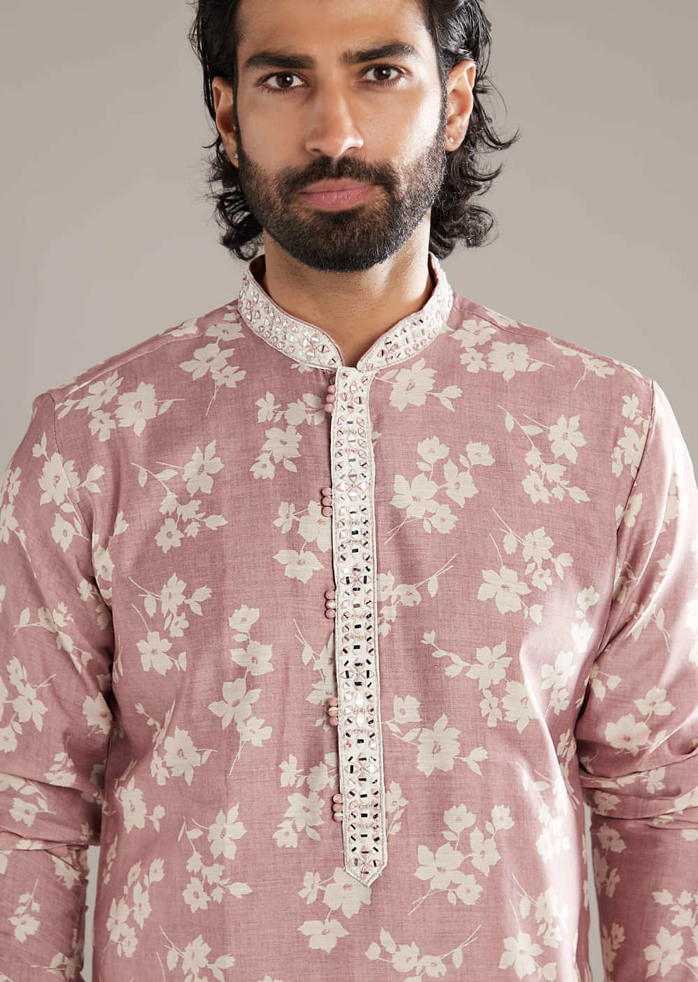 Powder Pink Kurta Set For Men With Floral Print And Mirror Work