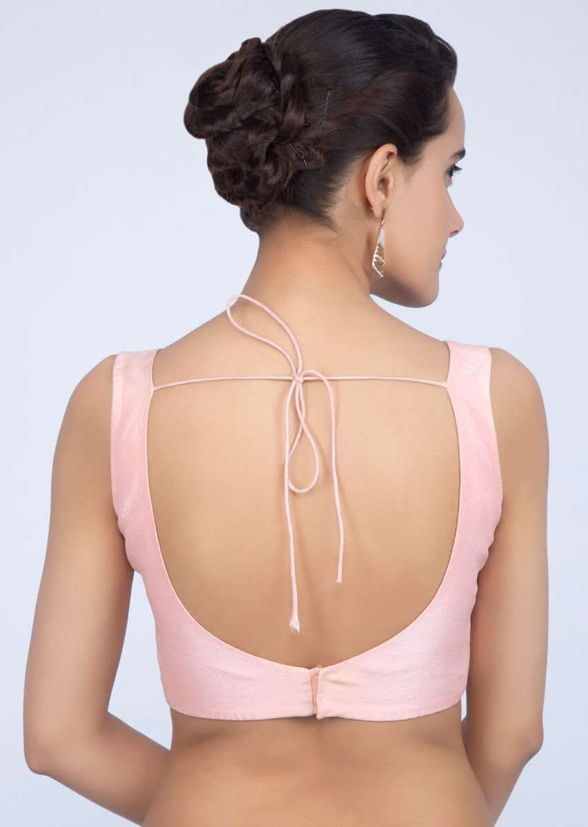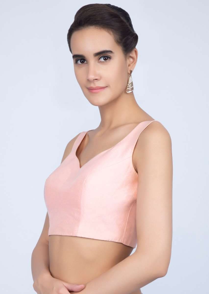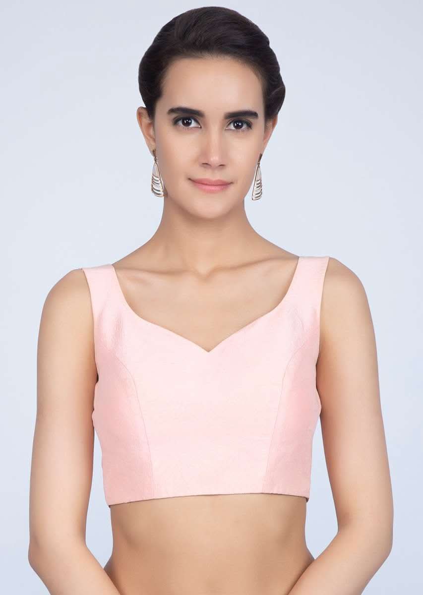 Powder Pink Blouse In Raw Silk With Sweet Heart Neck