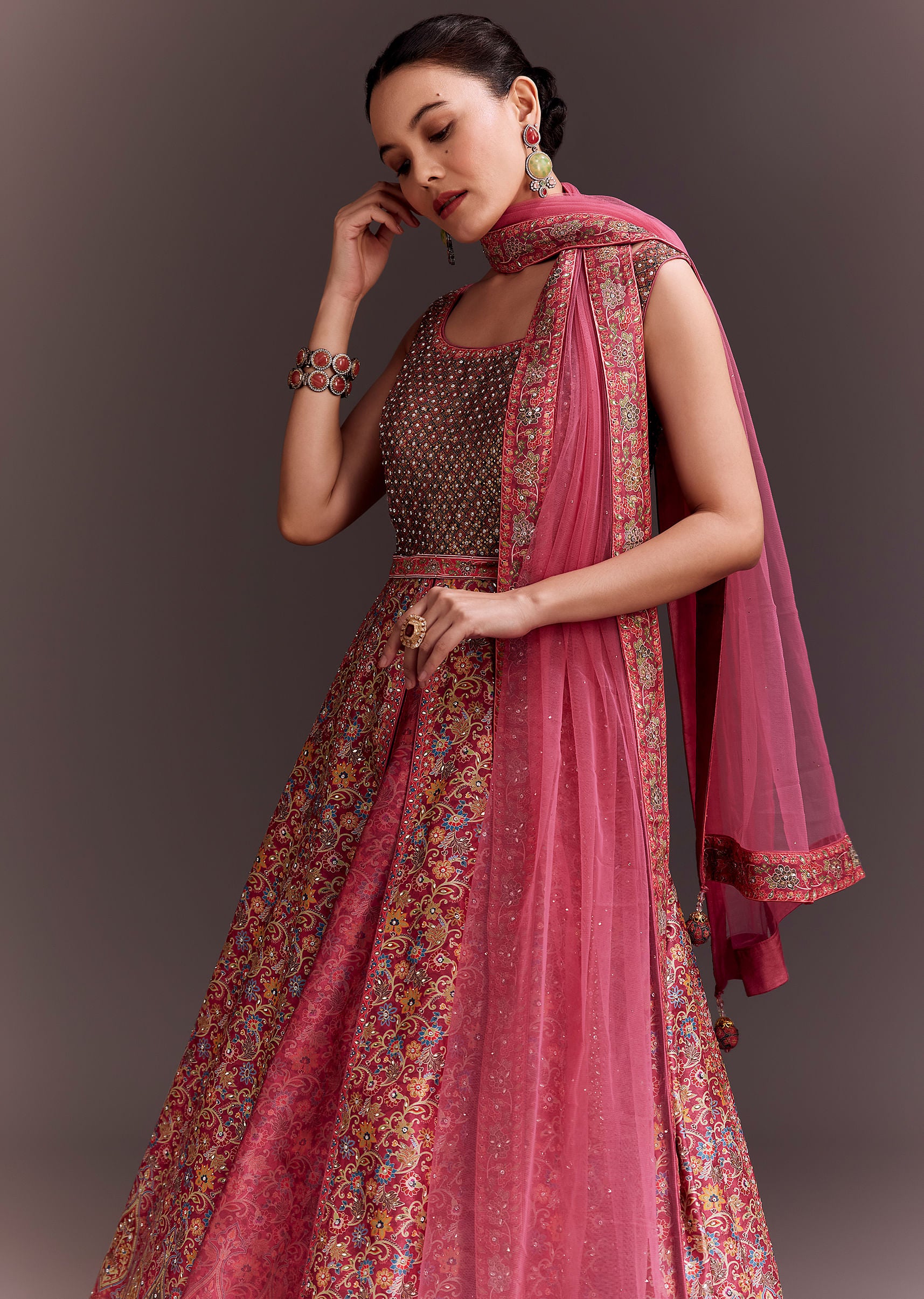 Punch Pink Embroidered Anarkali With Net Dupatta