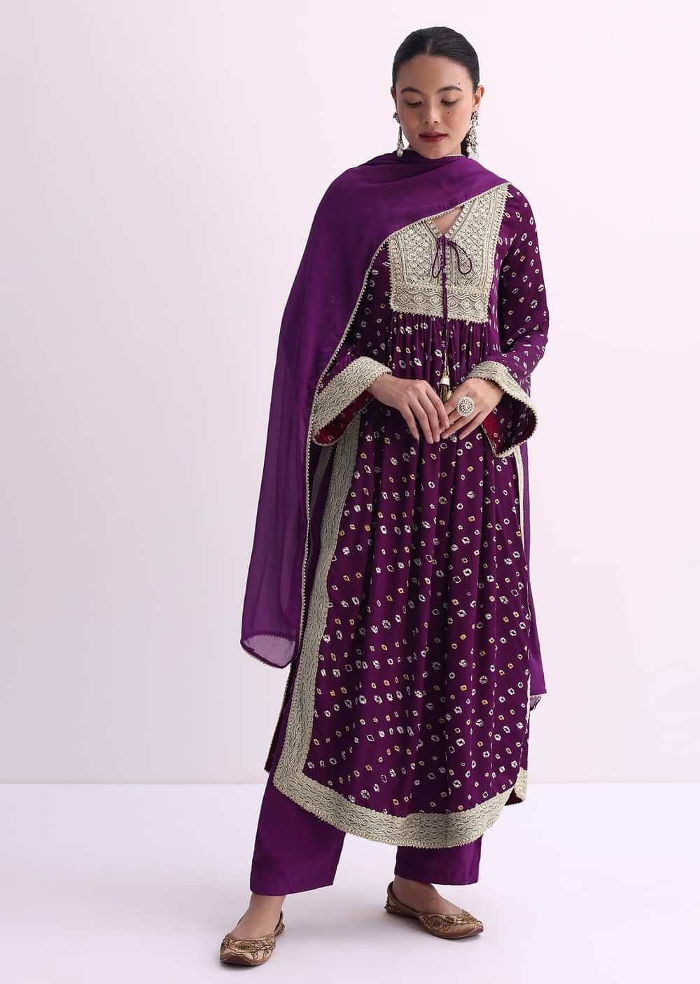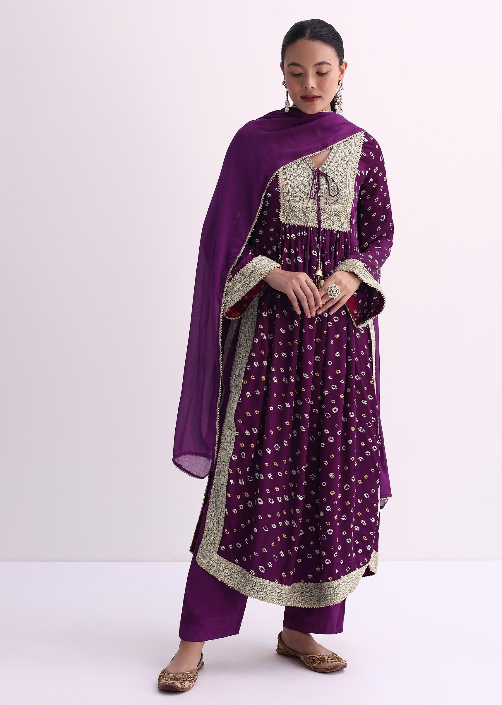 Purple Bandhani Print Kurti Pant Set With Dupatta