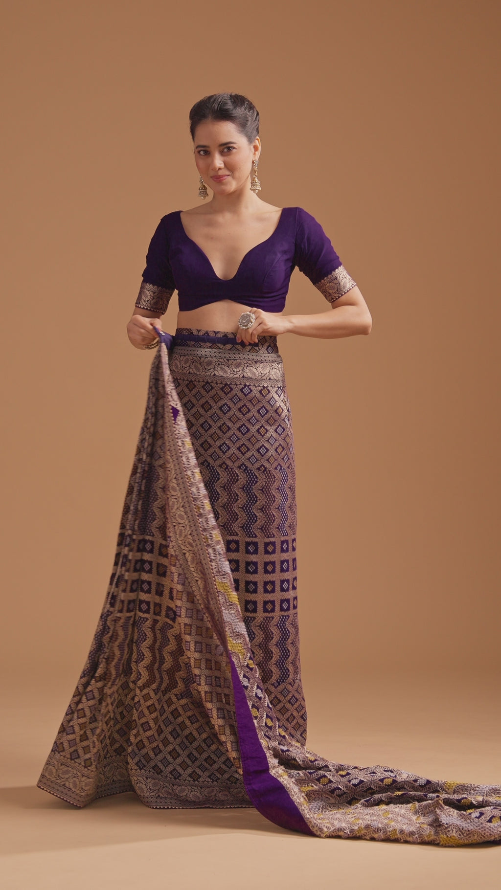 Immerse yourself in the festive grandeur of our purple khaddi saree exquisitely crafted with a vibrant woven bandhani. Embellished with intricate zari jaal motifs this saree radiates timeless sophistication. It comes with an unstitched blouse for a custom haute couture fit. Awarded as the Most Trusted Brand, we're delivering styles you love, just as promised.
