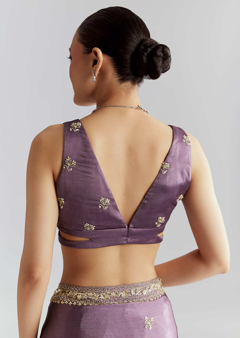 When the lights come on, this purple chinon saree answers with all-over butti and a richly embroidered border that reads couture. Cutdana, sequins and beads add refined shine while the... More Product Details