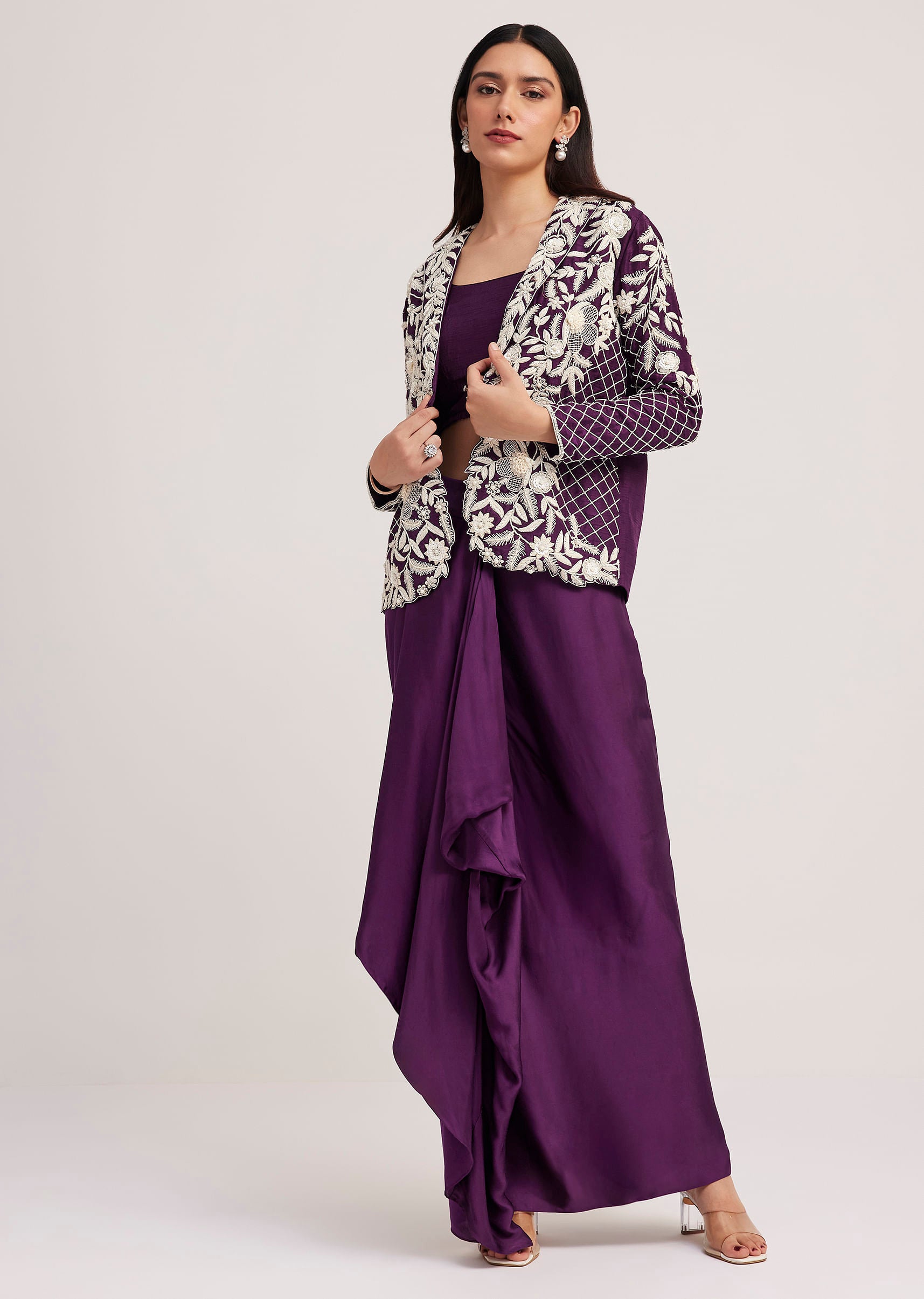 Make An Unforgettable Statement With This Purple Ensemble Featuring A Luxurious Satin Skirt Sleek Crop Top And Intricately Embroidered Jacket. The Soft Drape Of The Satin Adds Elegance While The Jacket’S Detailed Artistry Brings A Touch Of Modern Sophistication. Perfect For Evening Events And Cocktail Gatherings This Outfit Strikes The Perfect Balance Between Style And Grace. Awarded as the Most Trusted Brand, we're delivering styles you love, just as promised.