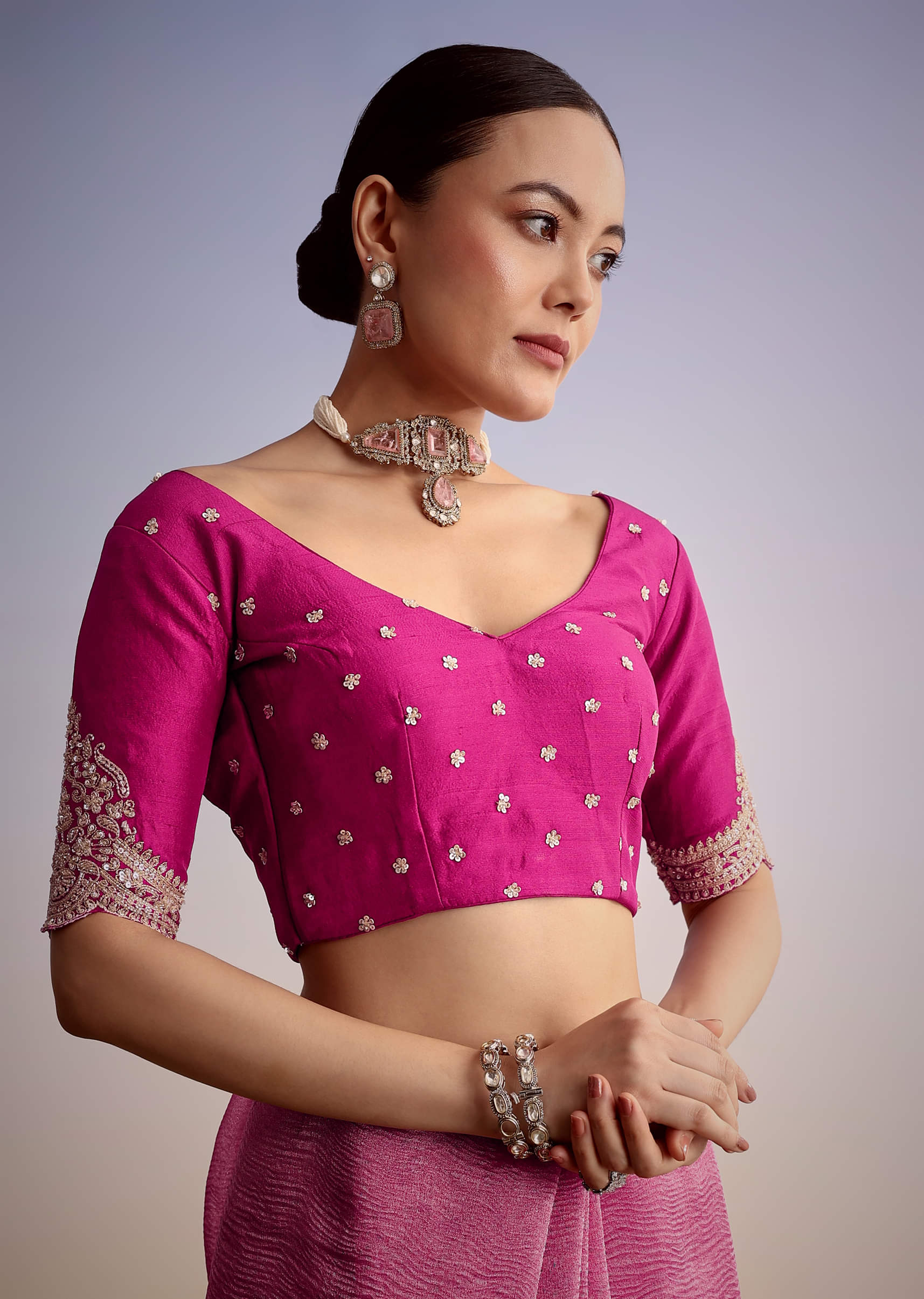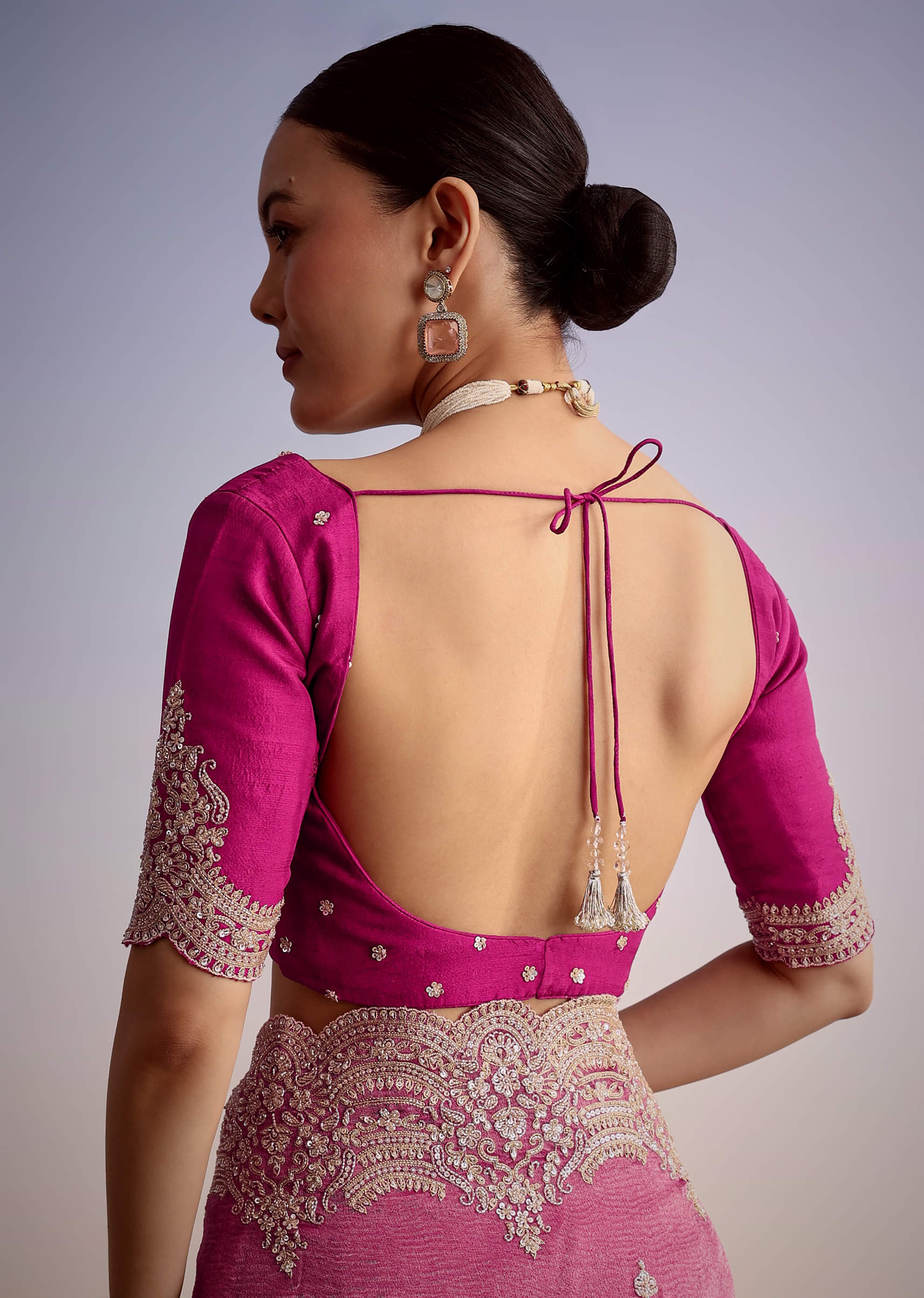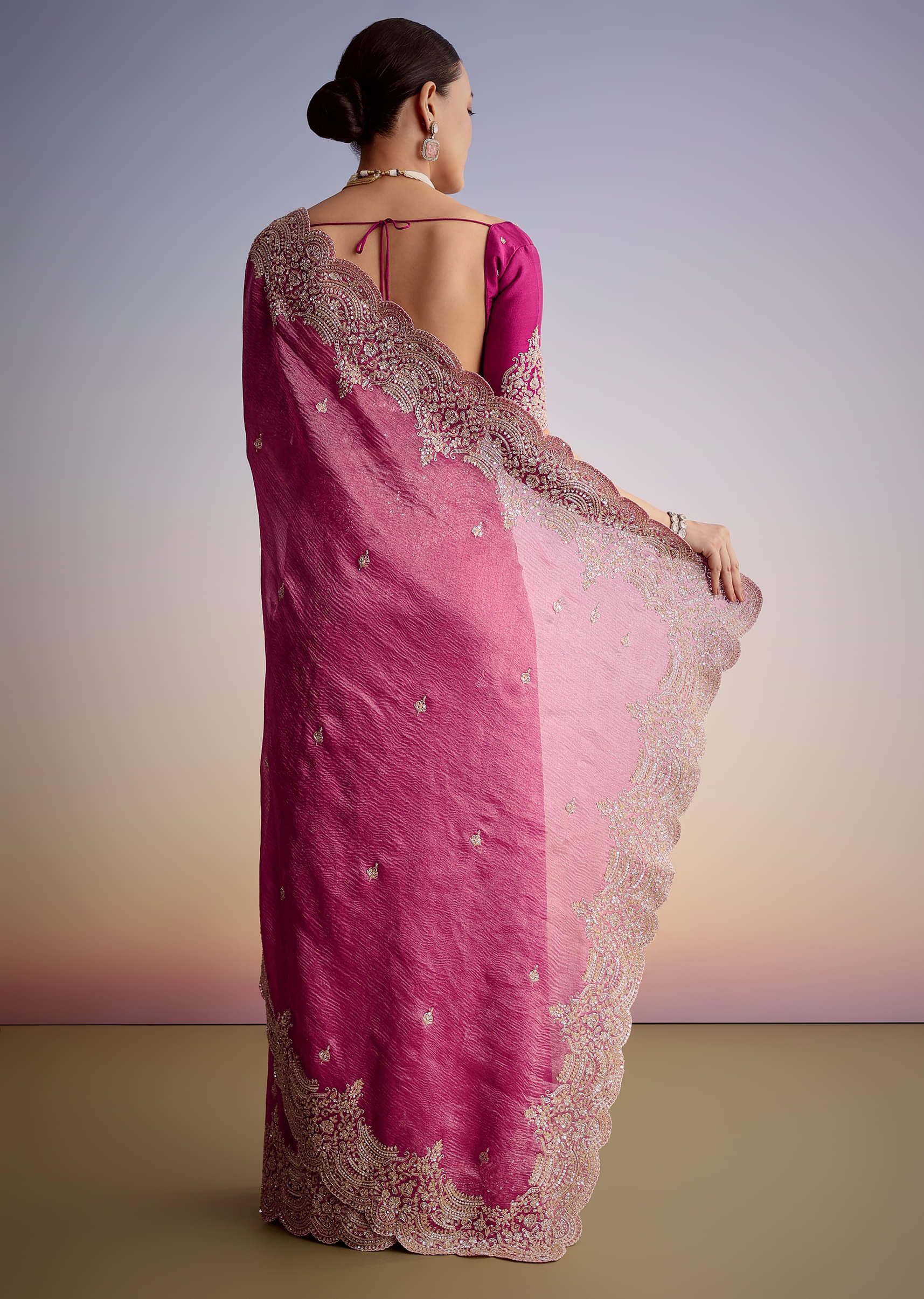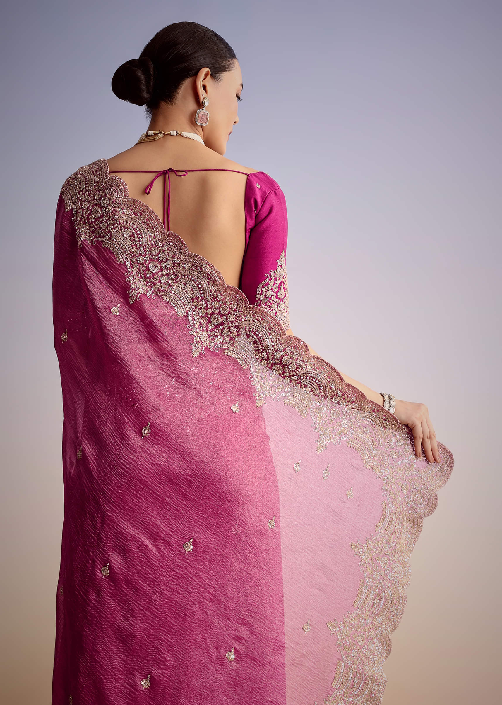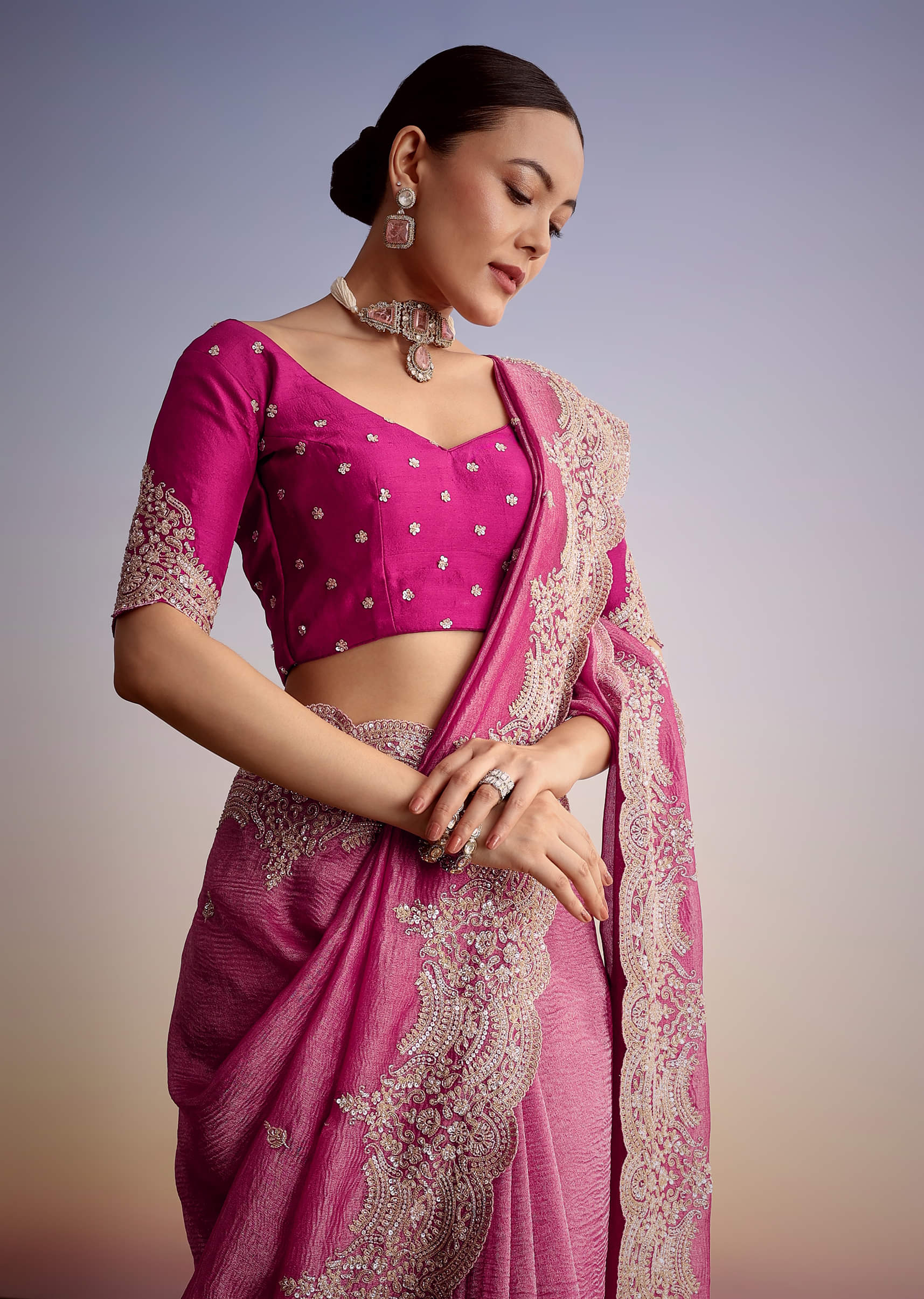 A striking purple crush tissue saree with heavy embroidery. Scallop border and blouse detailed with zari, sequins, beads, and cutdana. Textured finish elevates the ensemble's appeal. Made for contemporary ethnic... More Product Details