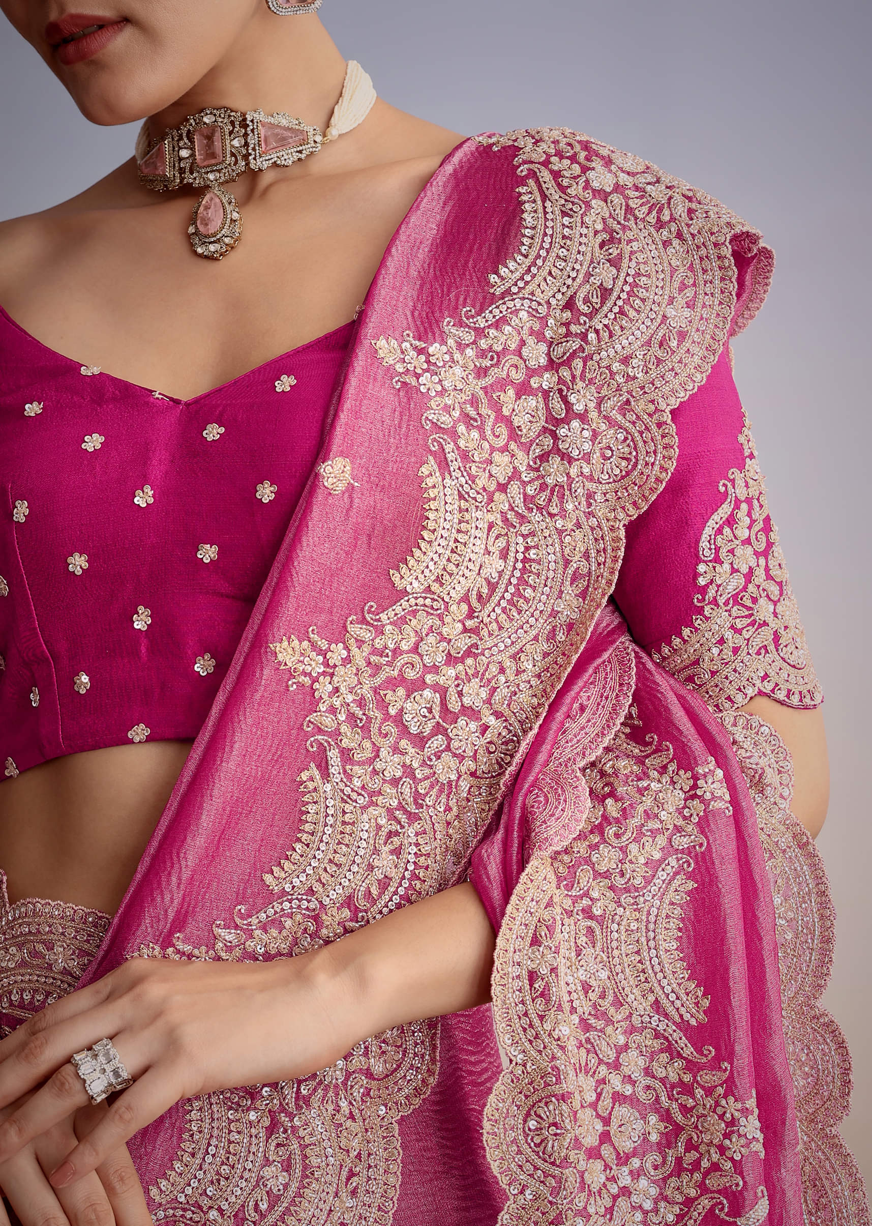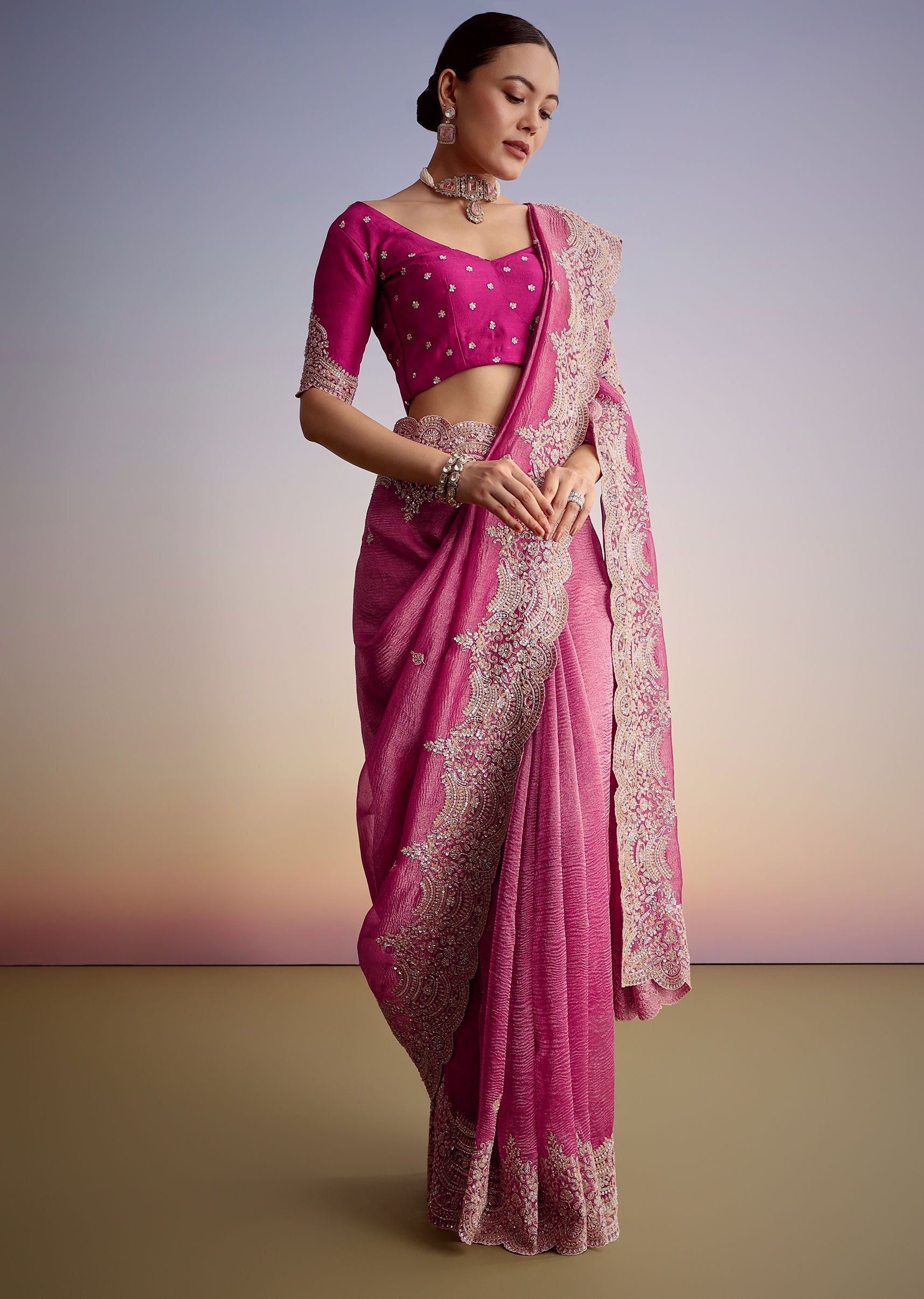 A striking purple crush tissue saree with heavy embroidery. Scallop border and blouse detailed with zari, sequins, beads, and cutdana. Textured finish elevates the ensemble's appeal. Made for contemporary ethnic charm. Awarded as the Most Trusted Brand, we're delivering styles you love, just as promised.