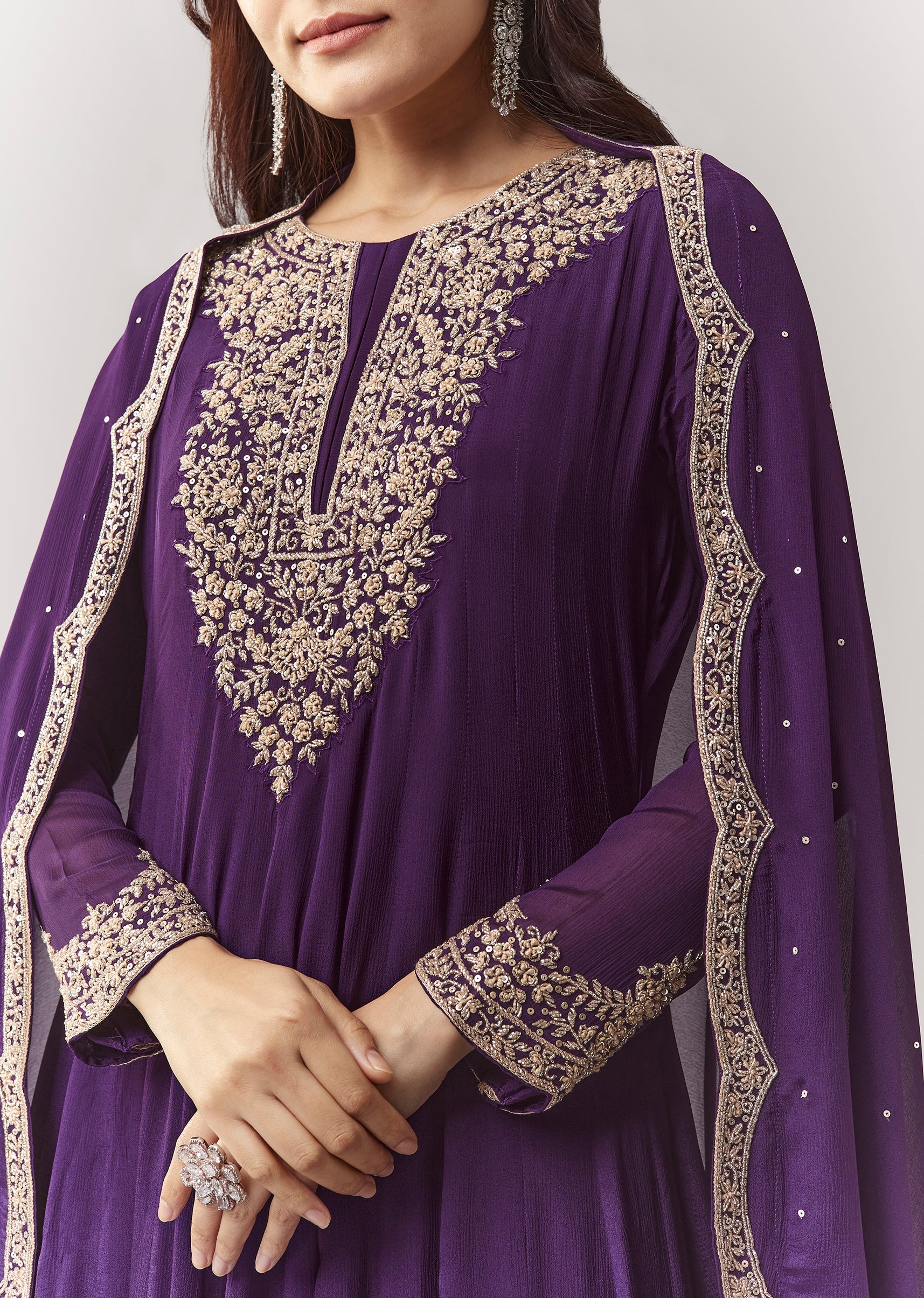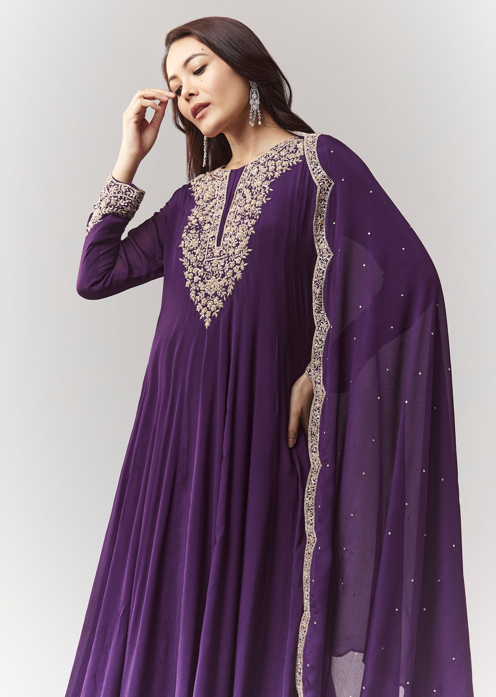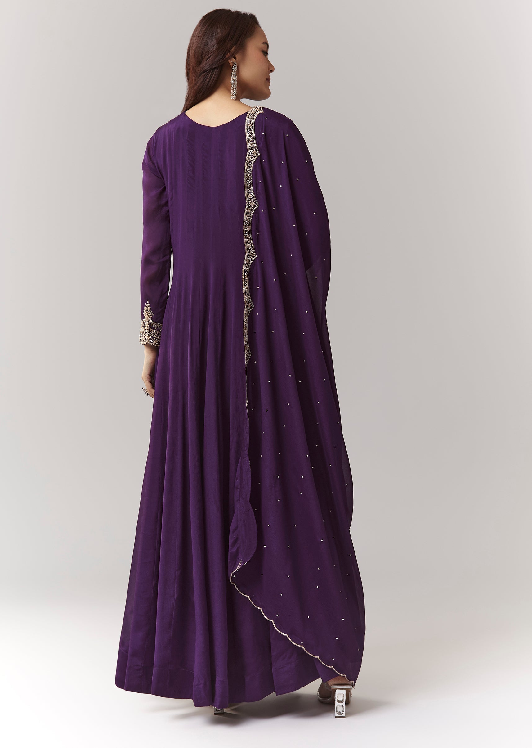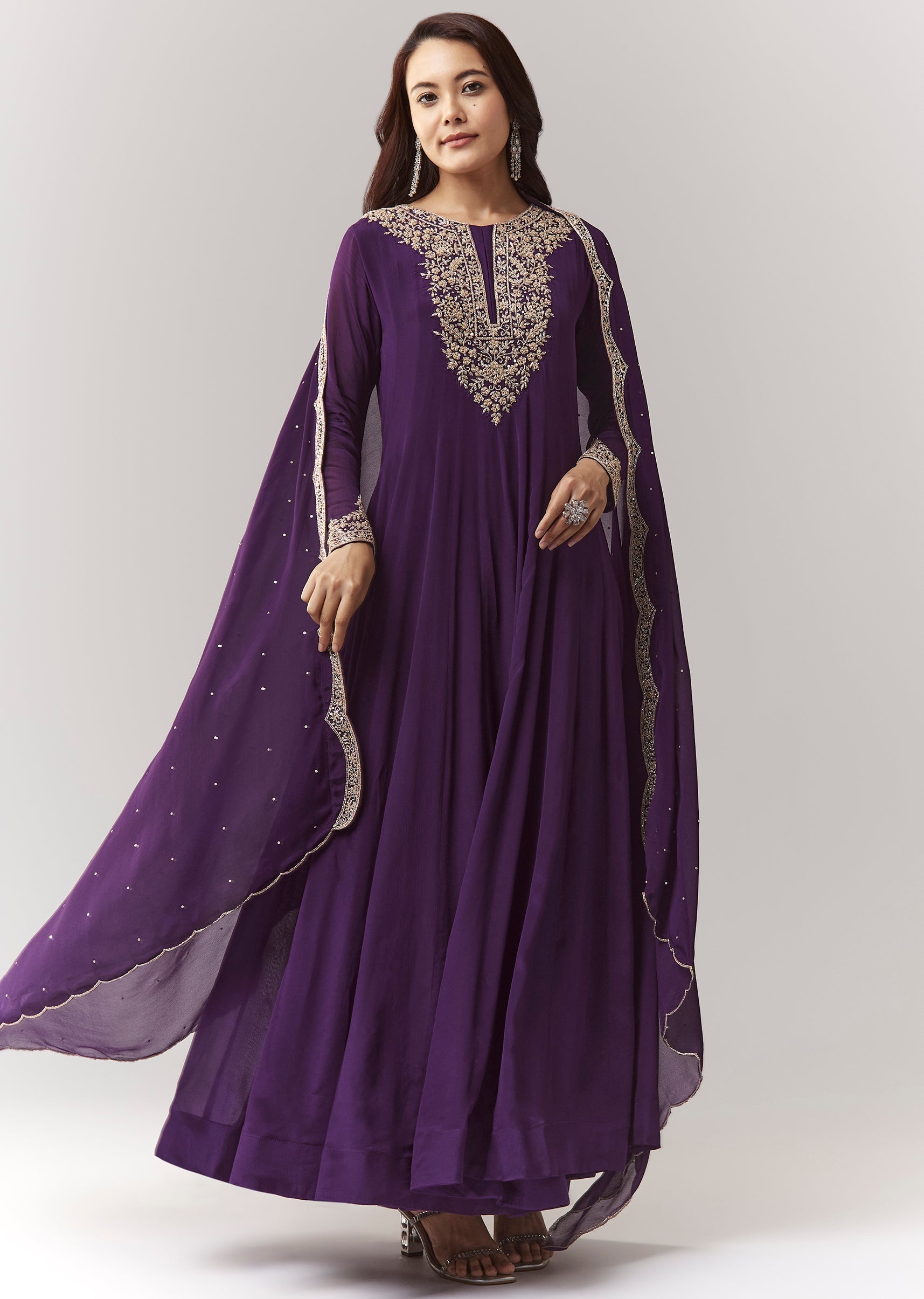 A classic purple A-line anarkali in chinon, highlighted with cut-dana work on the yoke and sleeves. Full sleeves, round neckline, and front hook-eye closure make it a clean, elegant pick... More Product Details