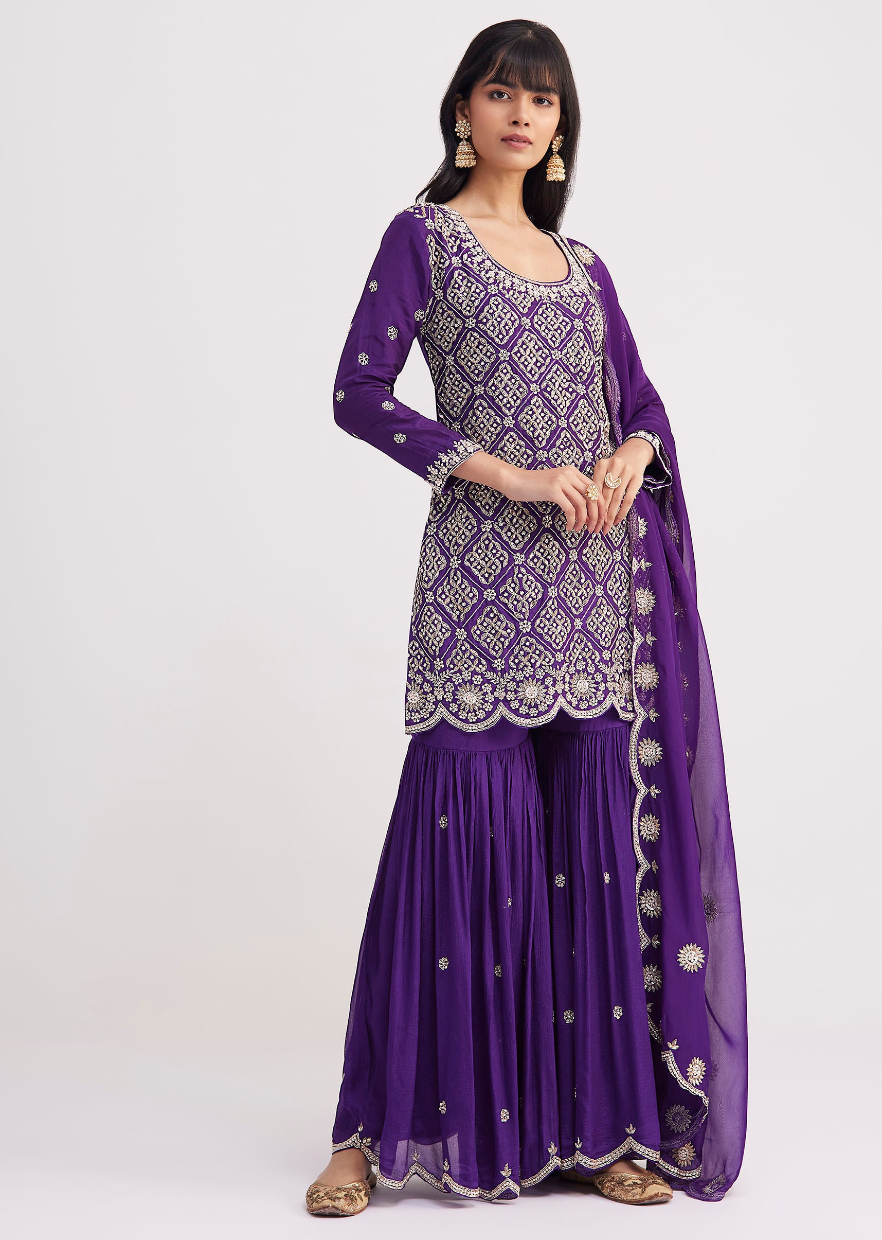 Purple Cutdana Embroidered Sharara Suit With Organza Dupatta