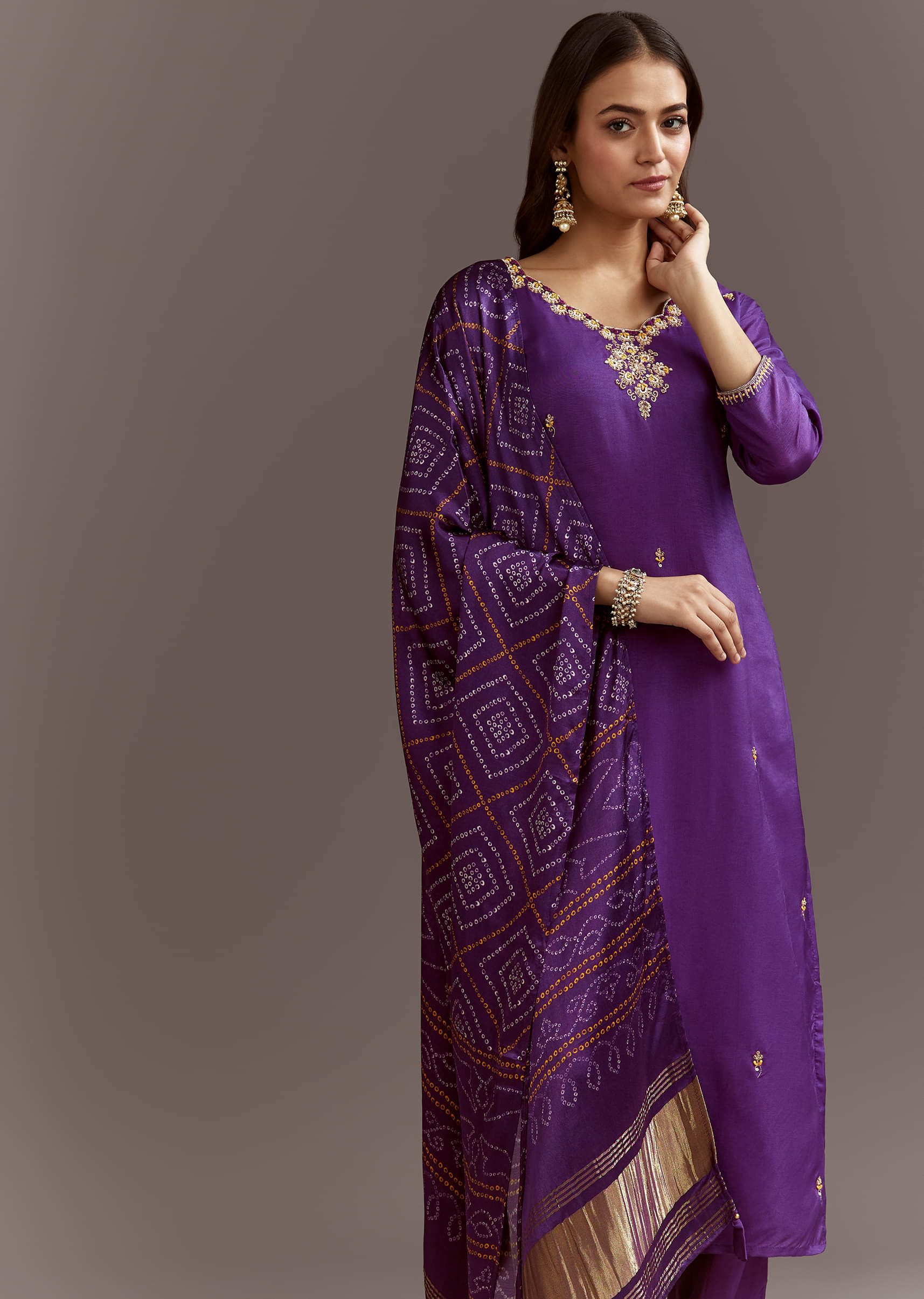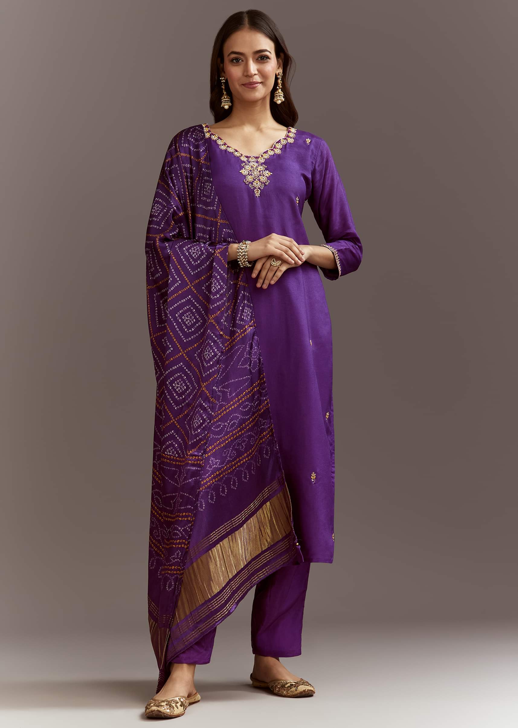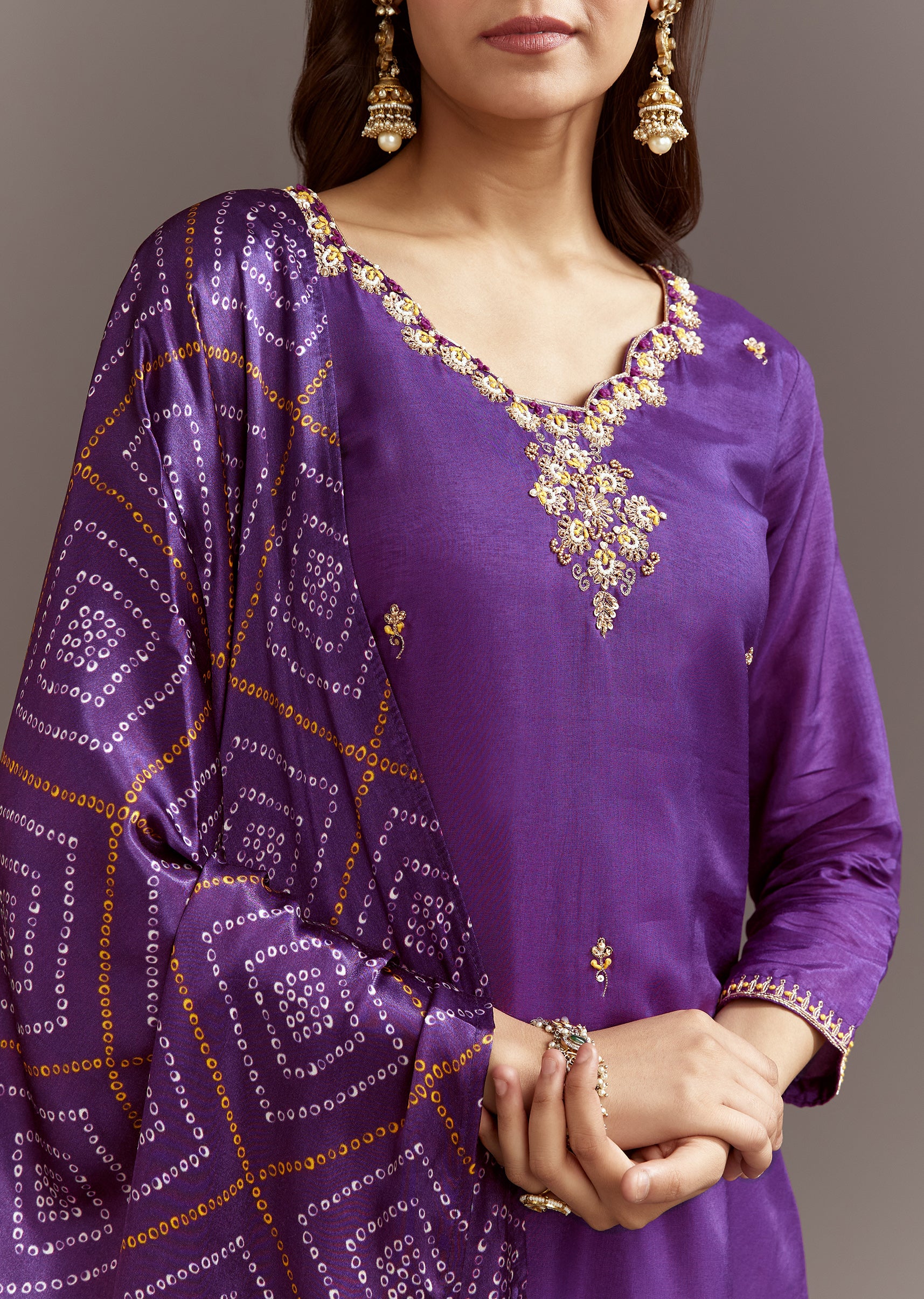 Purple Dola Silk Kurta Set With Bandhani Satin Dupatta
