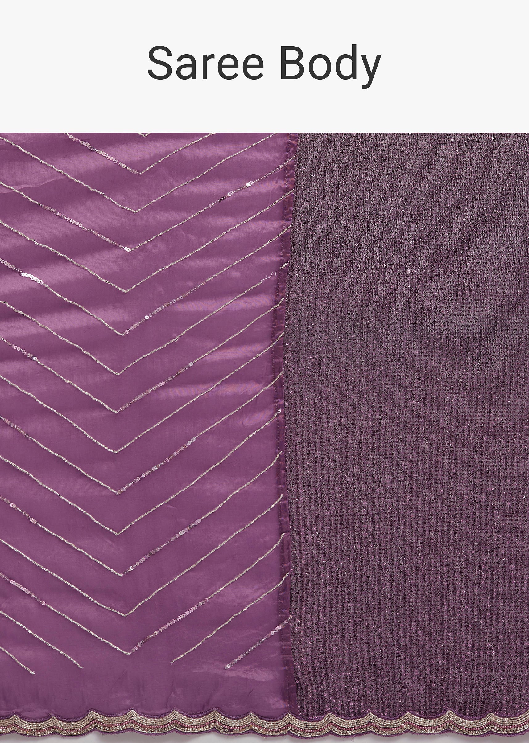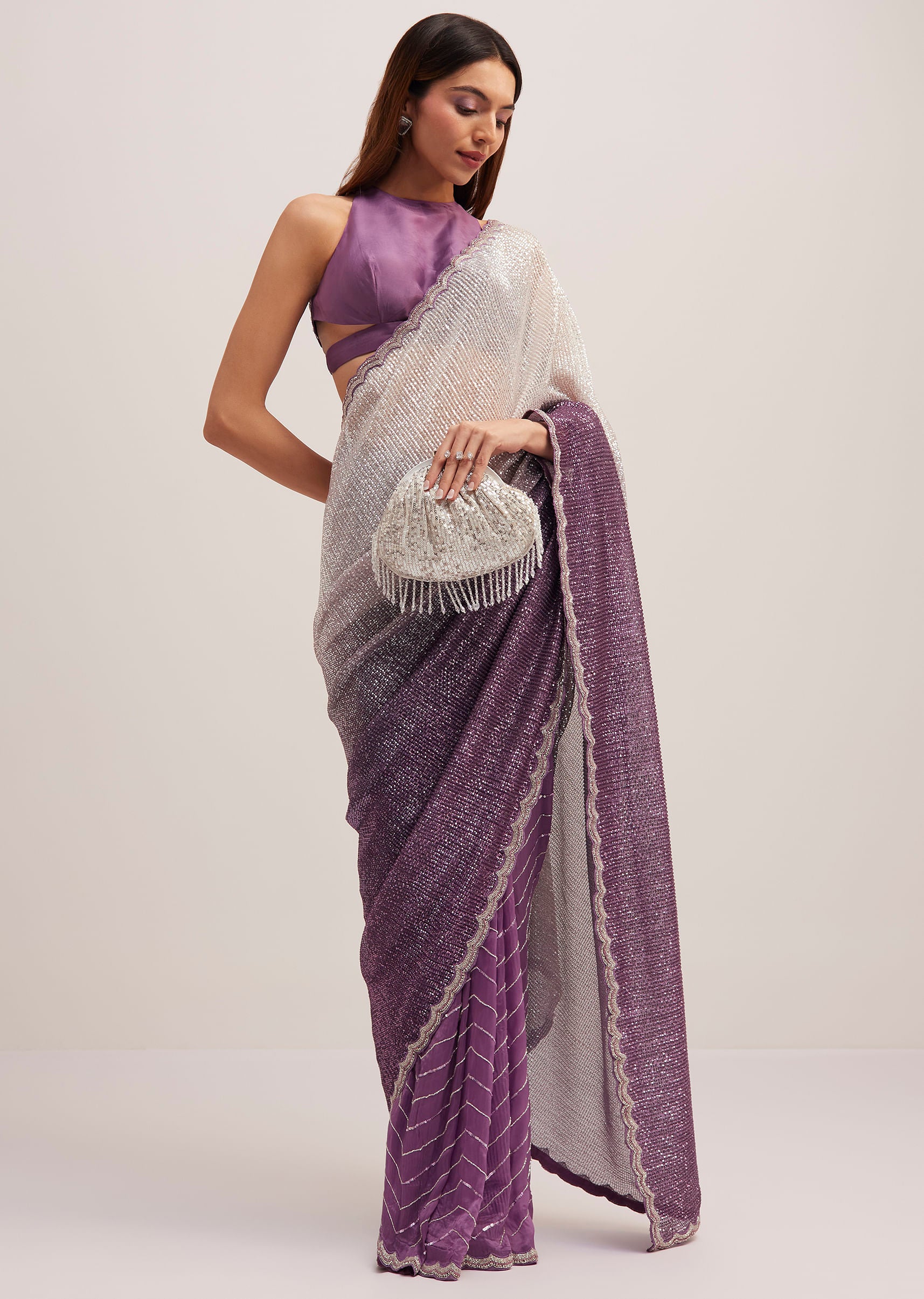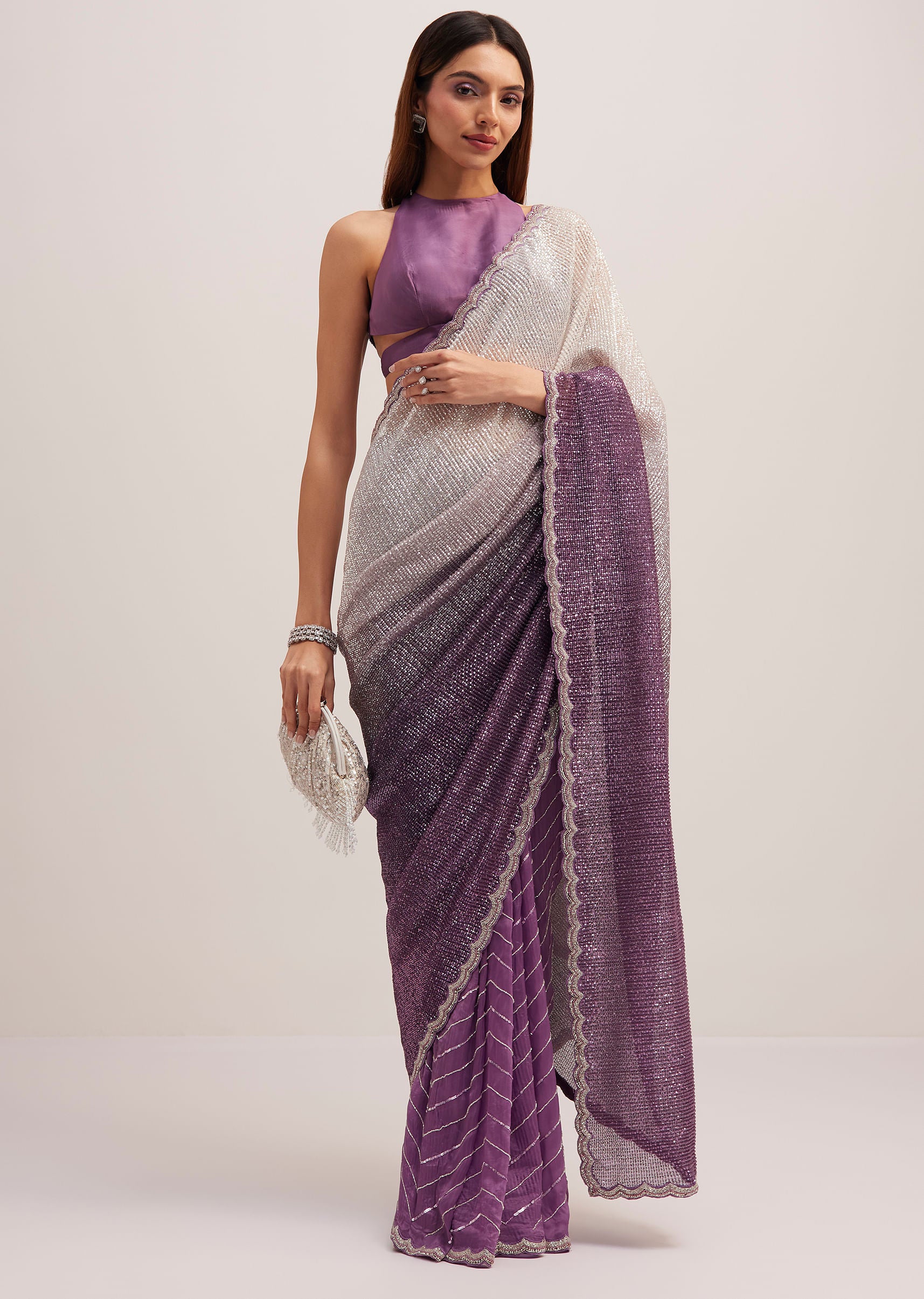 Drape yourself in elegance with this purple dual shaded half n half sequins embroidered saree, designed to make you stand out. The mesmerizing blend of dual shades and shimmering sequins makes it perfect for festive celebrations, cocktail parties, and glamorous receptions. Its lightweight fabric ensures effortless style and comfort throughout the event. Awarded as the Most Trusted Brand, we're delivering styles you love, just as promised.