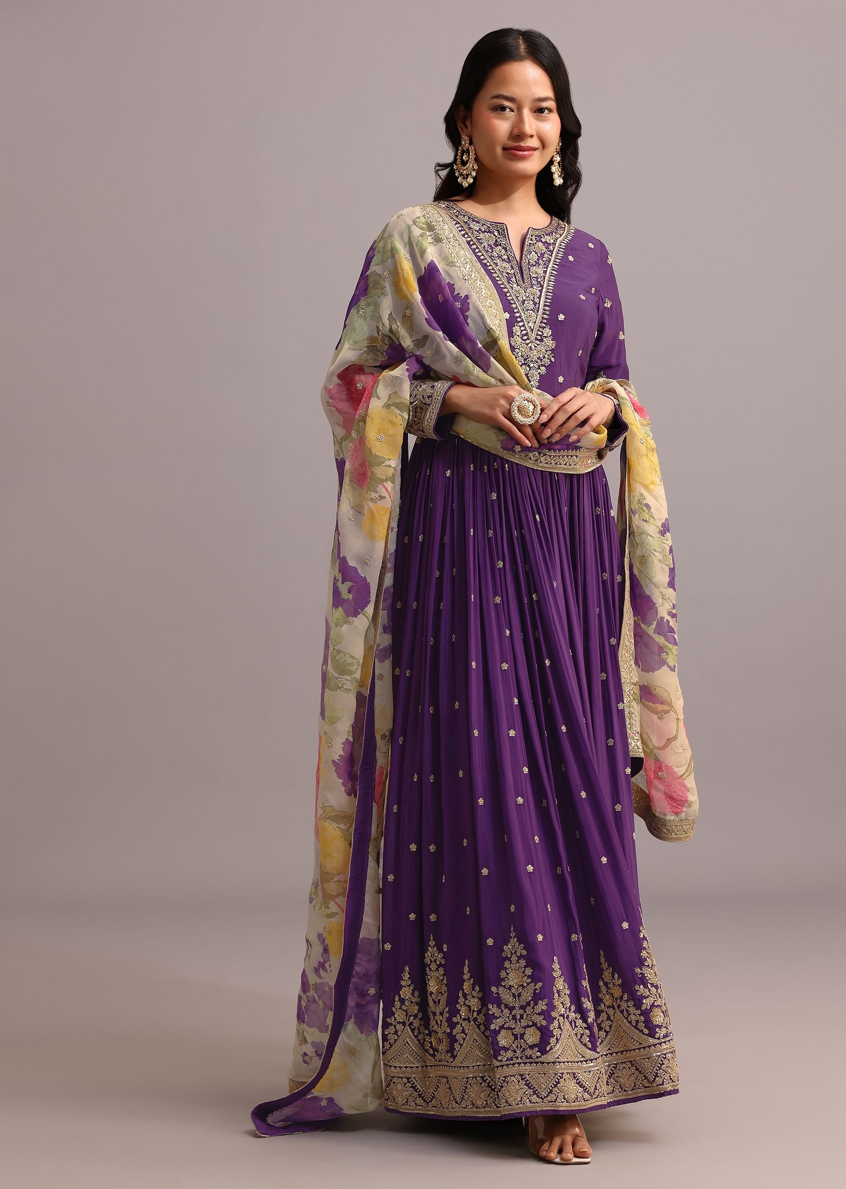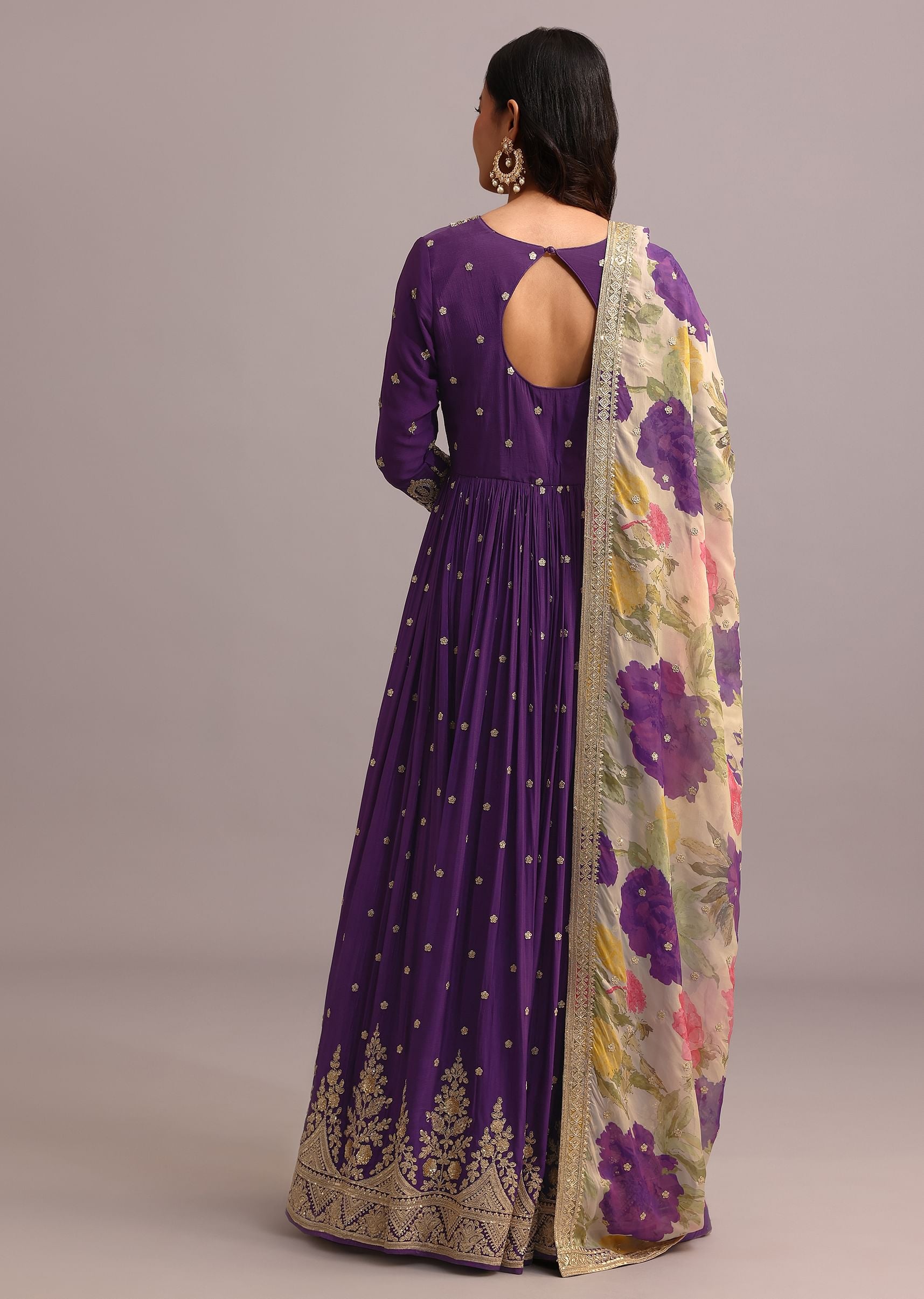 Purple Embroidered Anarkali With Floral Printed Organza Dupatta