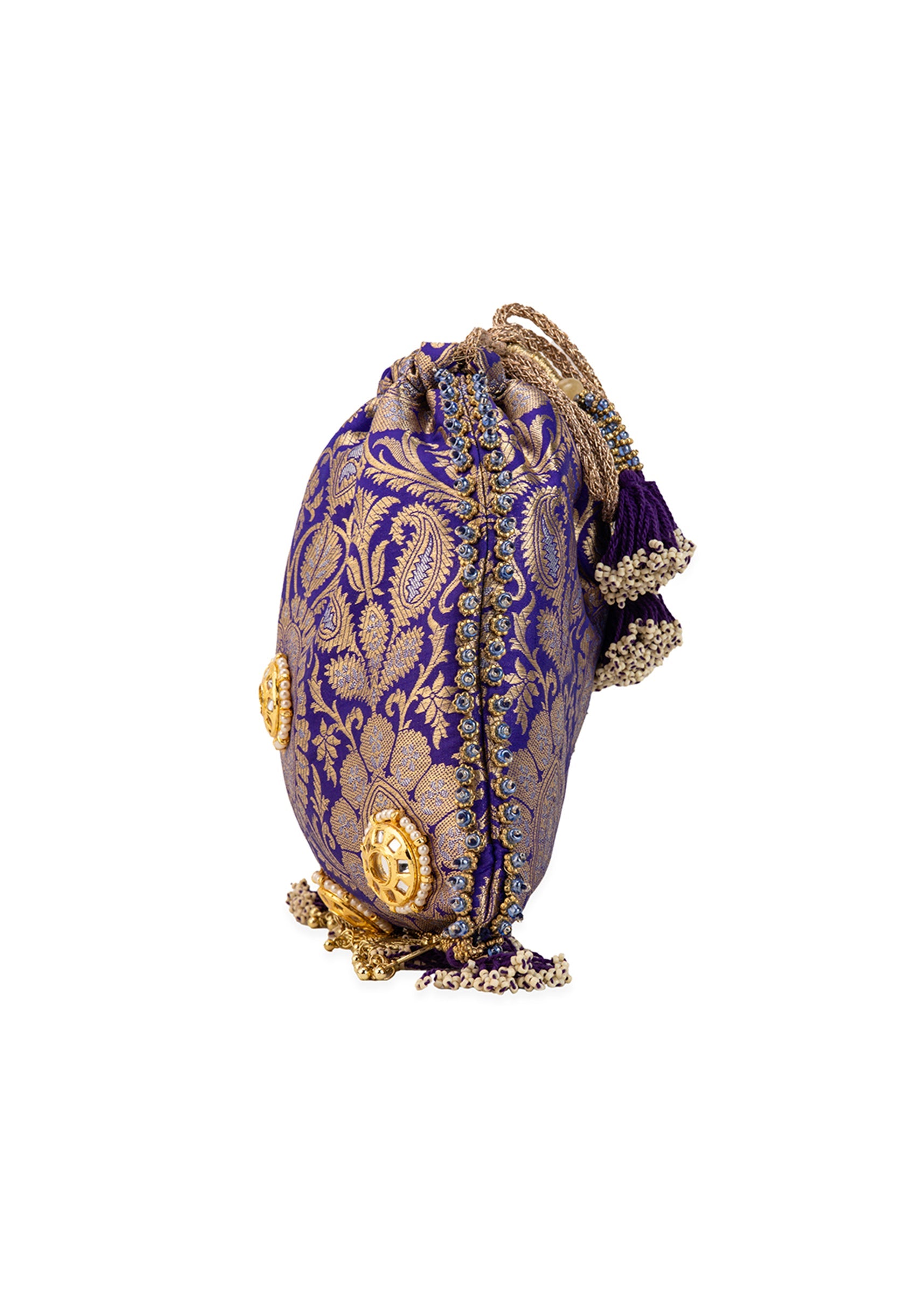 Add a touch of royal charm to your celebration look with this purple silk potli bag, woven with intricate golden floral motifs that radiate timeless elegance. Kundan accents, shimmering zari... More Product Details