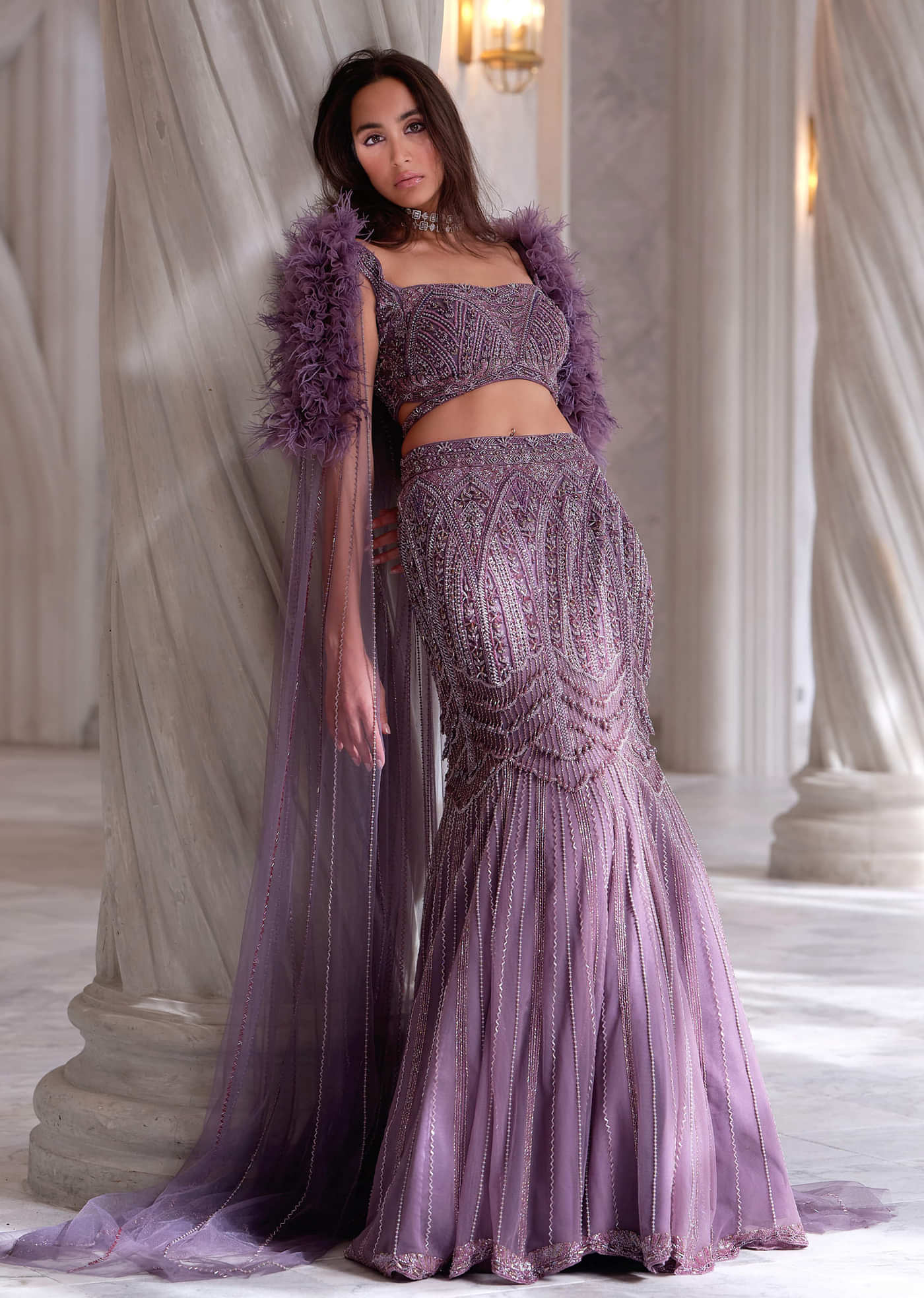 Runway romance takes shape as this mauve purple net bridal lehenga moves like poetry with the lehenga name woven gently in the middle. Self-hand embroidery with cutdana and beads defines... More Product Details