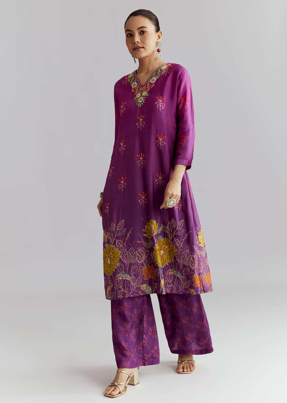 Purple Ombre Crepe Palazzo Suit With Floral Print