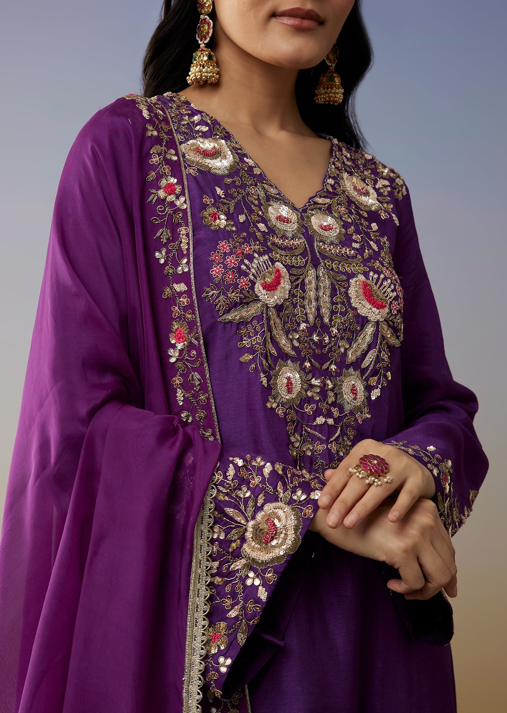 This purple palazzo suit brings a striking color pop with its ombre dupatta series design crafted for mehendi sangeet and wedding celebrations. The straight style kurta features intricate zardosi and... More Product Details