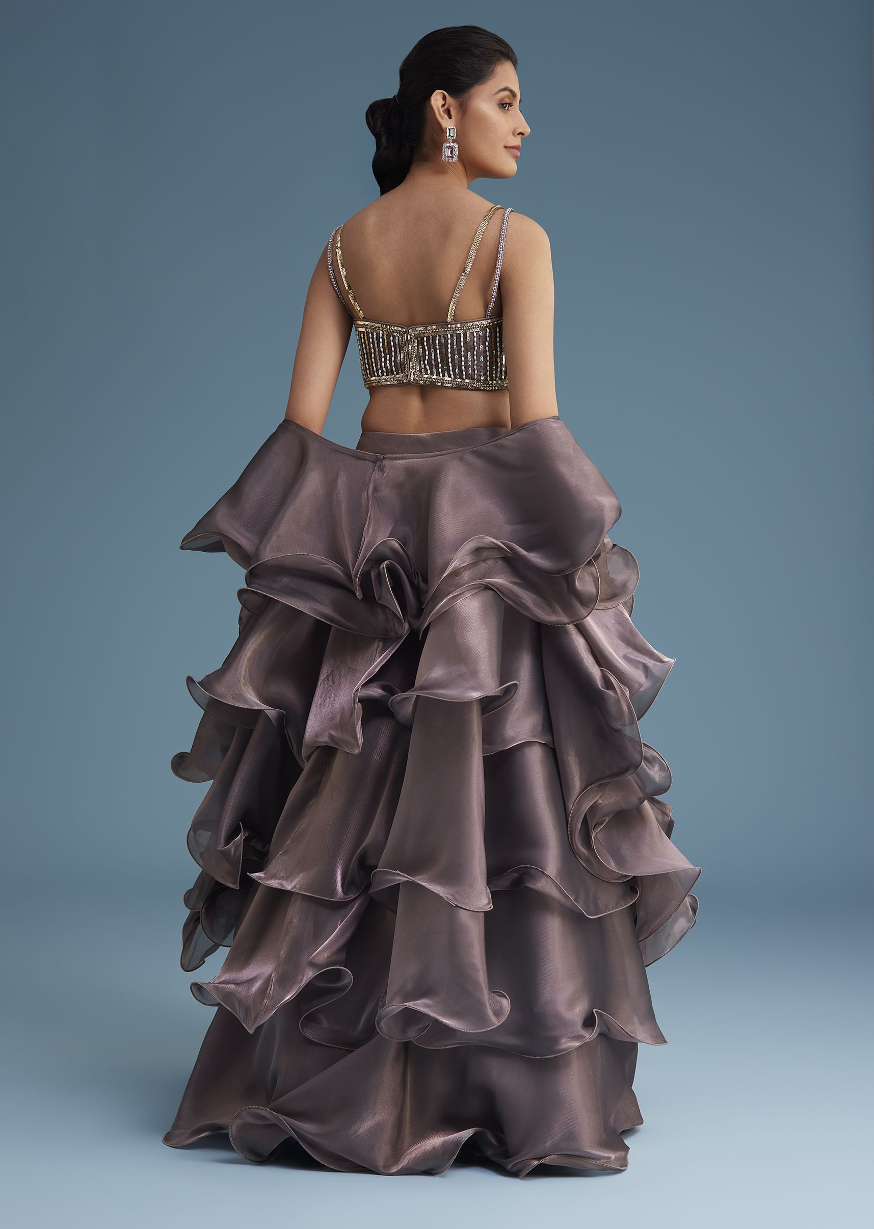 Purple Organza Ruffle Lehenga Set With Embellished Blouse