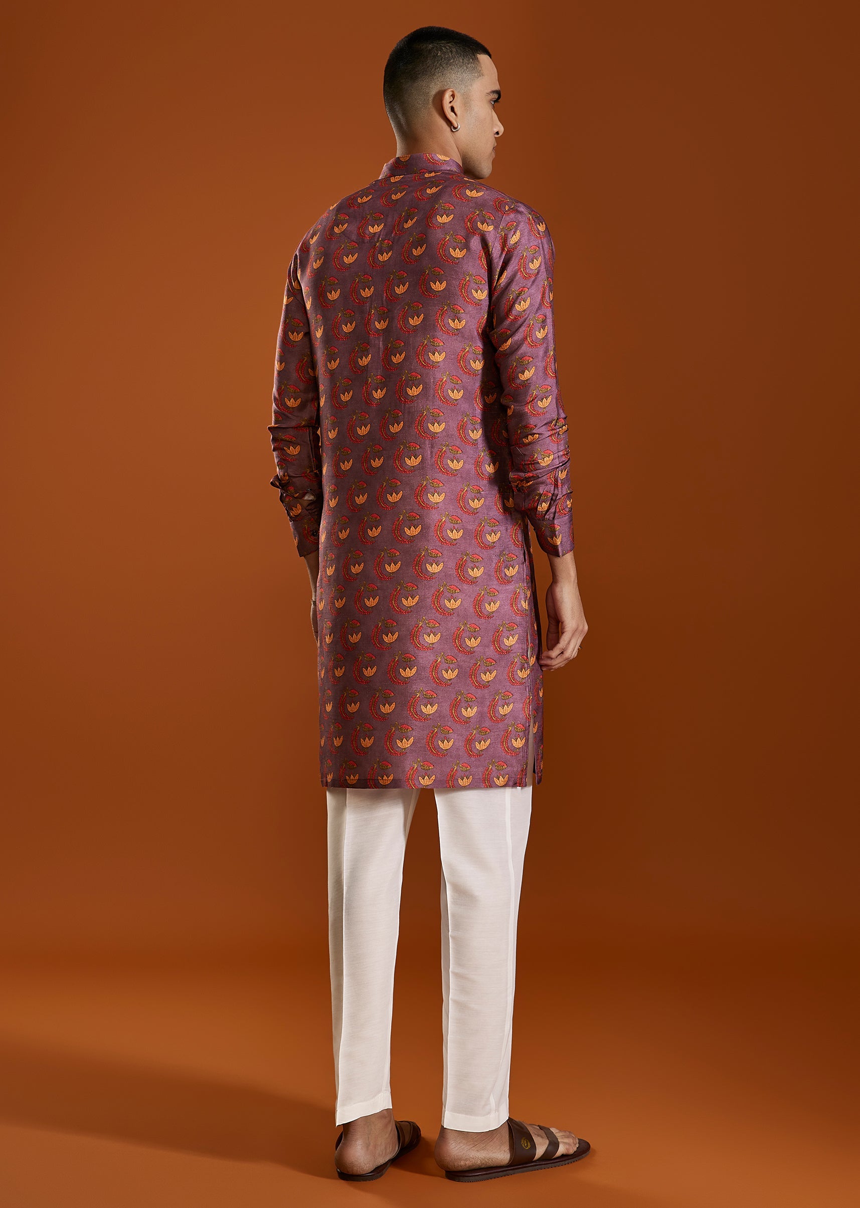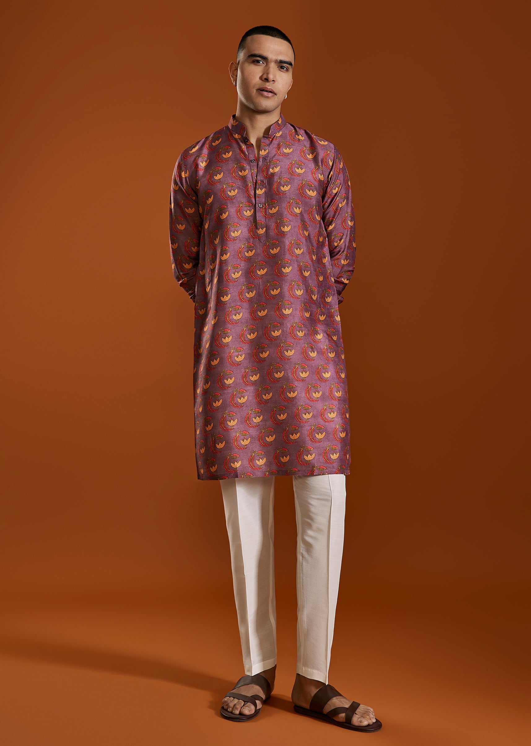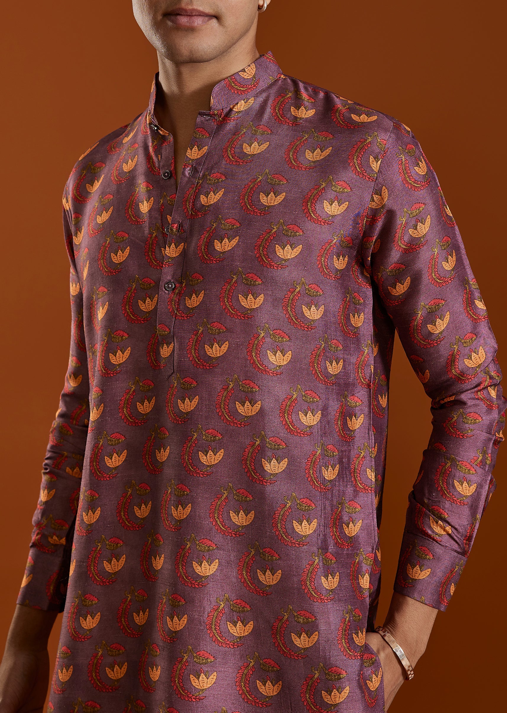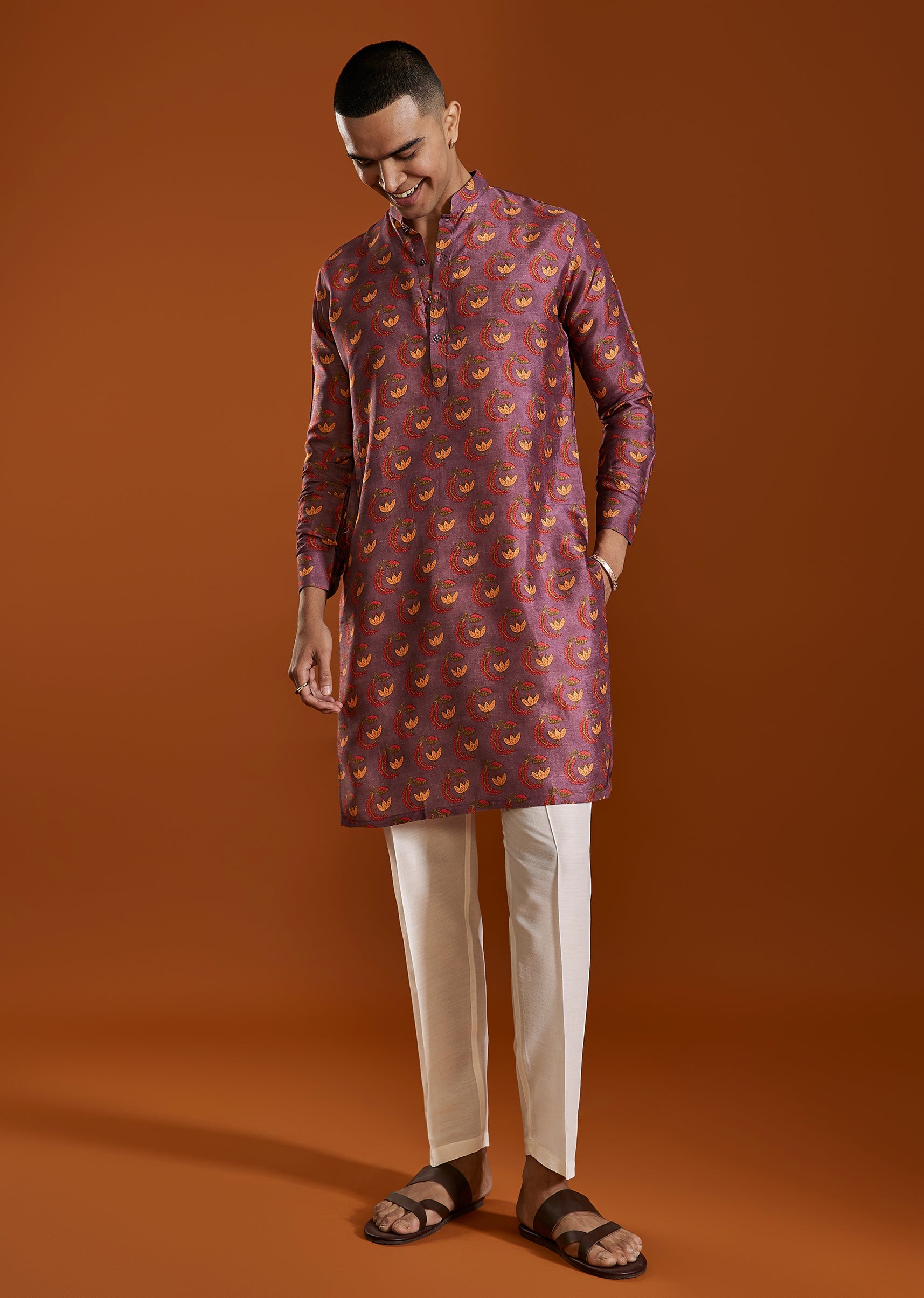 A rich purple printed art silk kurta featuring a classic mandarin collar and front button placket—perfect for adding effortless elegance to festive gatherings and traditional celebrations. Lightweight with a subtle... More Product Details