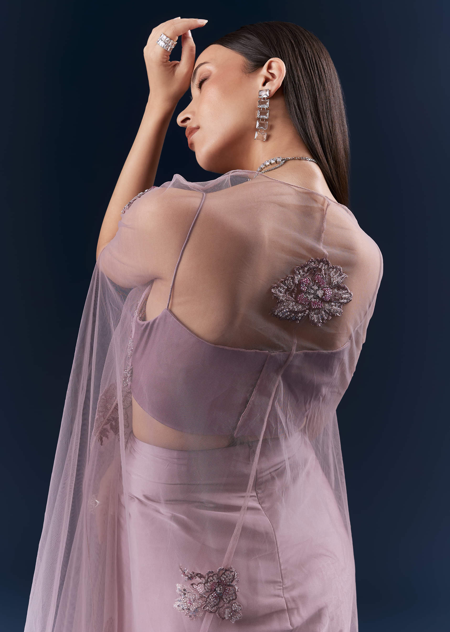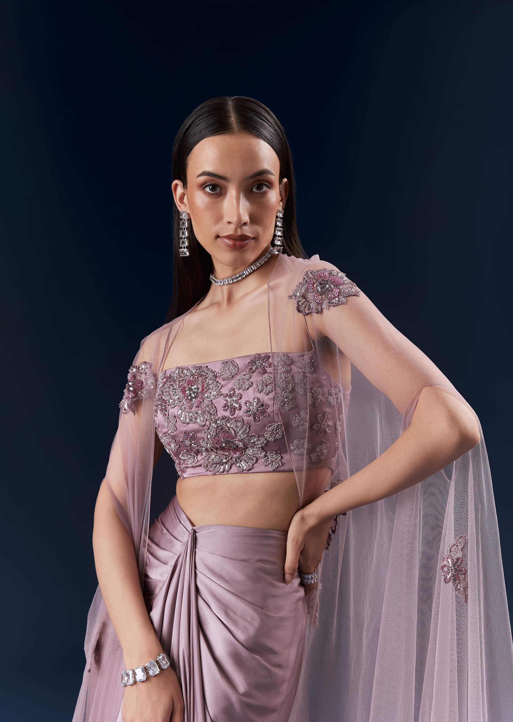 When colour needs a couture edge, this purple satin crop top and drape skirt set pairs a lavender embroidered blouse with a sculpted drape skirt and a soft cape for... More Product Details