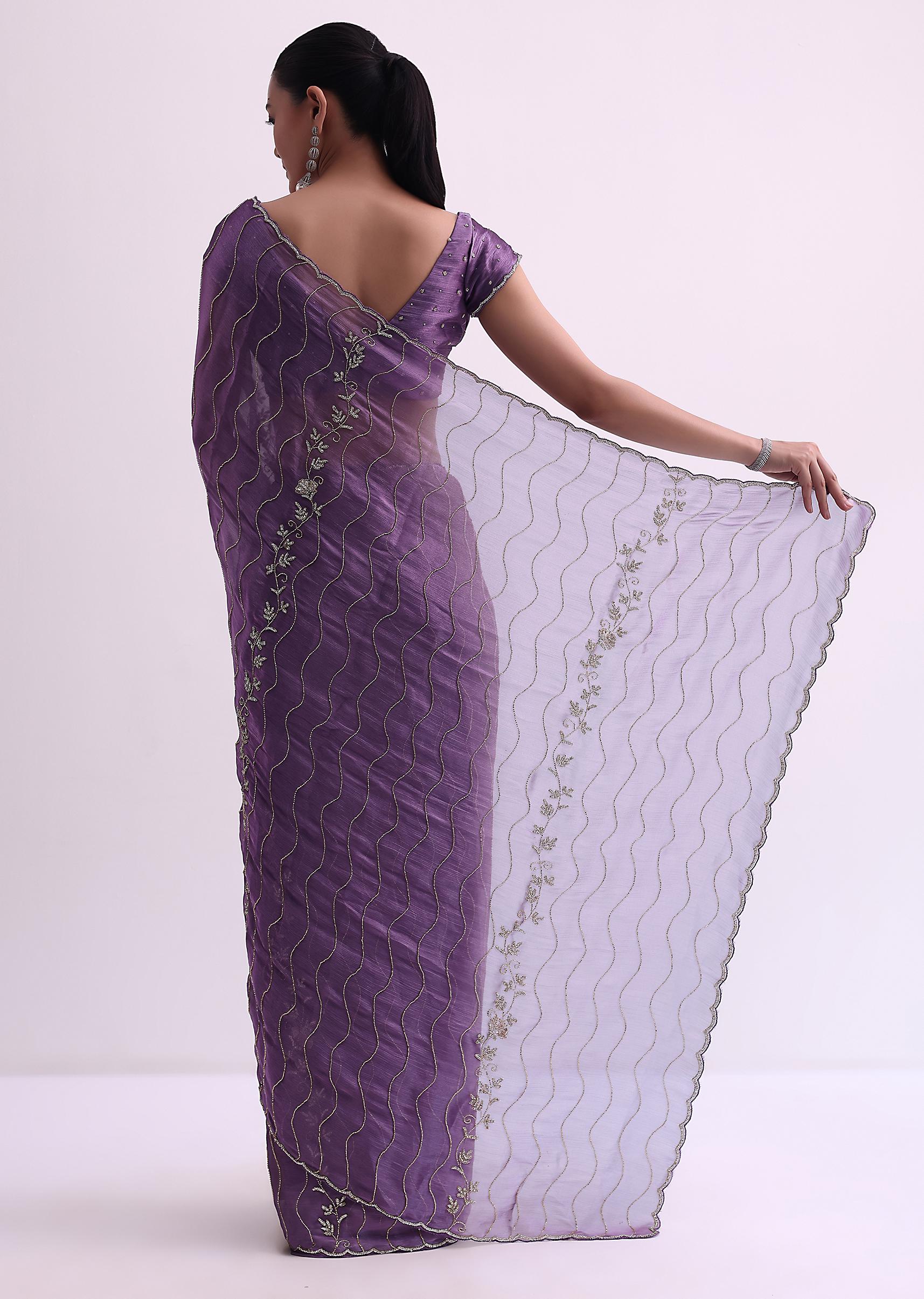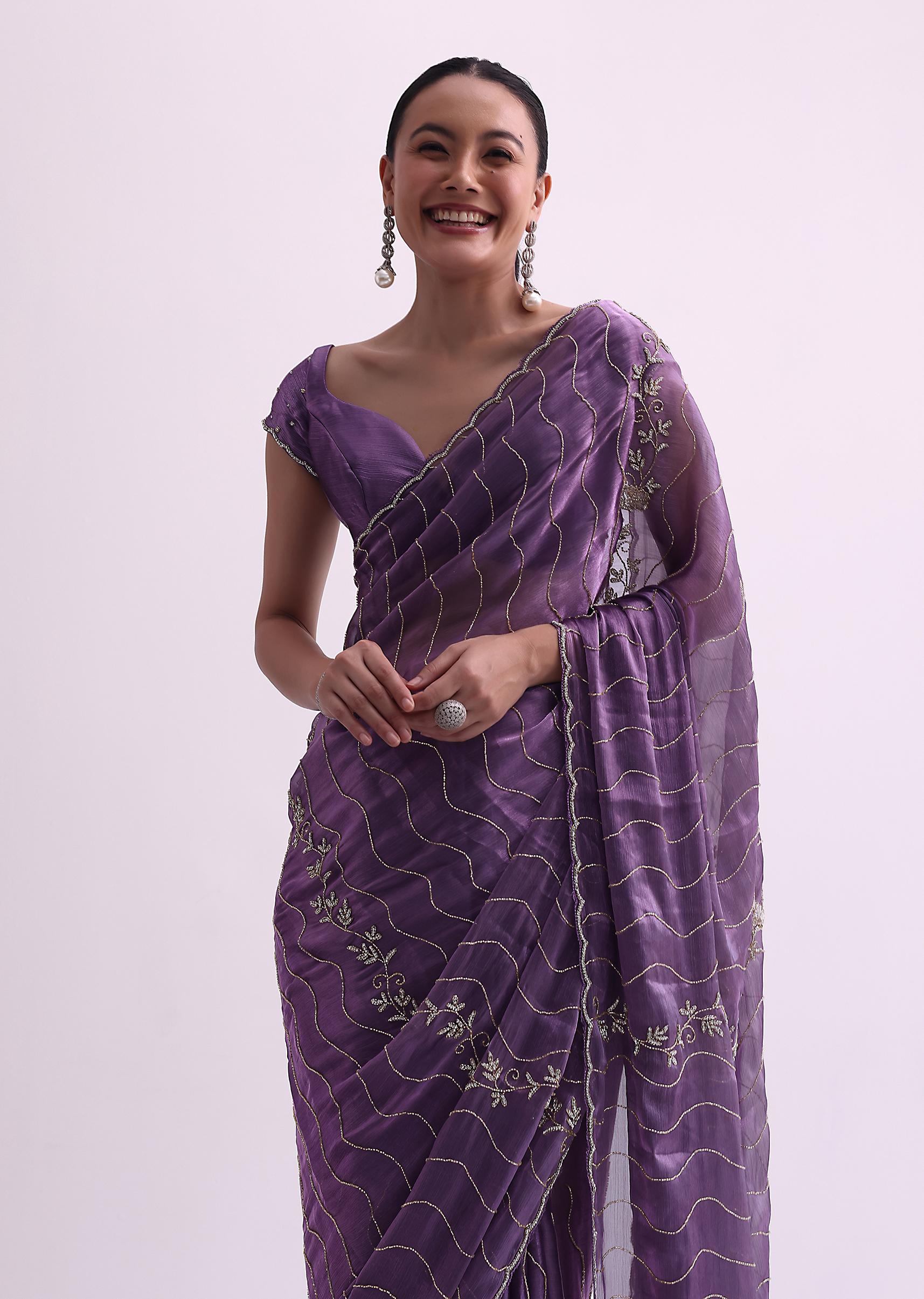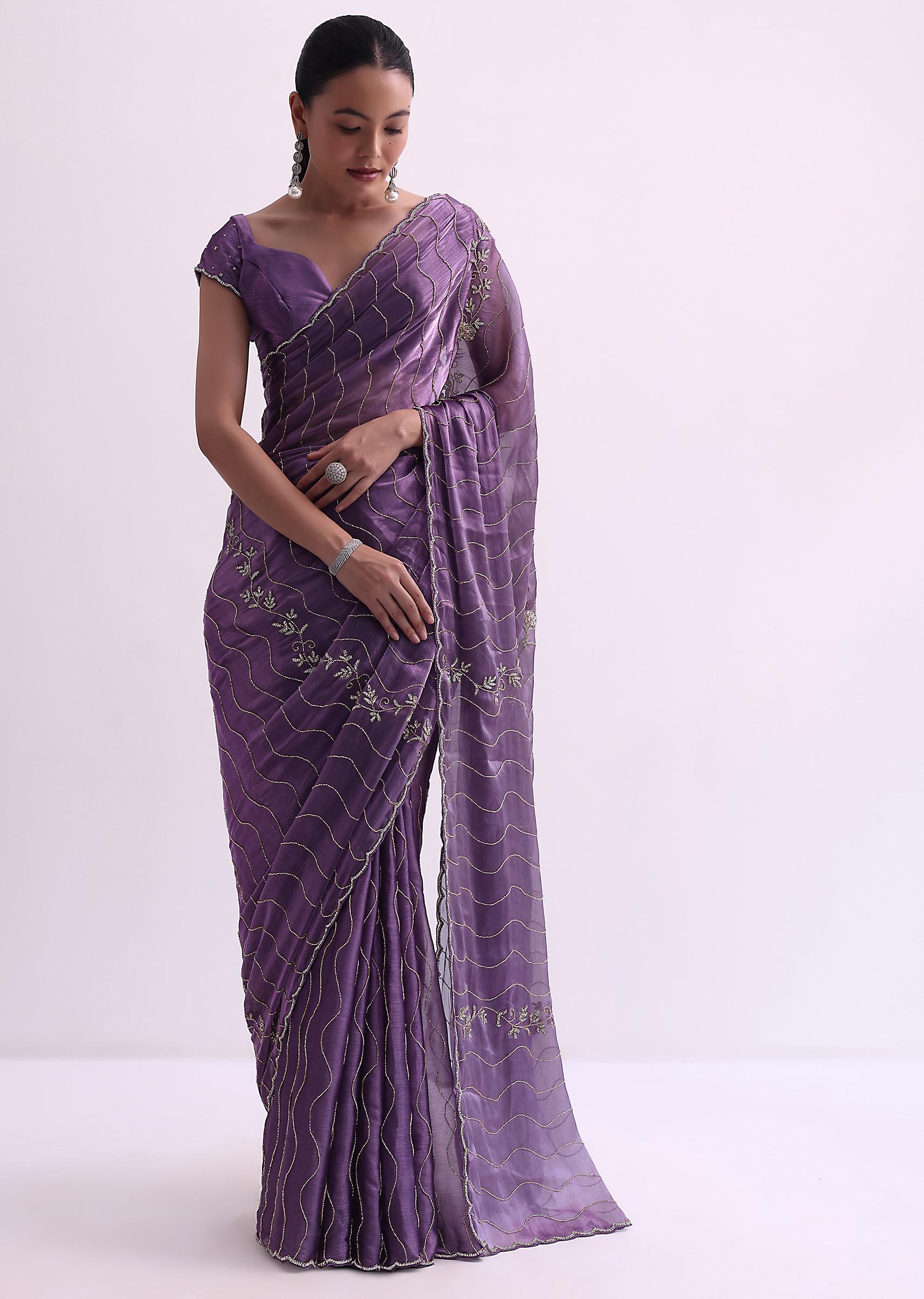 Purple Satin Saree With Cutdana Embellishment And Unstitched Blouse Fabric