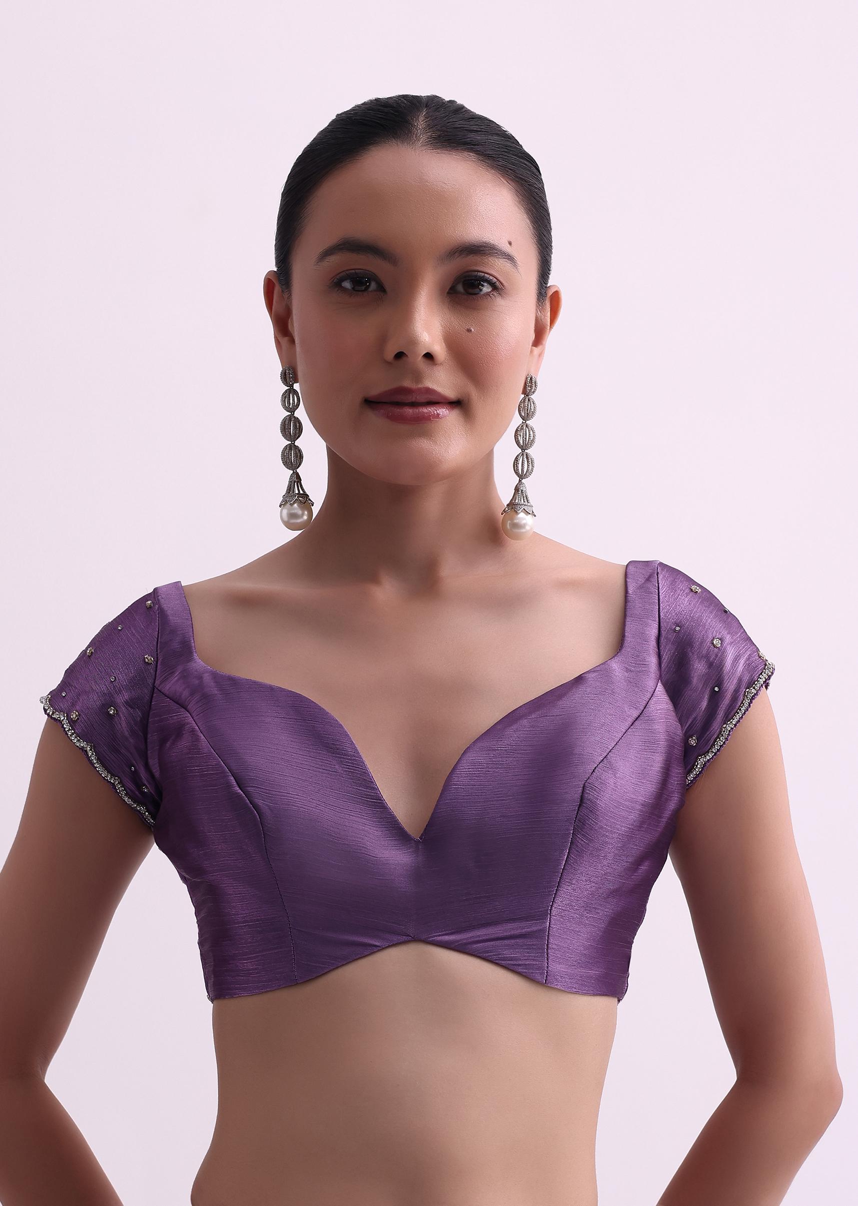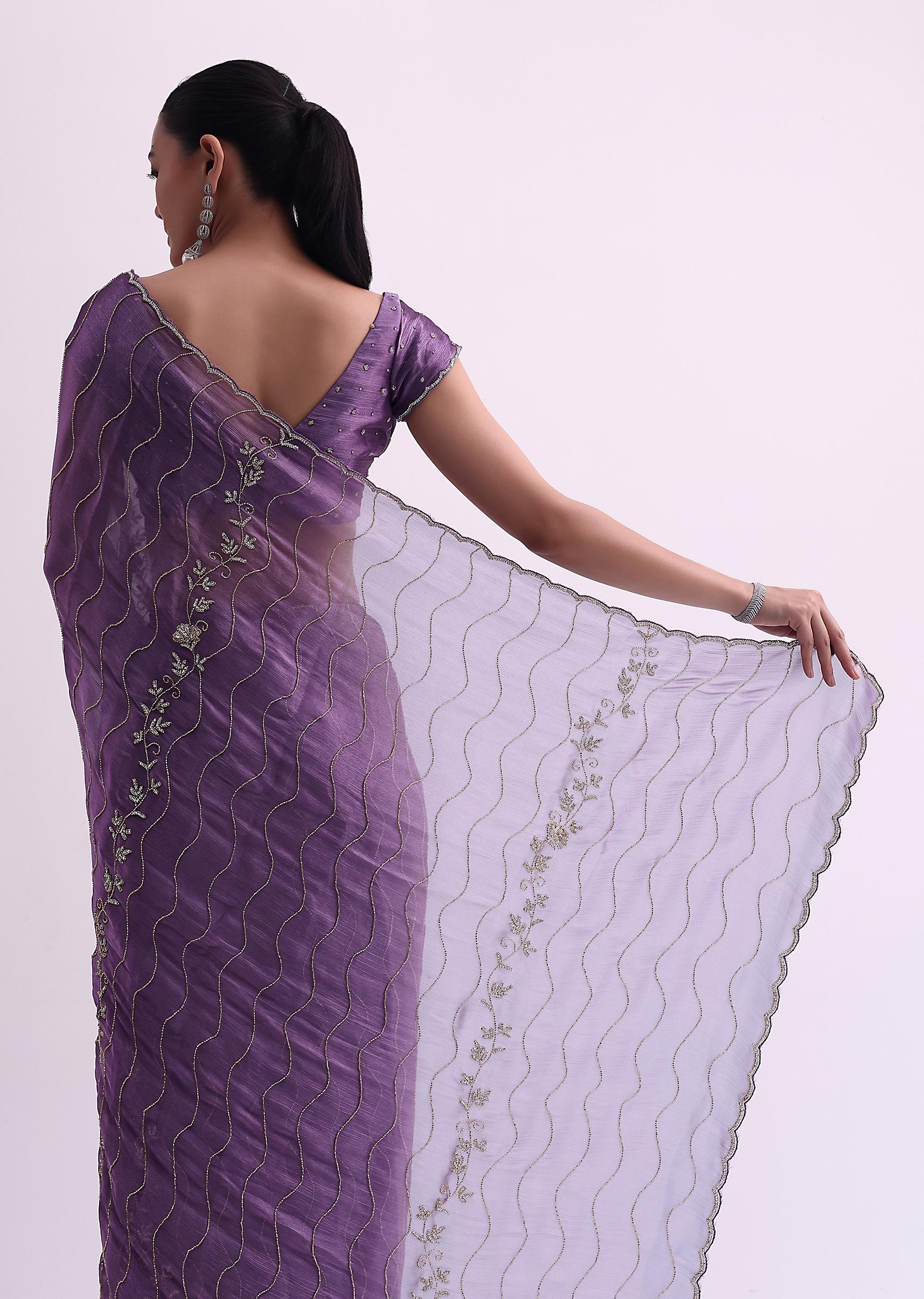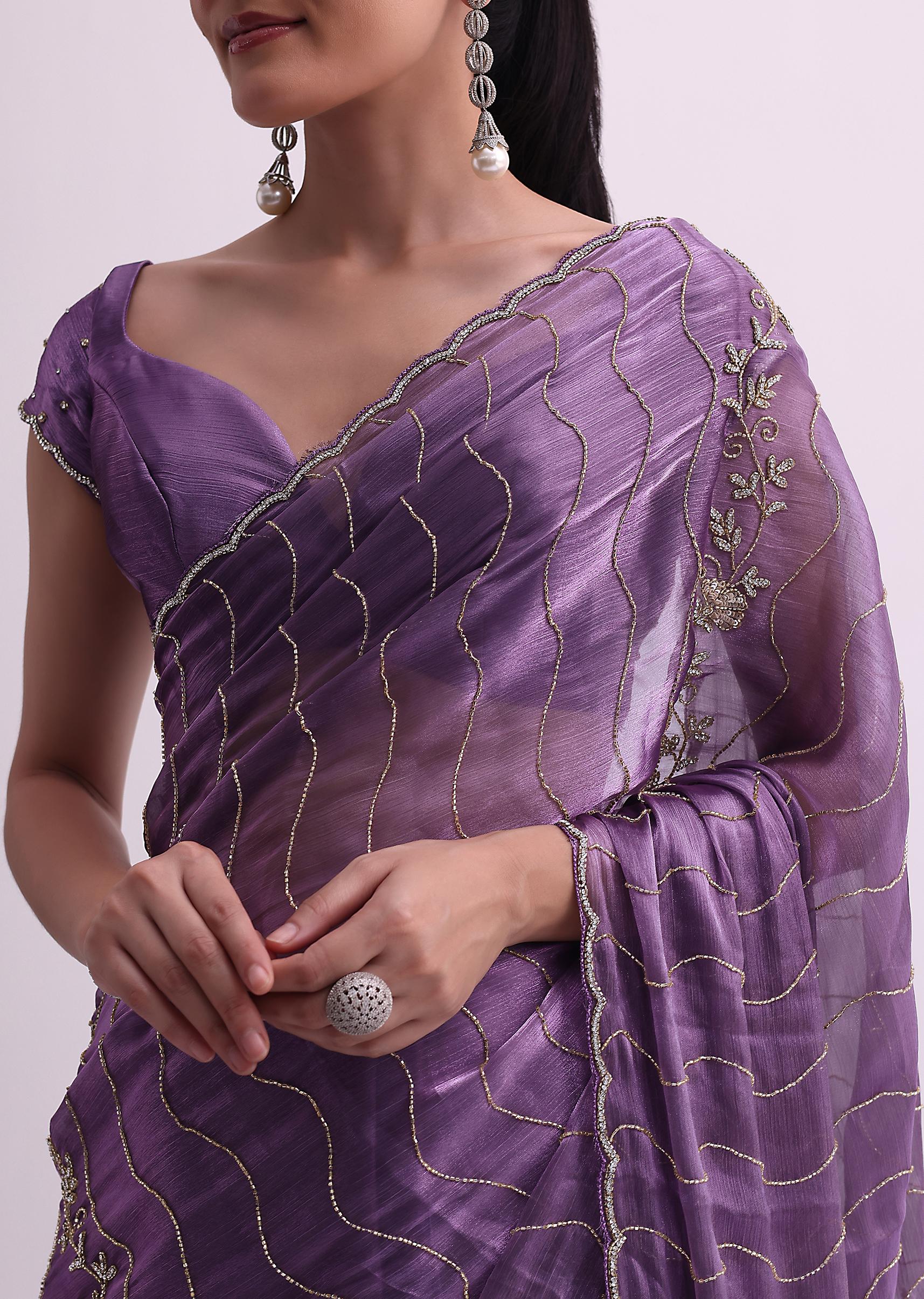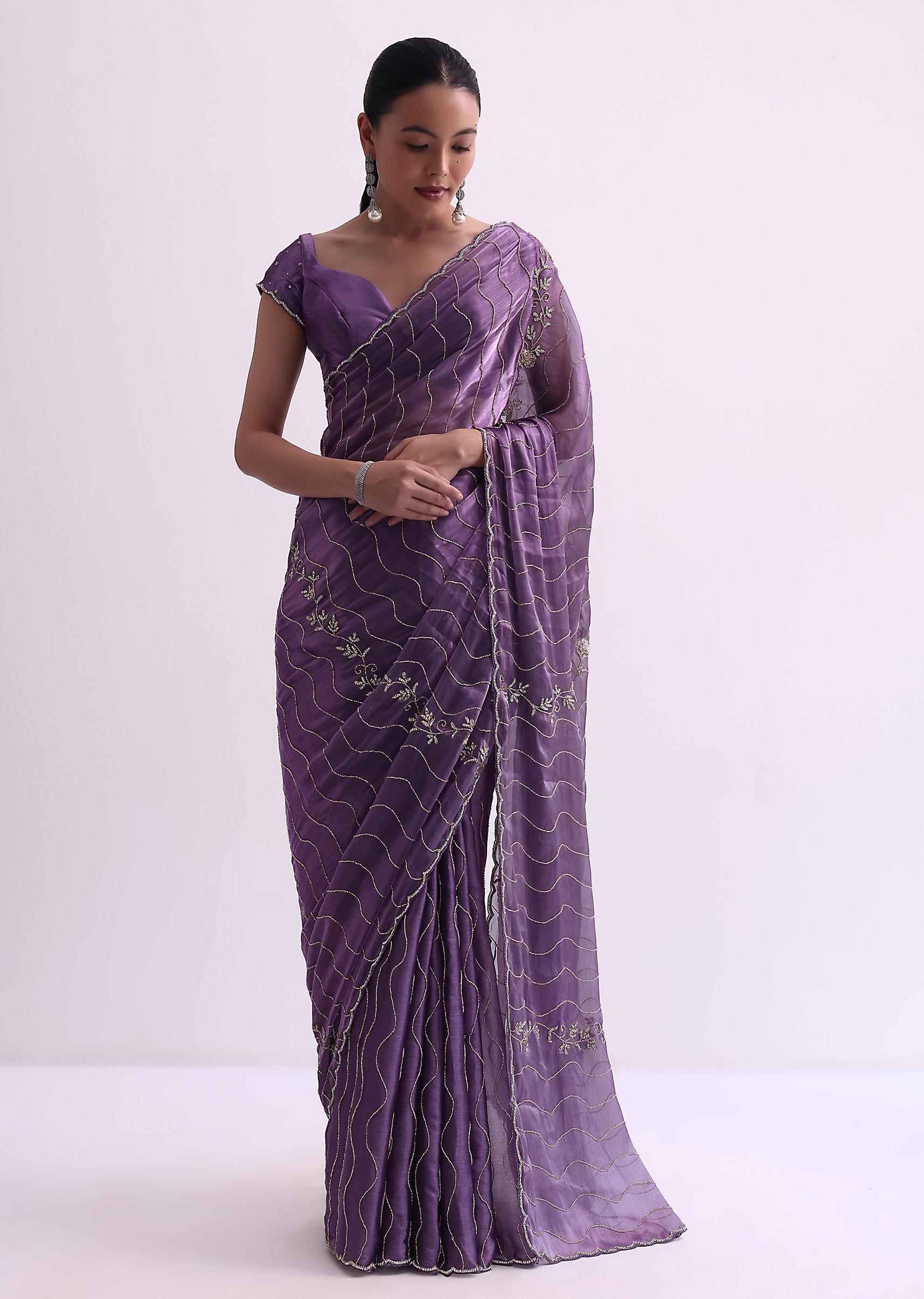 Purple Satin Saree With Cutdana Embellishment And Unstitched Blouse Fabric