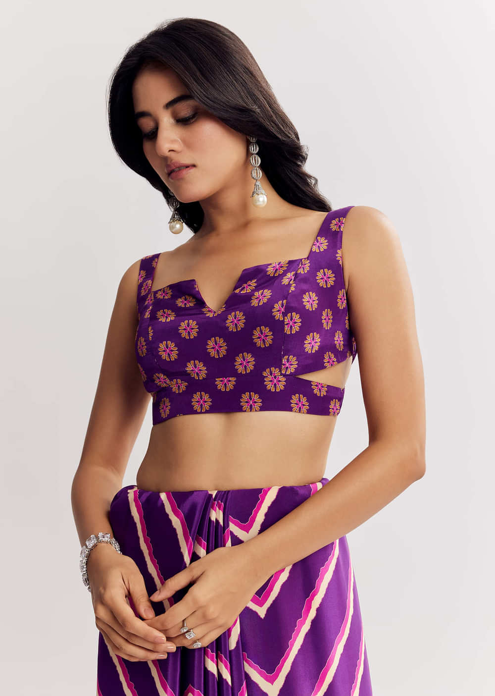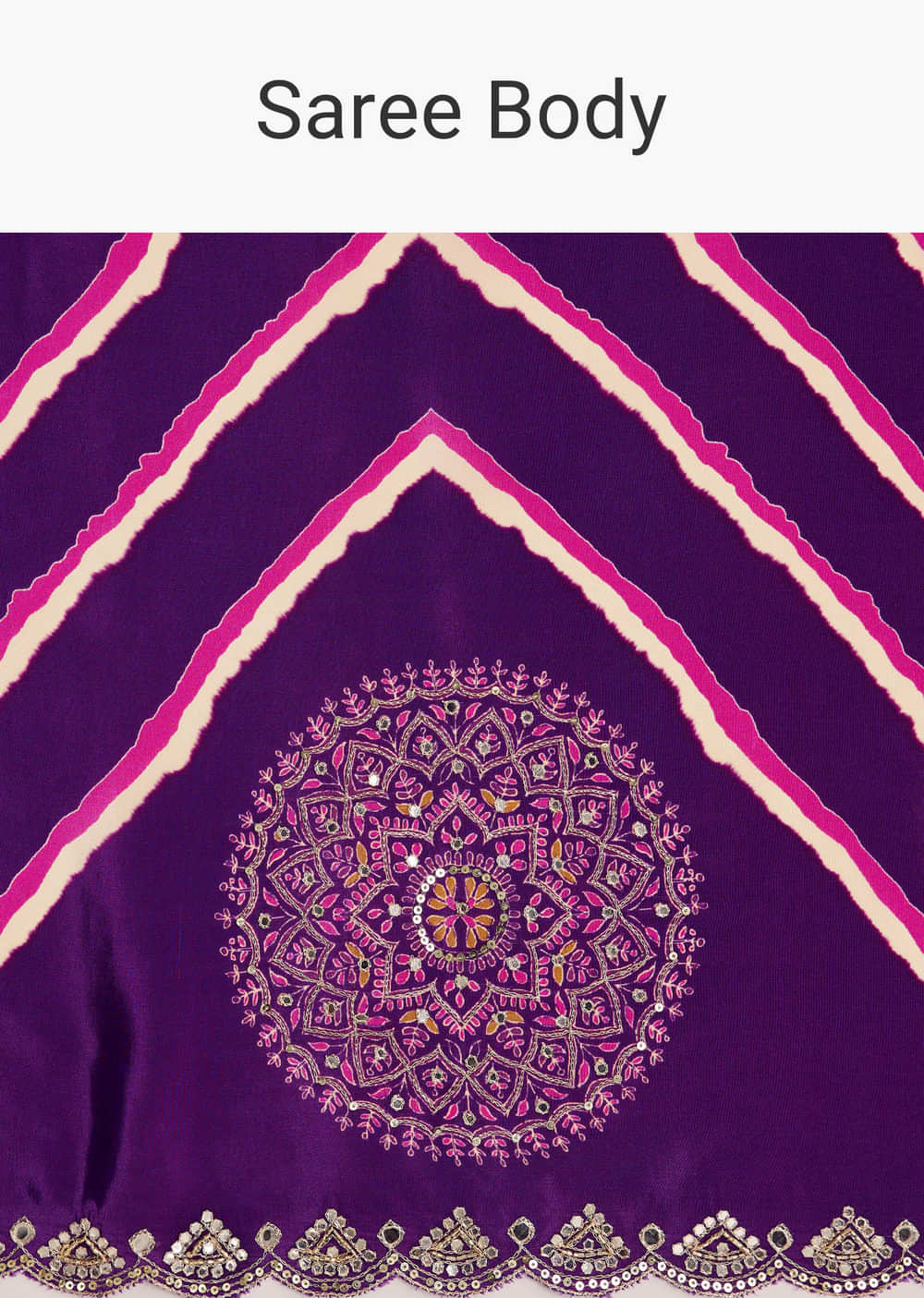 A royal purple satin saree designed with a scalloped edge, adorned with mirror and gota embroidery—ideal for sparkling occasions. Awarded as the Most Trusted Brand, we're delivering styles you love, just as promised.