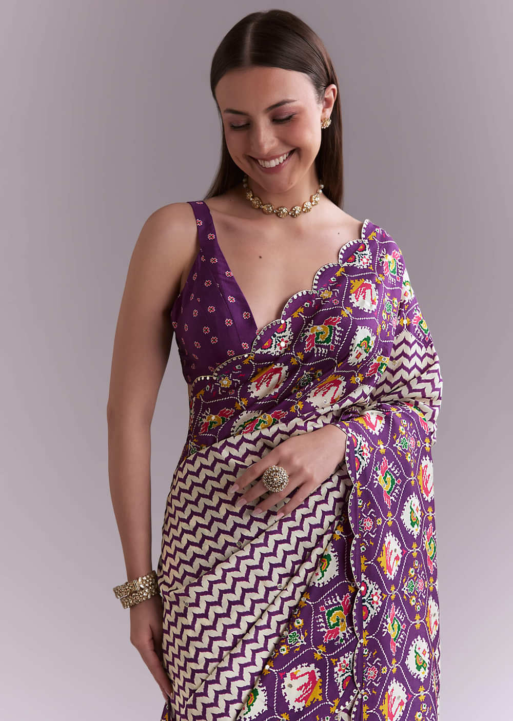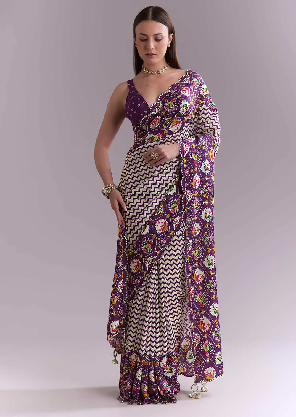 Purple Satin Saree With Ikat Print And Nature Motifs