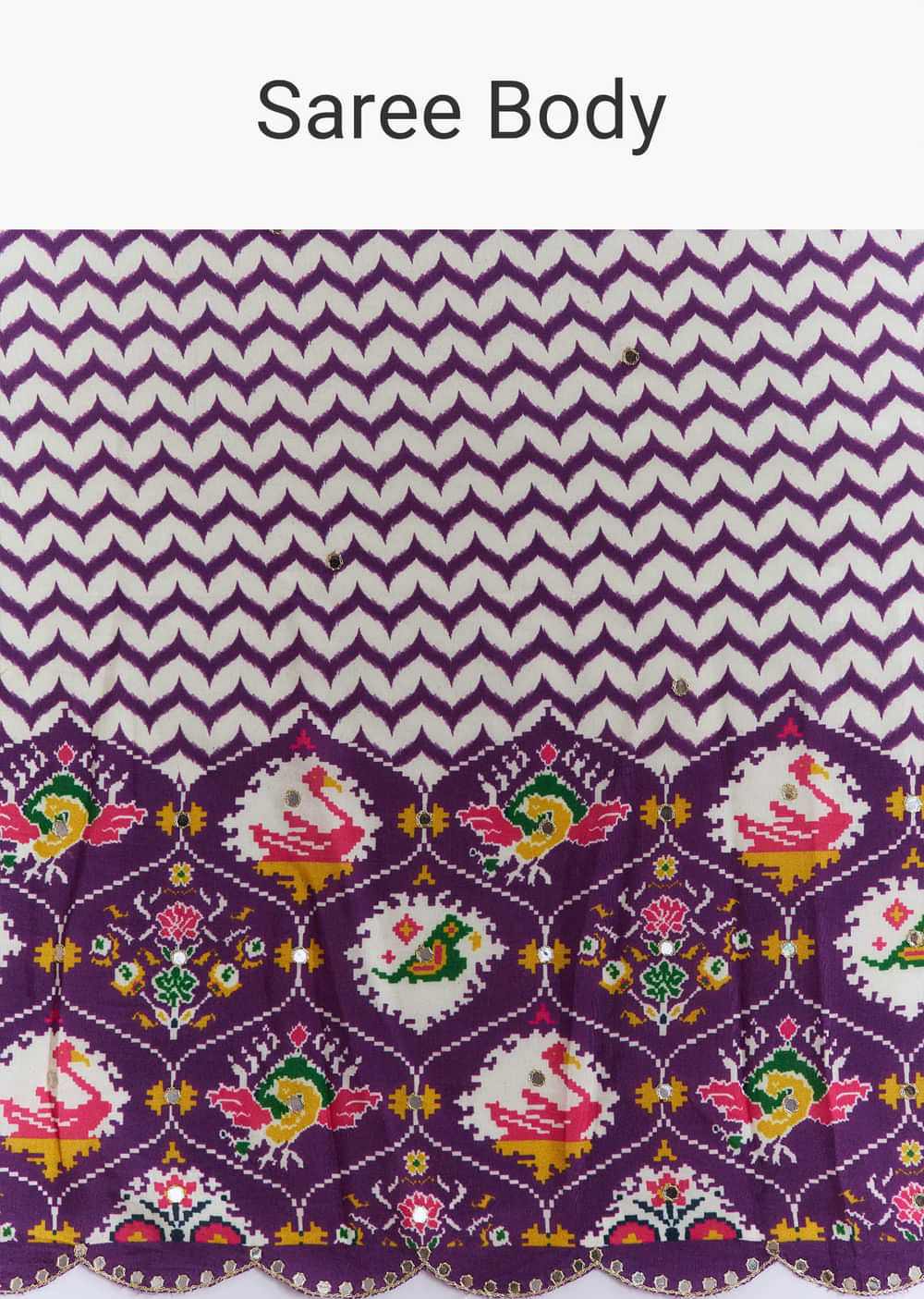 If your style leans towards something modern, with a playful edge, this purple satin printed saree lands that balance instantly. An off-white base sets up the contrast with ikat print while the border runs with floral and bird motifs. You feel fresh, festive and Navratri-ready without overthinking accessories. Awarded as the Most Trusted Brand, we're delivering styles you love, just as promised.