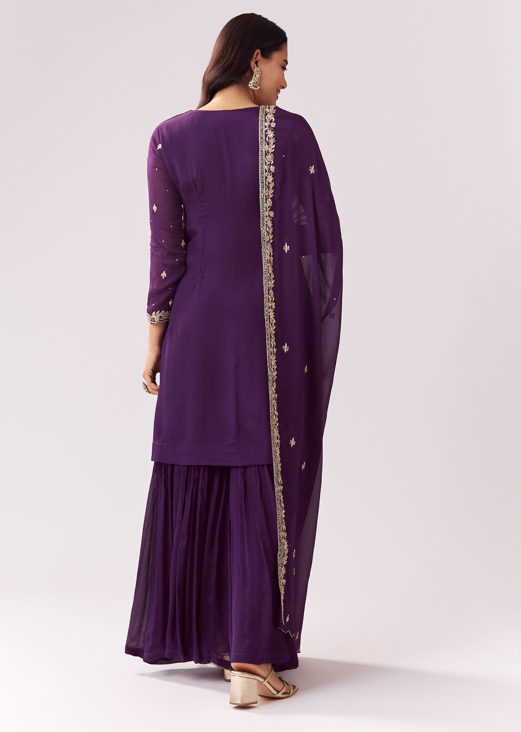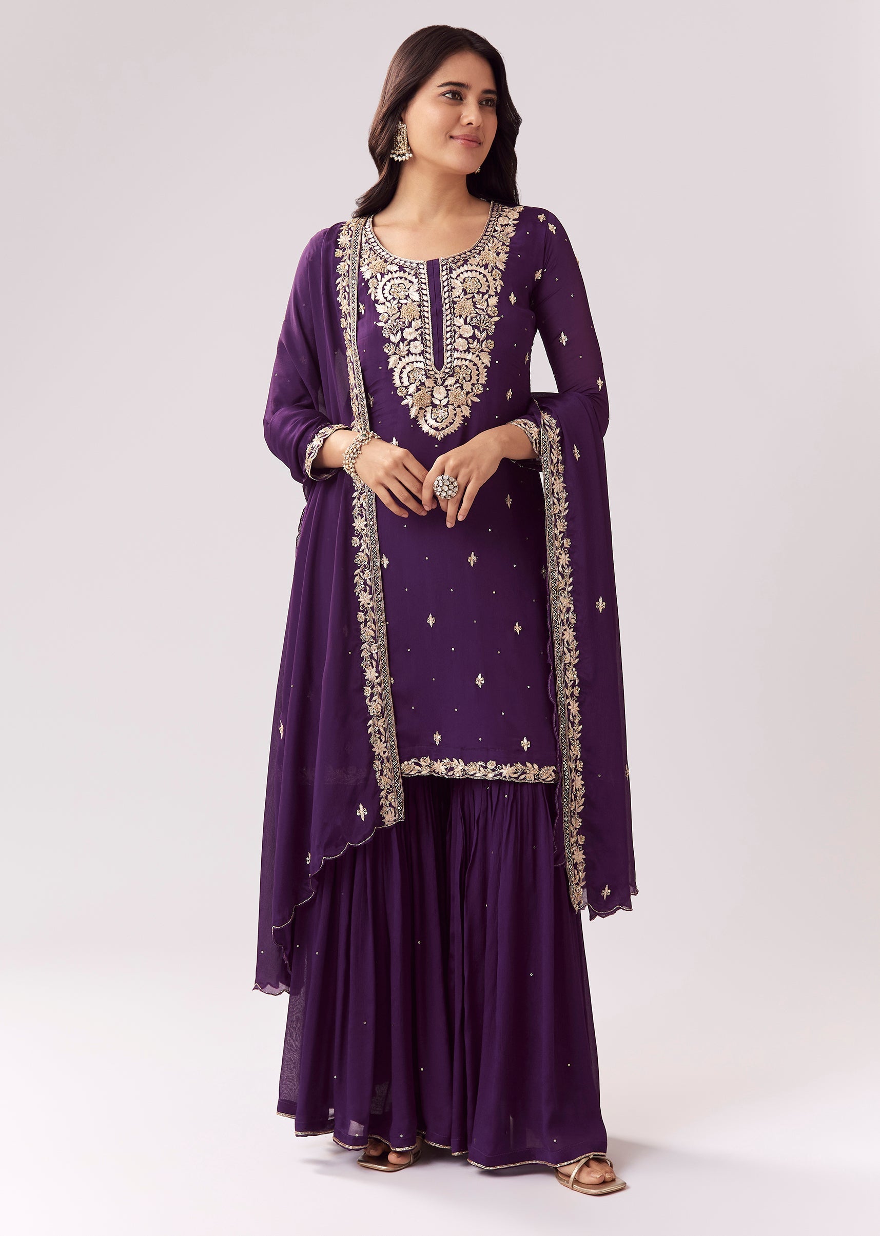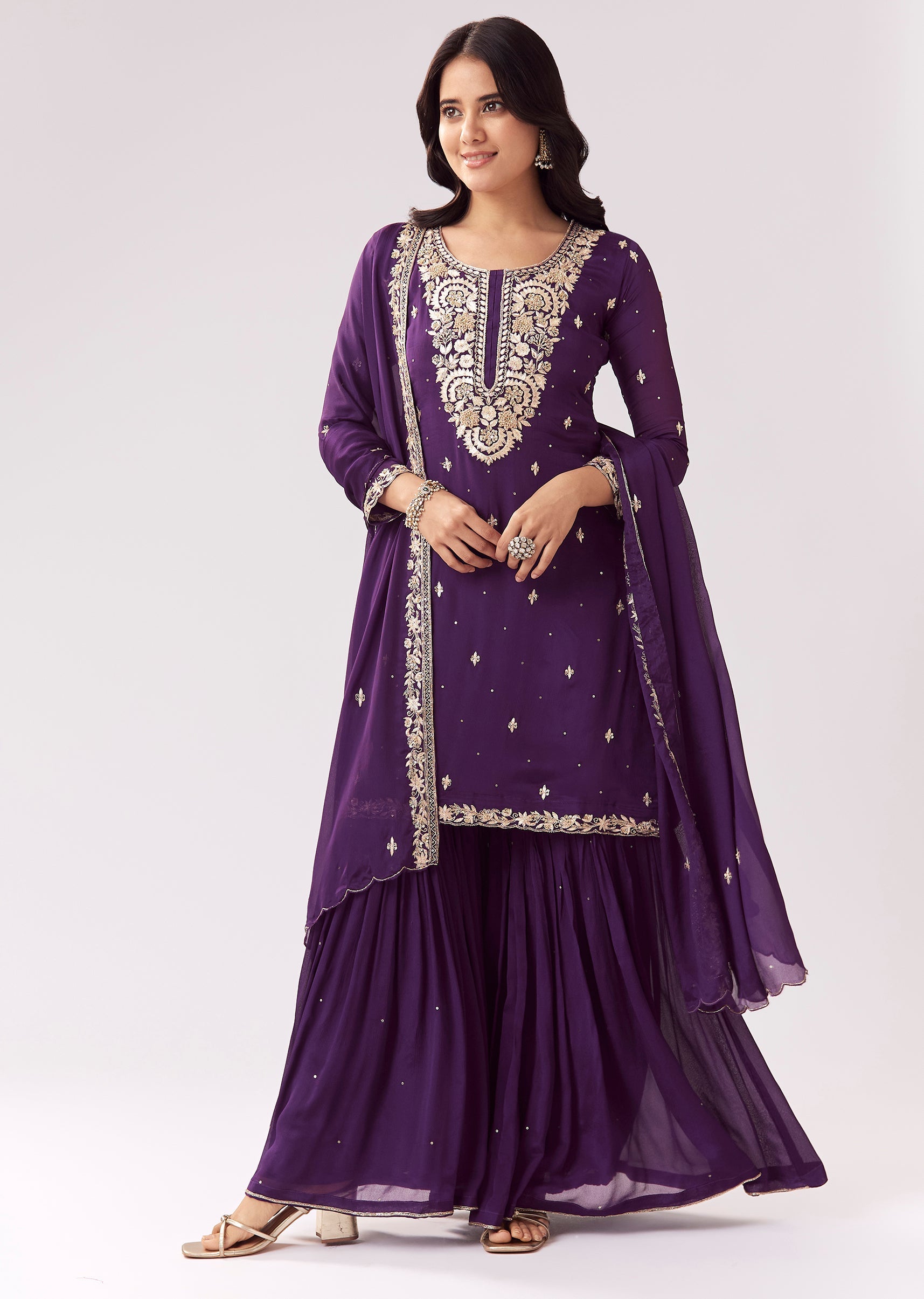This sharara suit features a rich purple tone that stands out at mehendi and sangeet functions. The chinon kurta is embellished with zari and sequins, creating a festive shine without... More Product Details