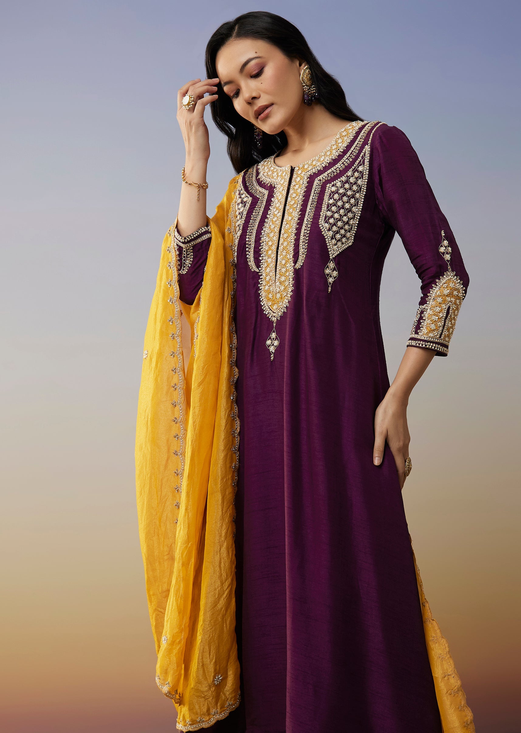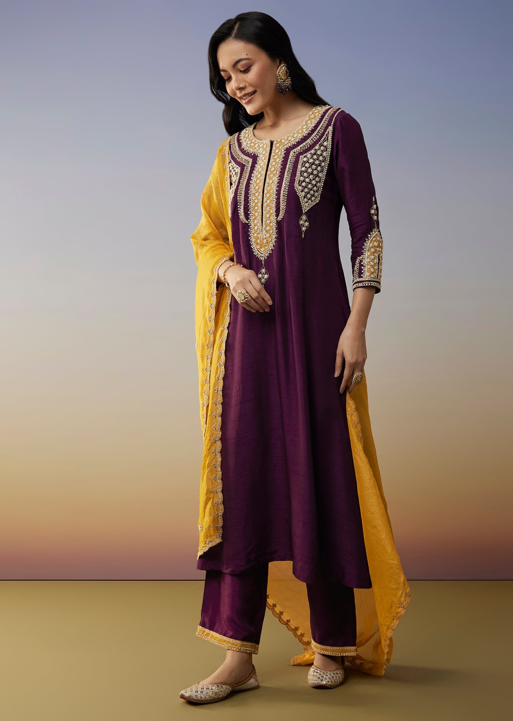 This purple anarkali suit brings a festive elegance perfect for haldi mehendi and intimate celebrations. Designed in a graceful a line silhouette it features a 45 inch flare that moves... More Product Details