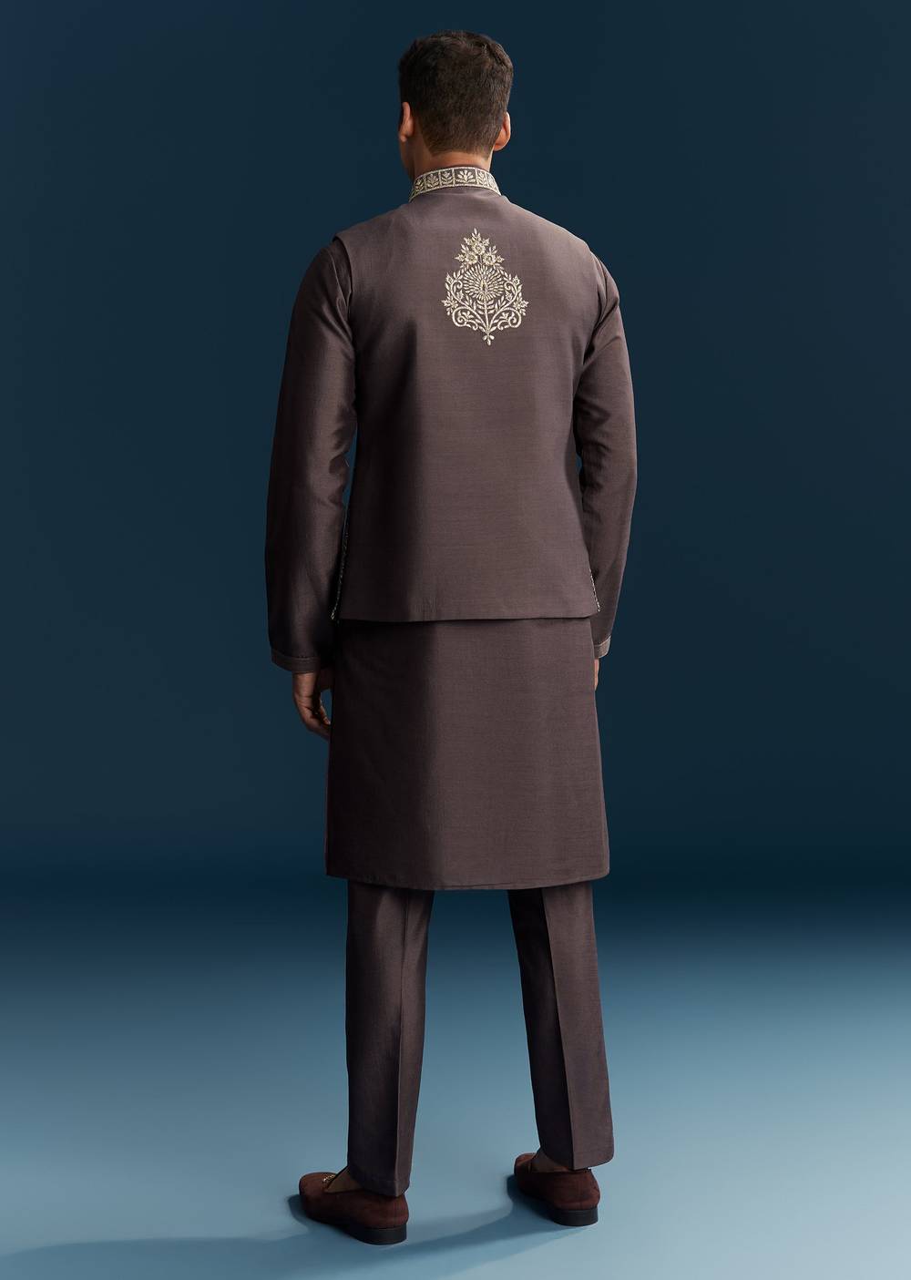Regal and festive, this purple kurta jacket set is perfect for wedding and mehendi celebrations. Crafted in smooth silk fabric, it features intricate thread detailing that adds texture and traditional... More Product Details