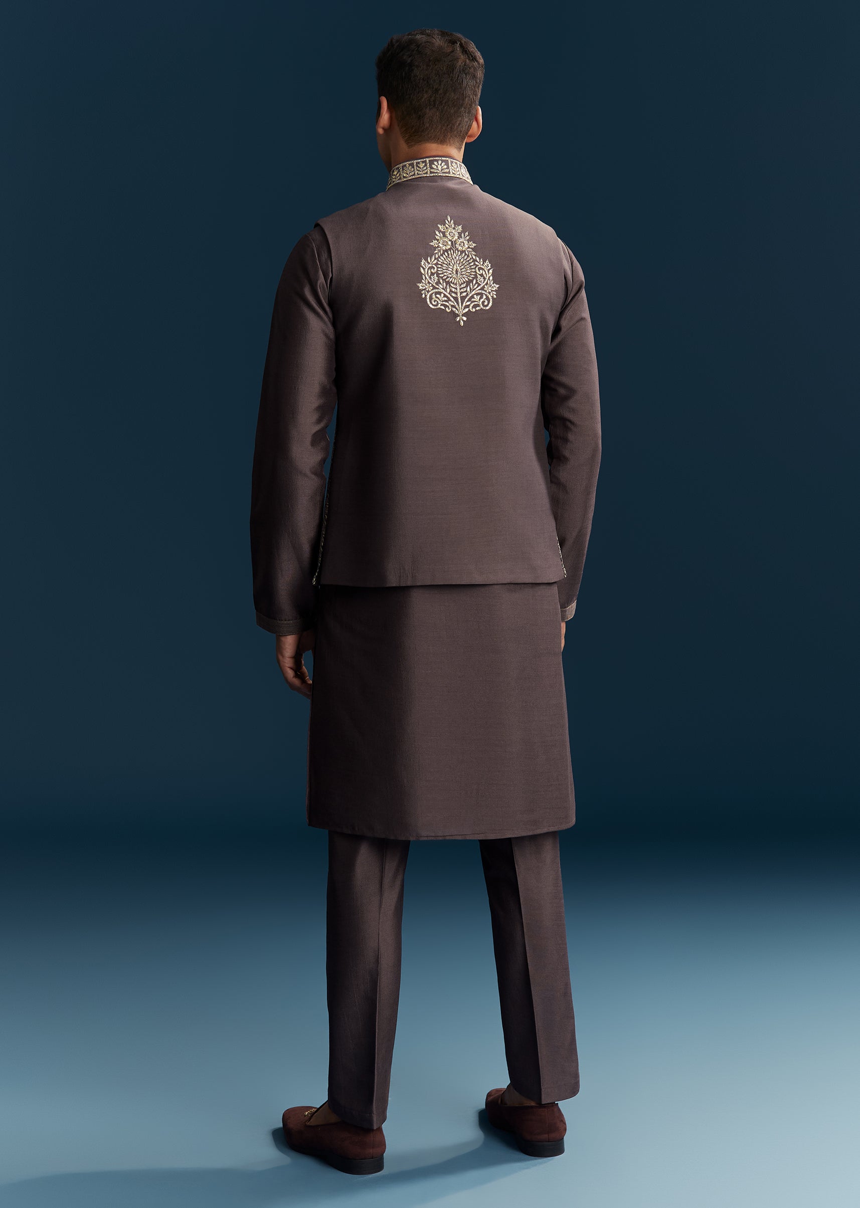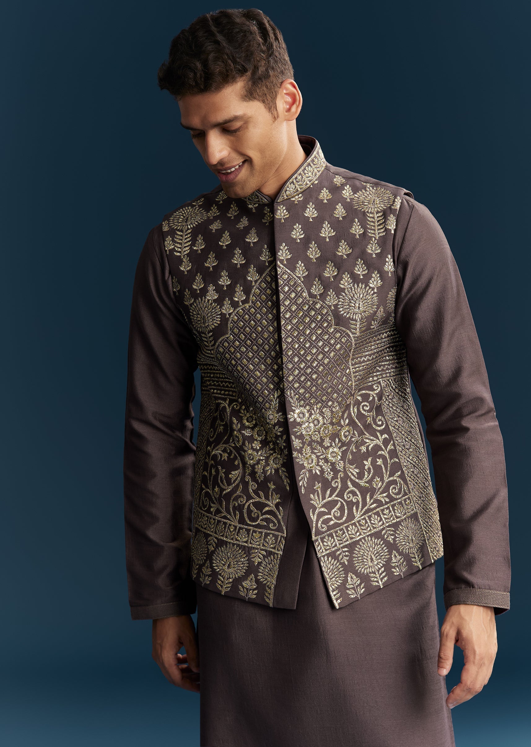 Purple Silk Kurta Jacket Set With Thread Detail Work