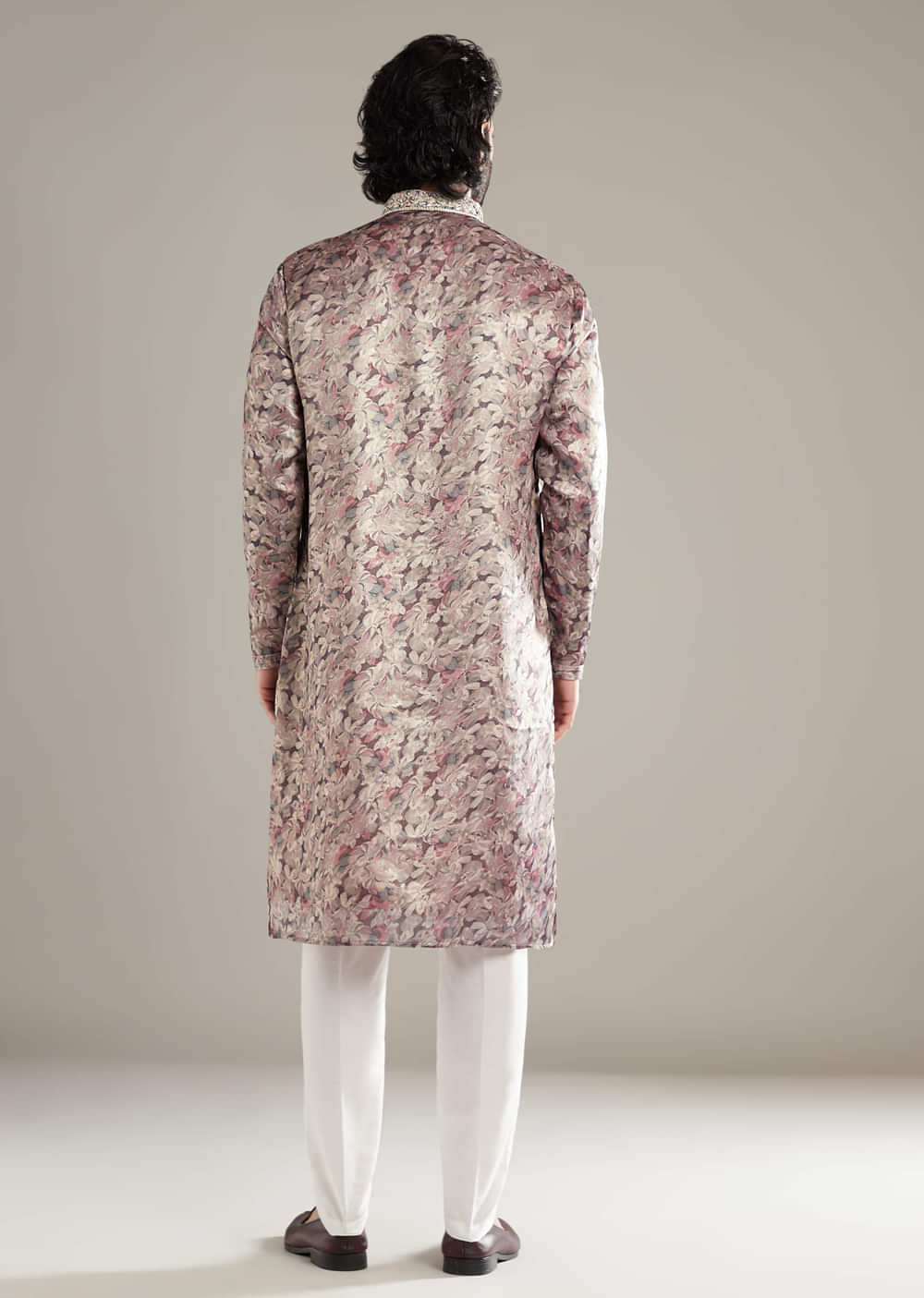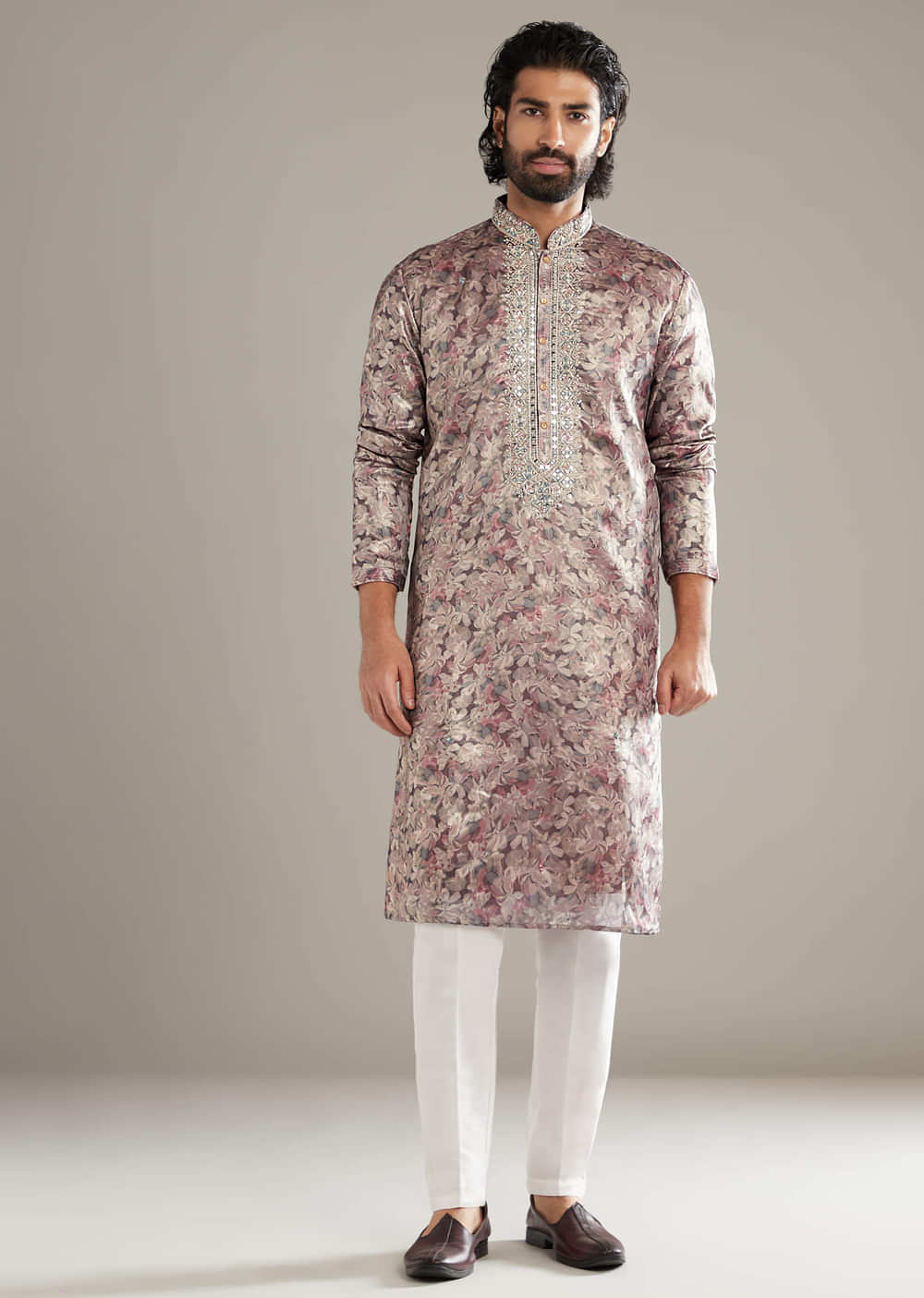 Purple Silk Kurta Set For Men With Floral Print Mirror And Resham Work