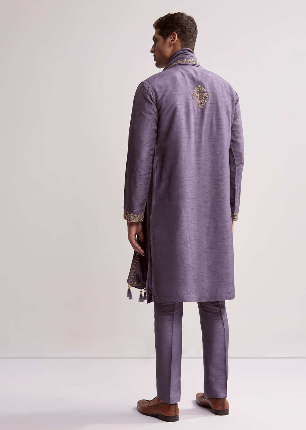 Deep purple makes a bold entry in this purple silk kurta set for men. Hand embroidery in zardosi, sequins, resham, and cutdana adds rich layers, while latkans on the dupatta... More Product Details