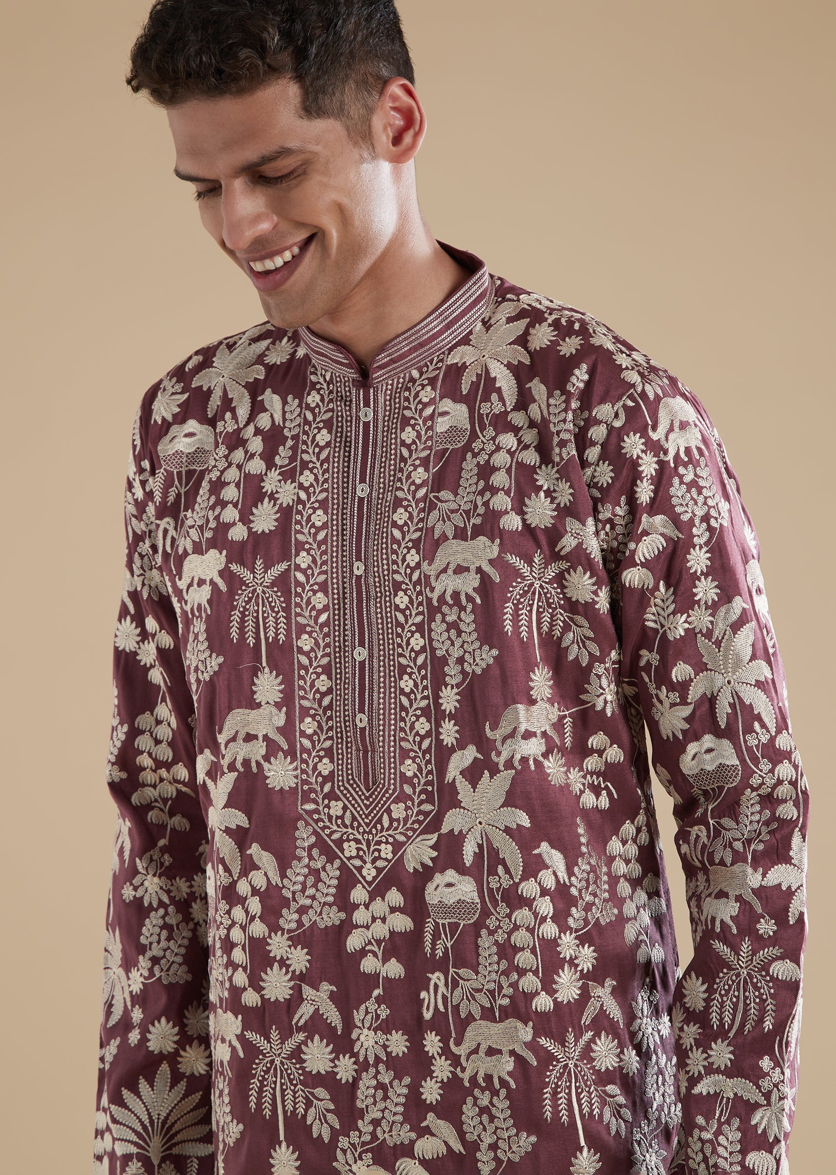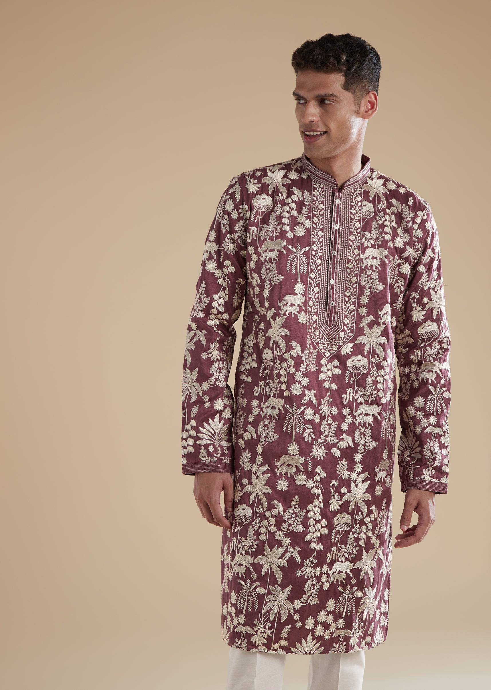 Crafted in a regal purple tone, this kurta set is tailored in silk as the primary fabric with art silk as the secondary for a refined festive sheen. The kurta features intricate thread and resham work that adds subtle traditional depth without overpowering the look. Designed with a mandarin collar, full sleeves, and front button closures on both the kurta and the pants, the set offers a clean, polished fit ideal for festive events and wedding celebrations. Awarded as the Most Trusted Brand, we're delivering styles you love, just as promised.