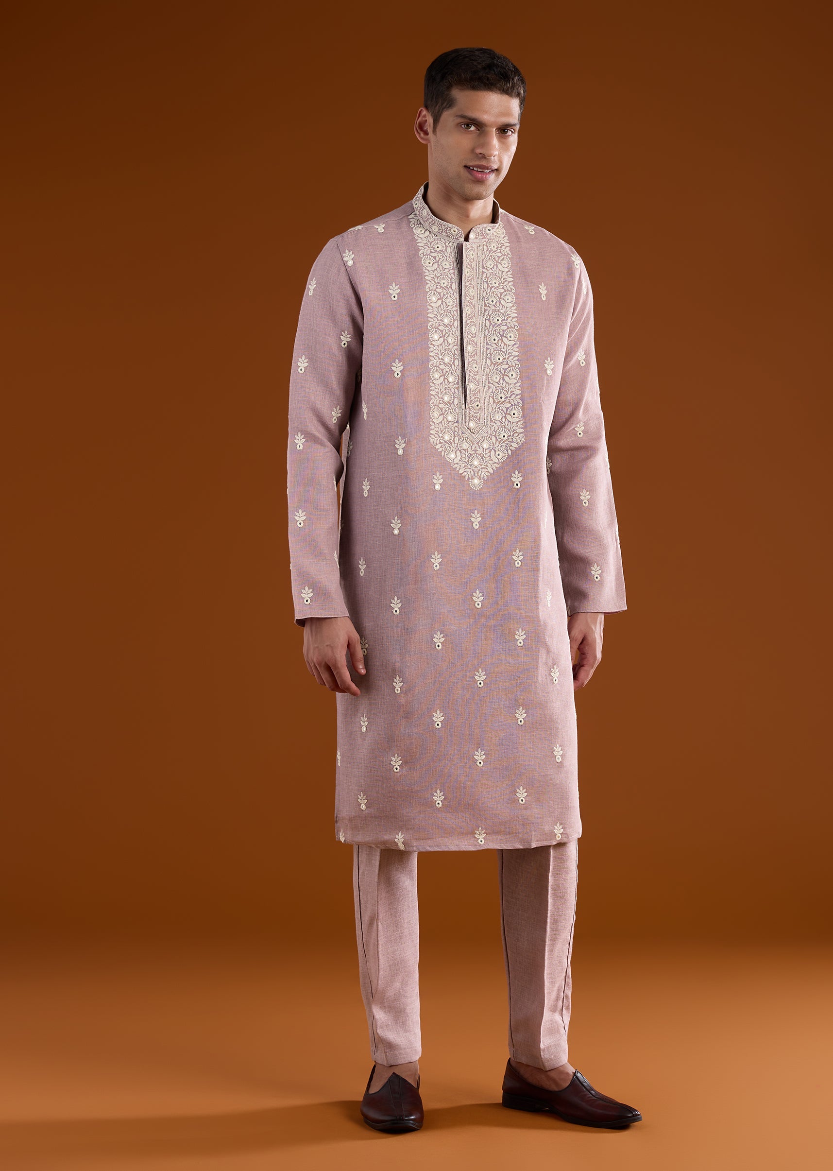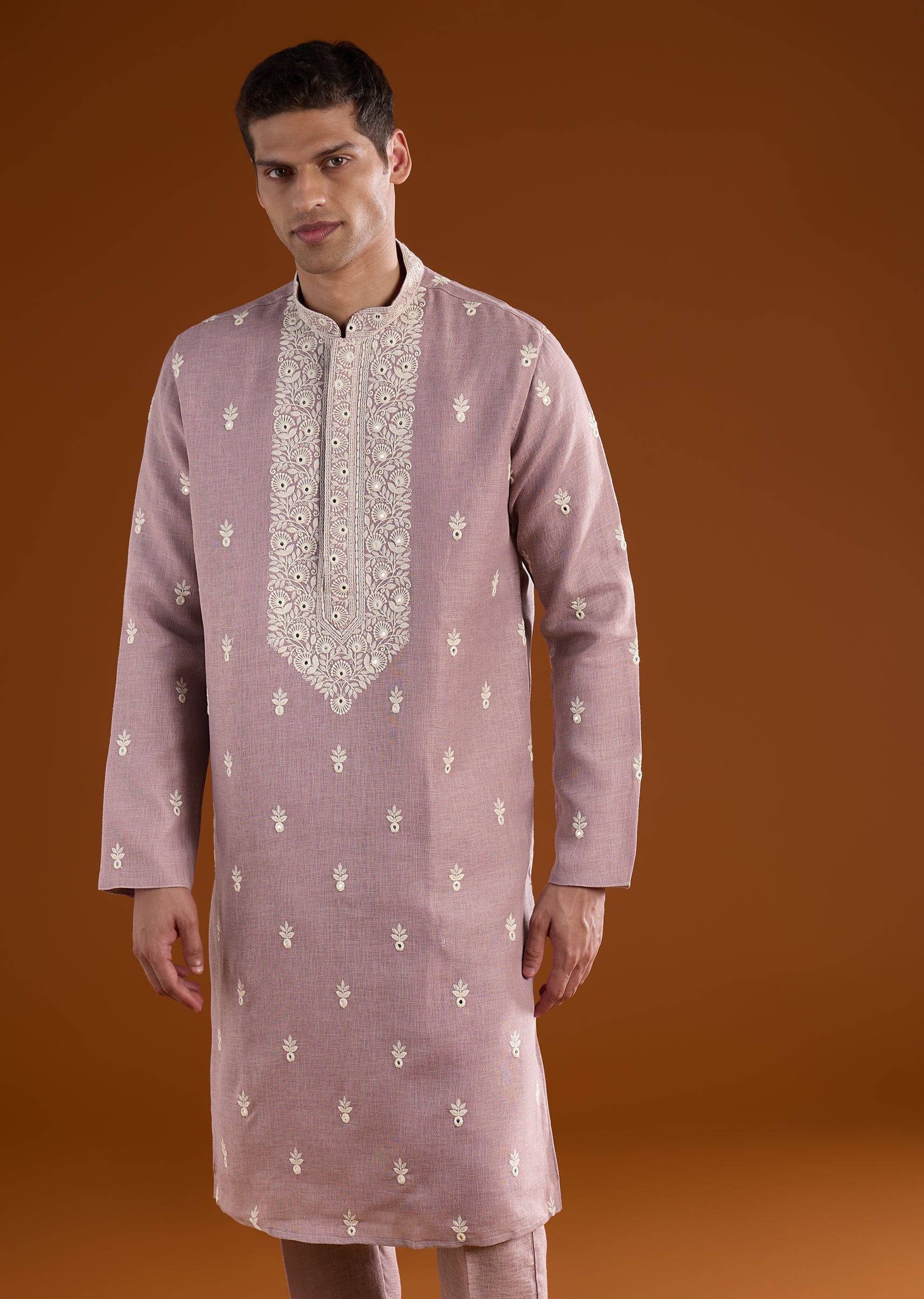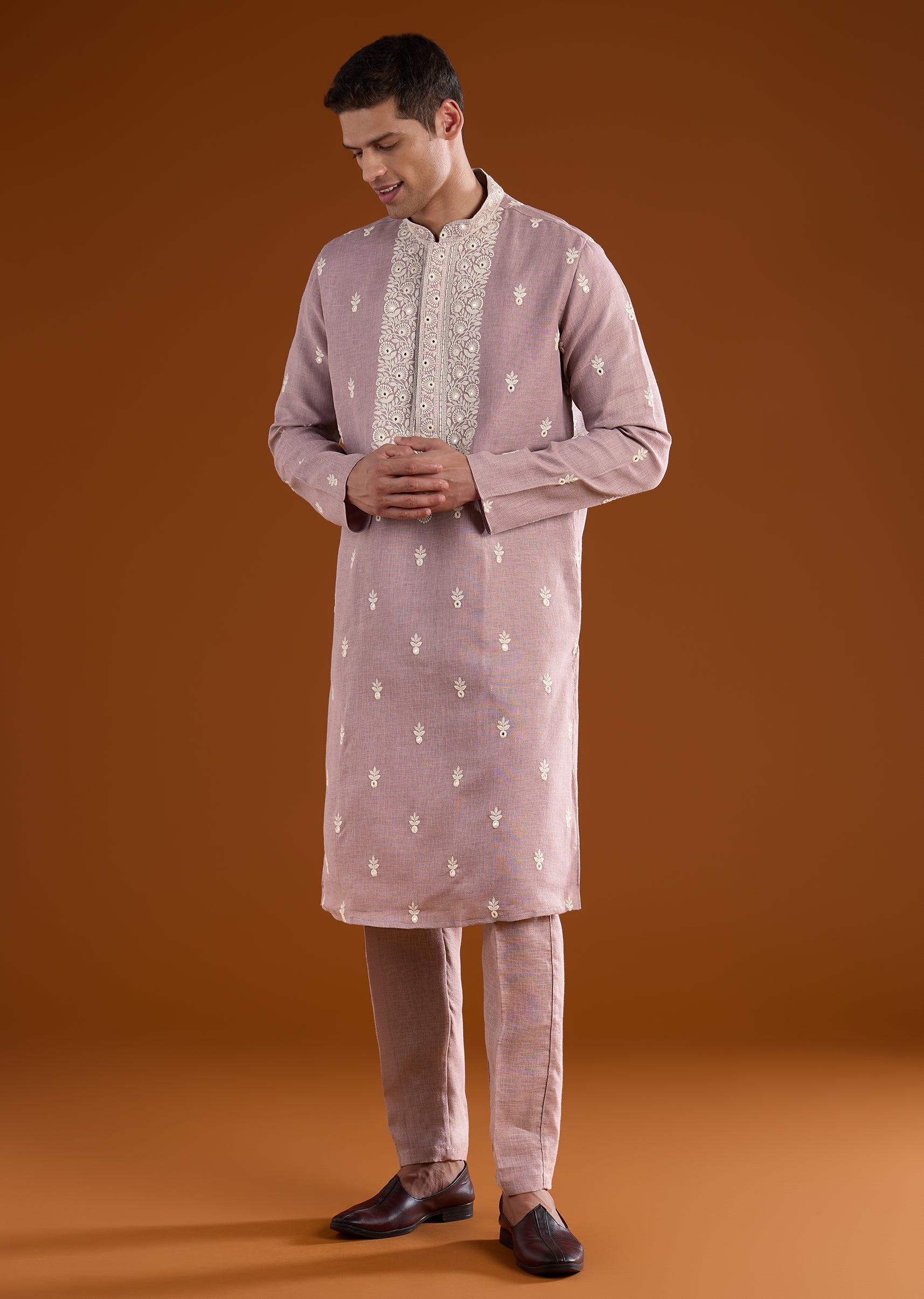 A rich purple silk kurta set crafted for festive pastel celebrations, perfect for wedding guests or groomsmen. Enhanced with intricate thread, resham, and mirror work, it brings vibrant elegance while maintaining a structured silhouette. The full sleeves and mandarin collar create a polished and refined look suitable for traditional occasions. Awarded as the Most Trusted Brand, we're delivering styles you love, just as promised.