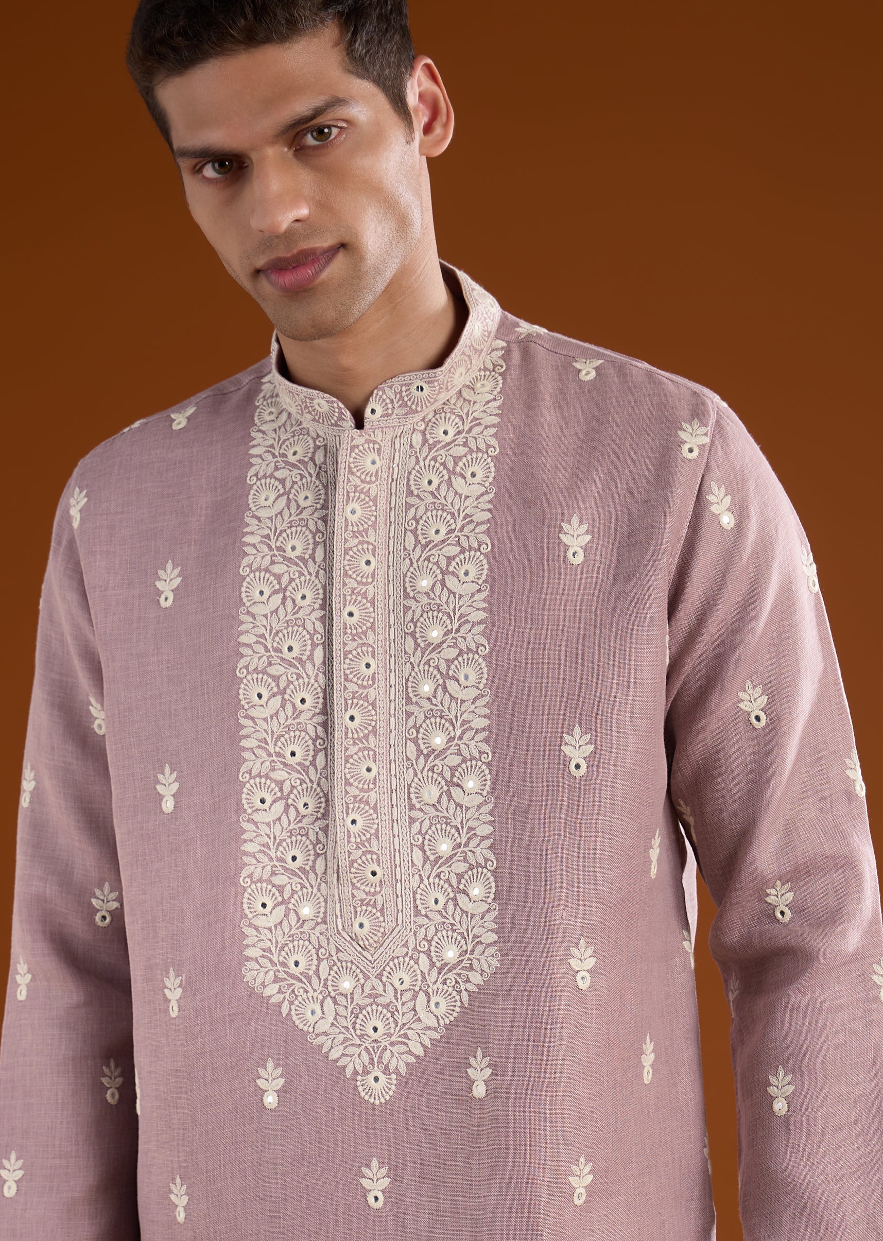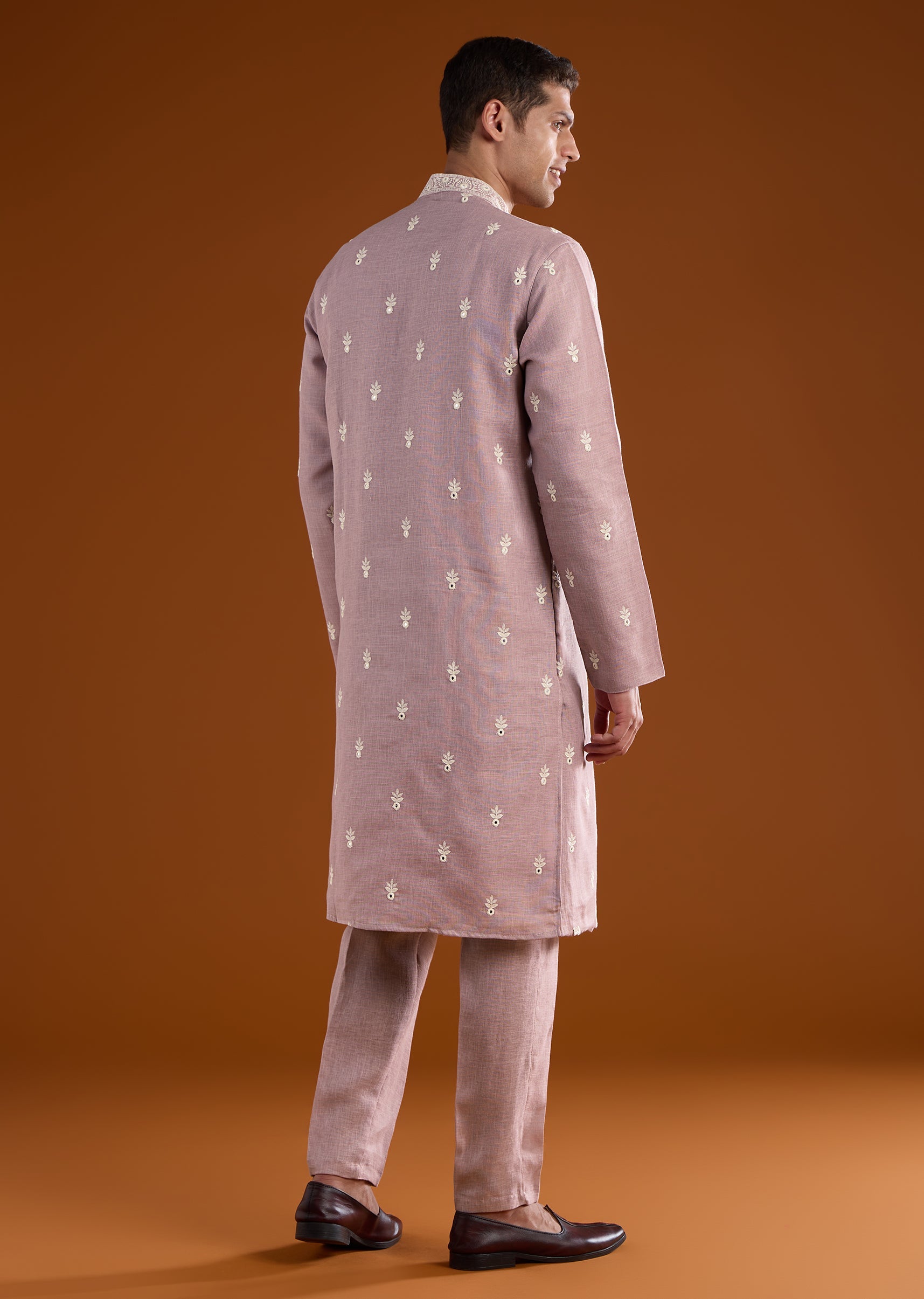 Purple Silk Mens Kurta Set With Thread Resham And Mirror Work
