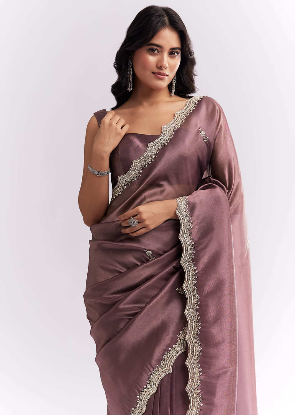 Fit Tips:Organza’s airy body flows easily, while the richly worked border anchors the drape so the pallu stays in place.