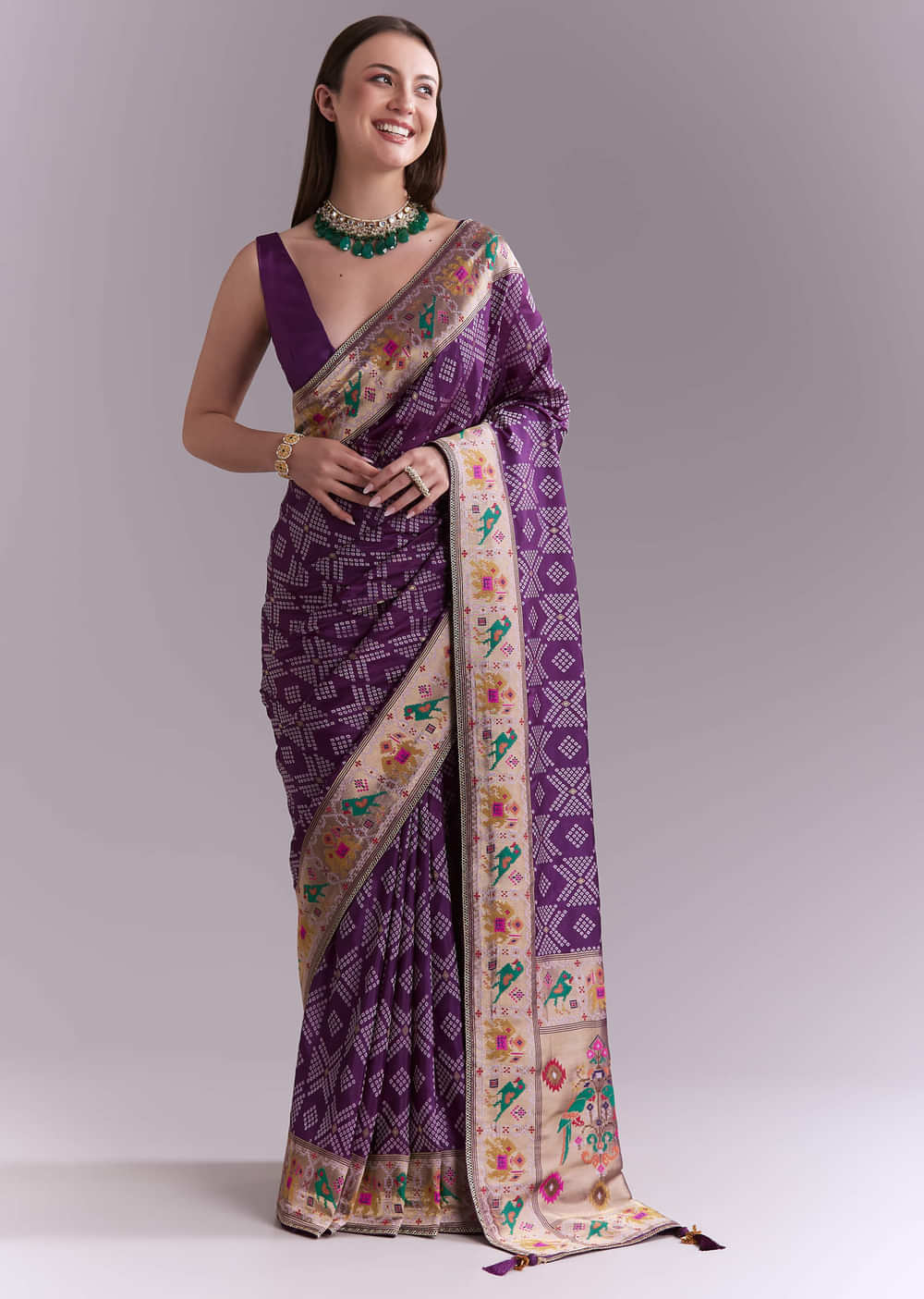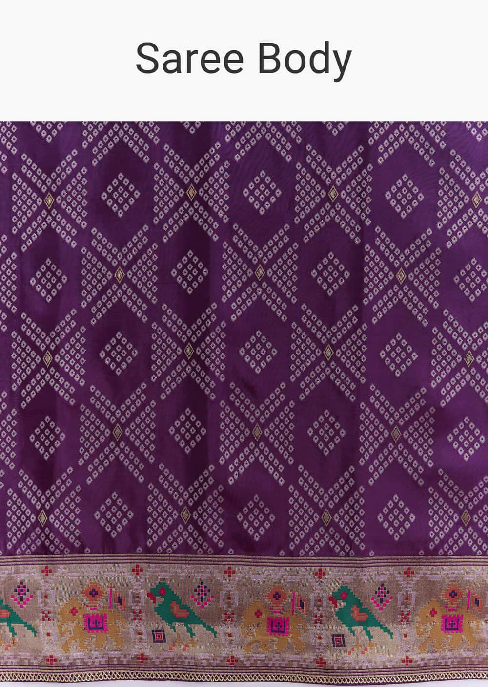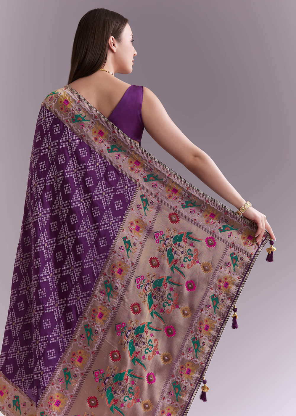 Purple Silk Saree With Zari Border And Multicolour Motifs