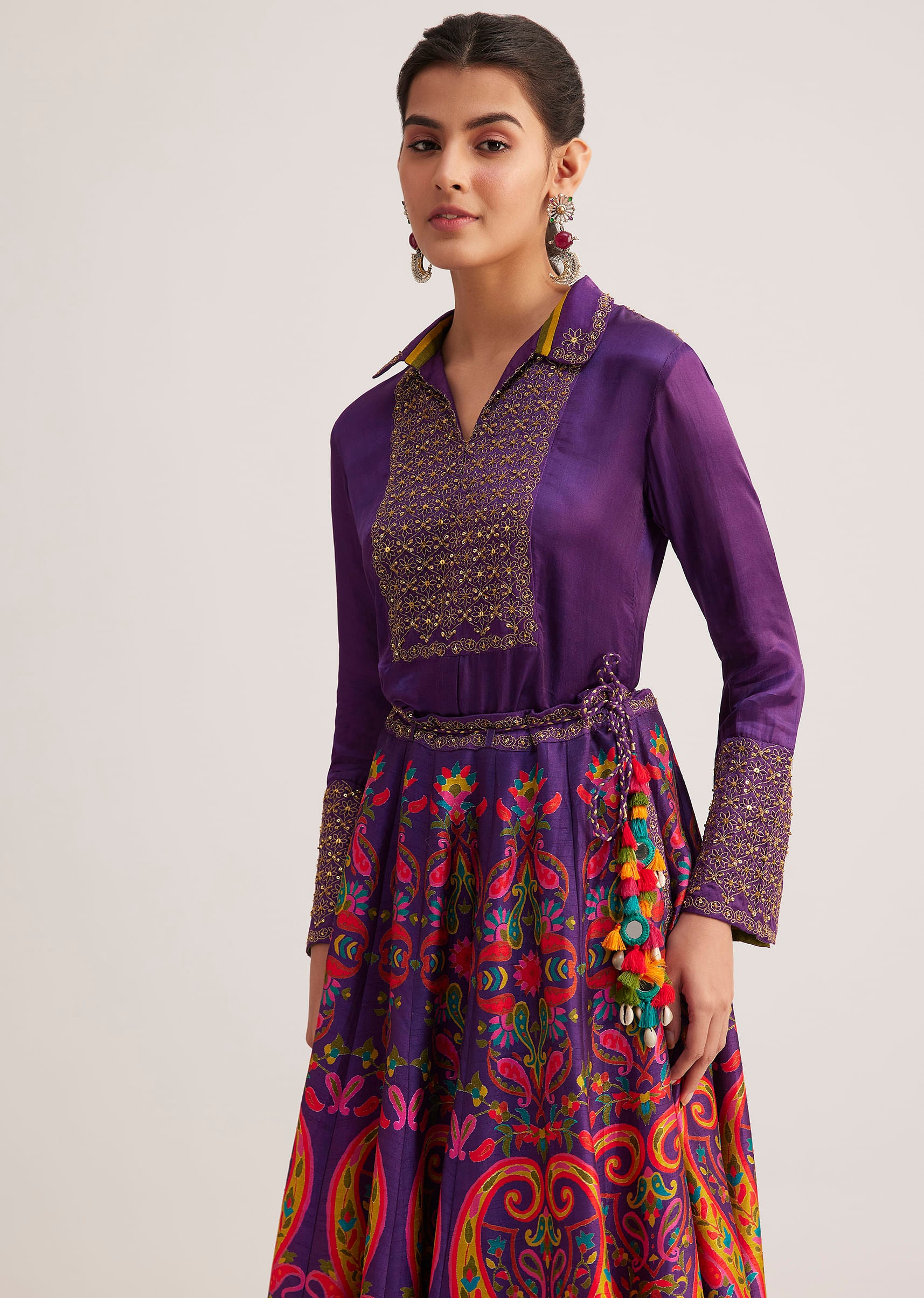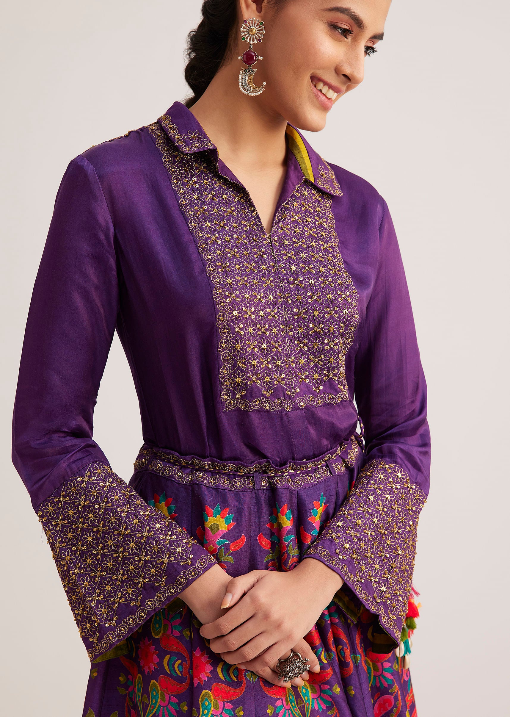 Purple Silk Shirt And Skirt Set With Zari Embroidery