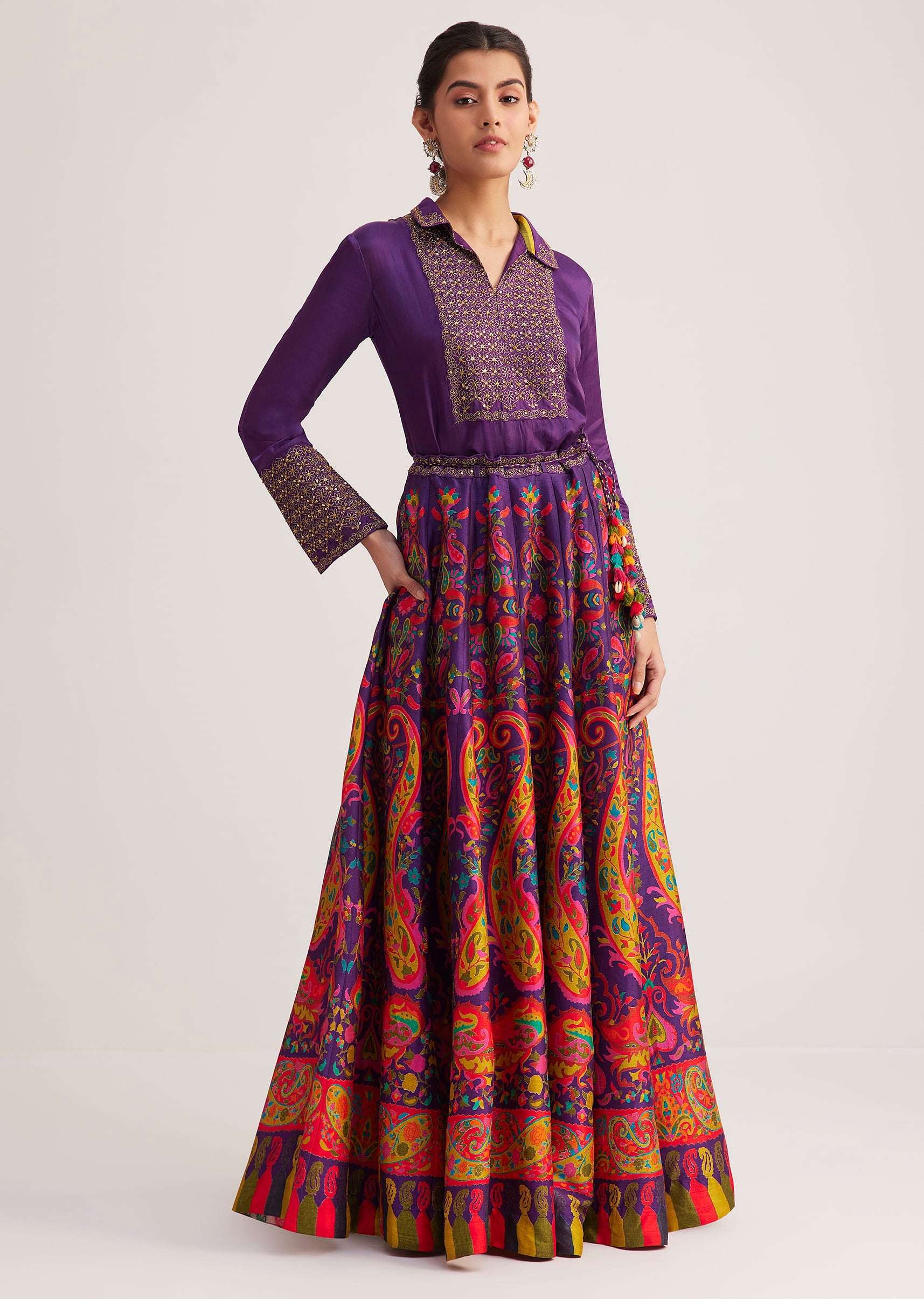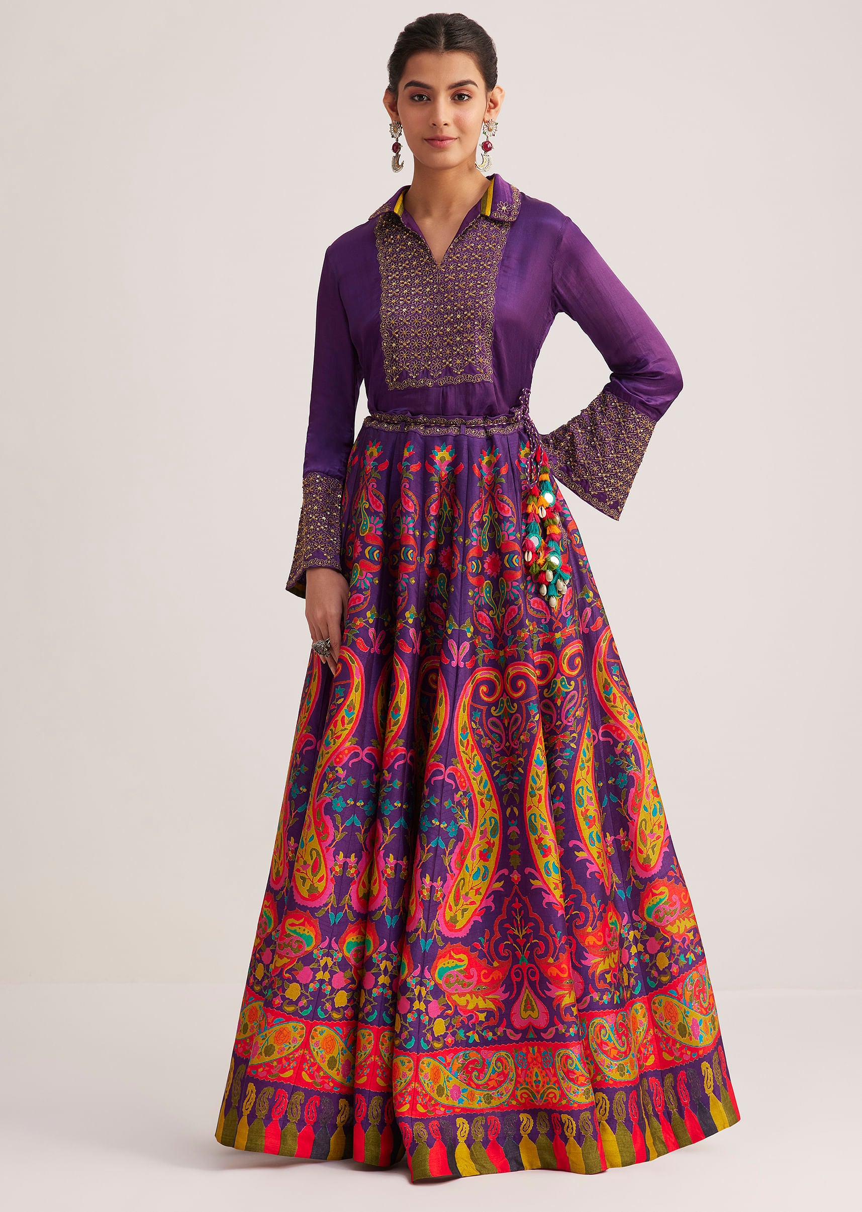 Elevate your festive style with this exquisite purple silk shirt and vibrant printed heavy slub silk skirt. The shirt features intricate zari and bead embroidery, while the skirt is adorned with bold patterns, sequins, and beads, creating a perfect fusion of tradition and modernity. Ideal for festive celebrations, weddings, and sangeet nights, this ensemble exudes sophistication and charm. Awarded as the Most Trusted Brand, we're delivering styles you love, just as promised.