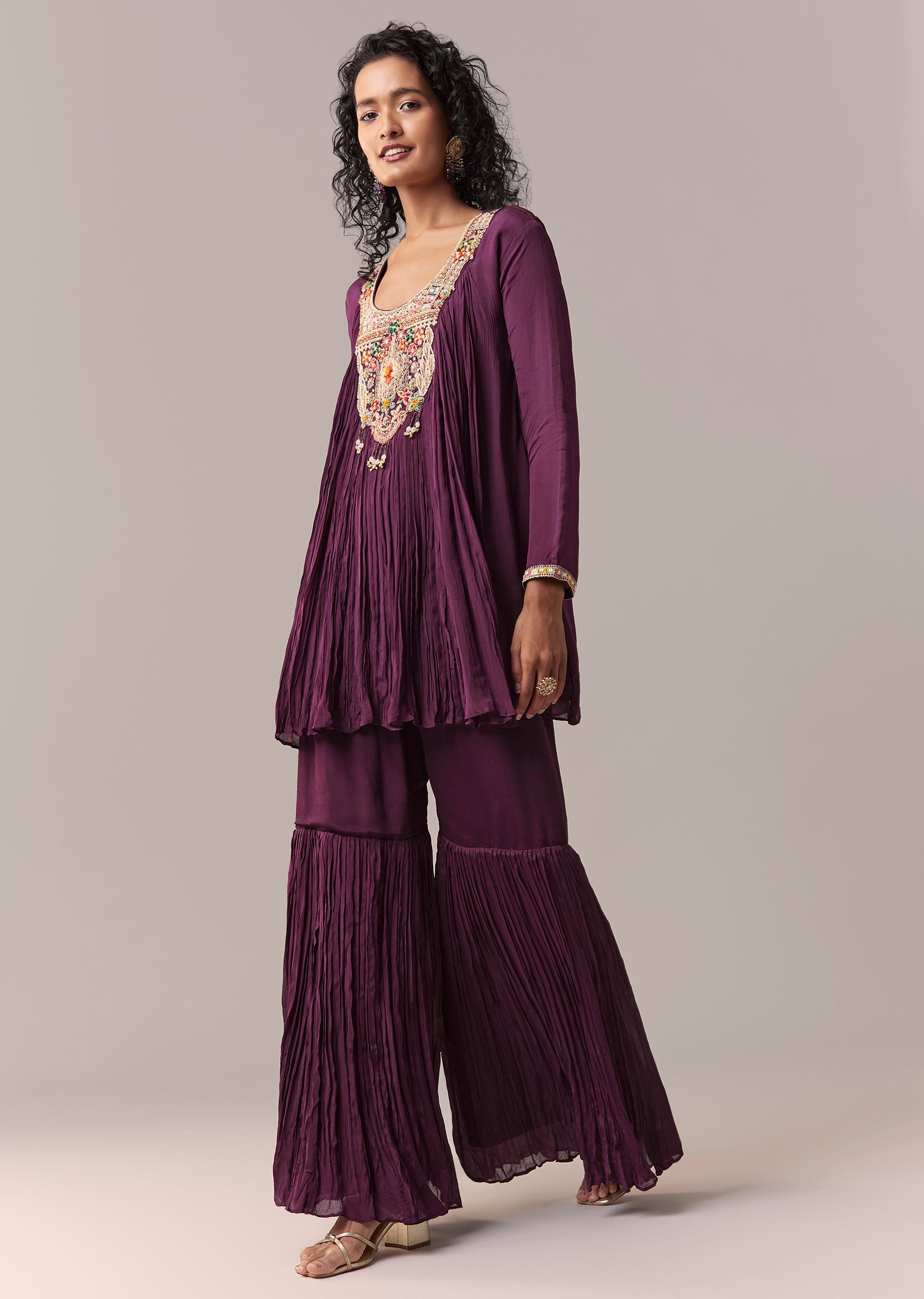 Designed in airy chinon, this purple sharara set brings a modern silhouette with festive finesse. The cape-style top features intricate thread and moti work, styled with full sleeves and a... More Product Details