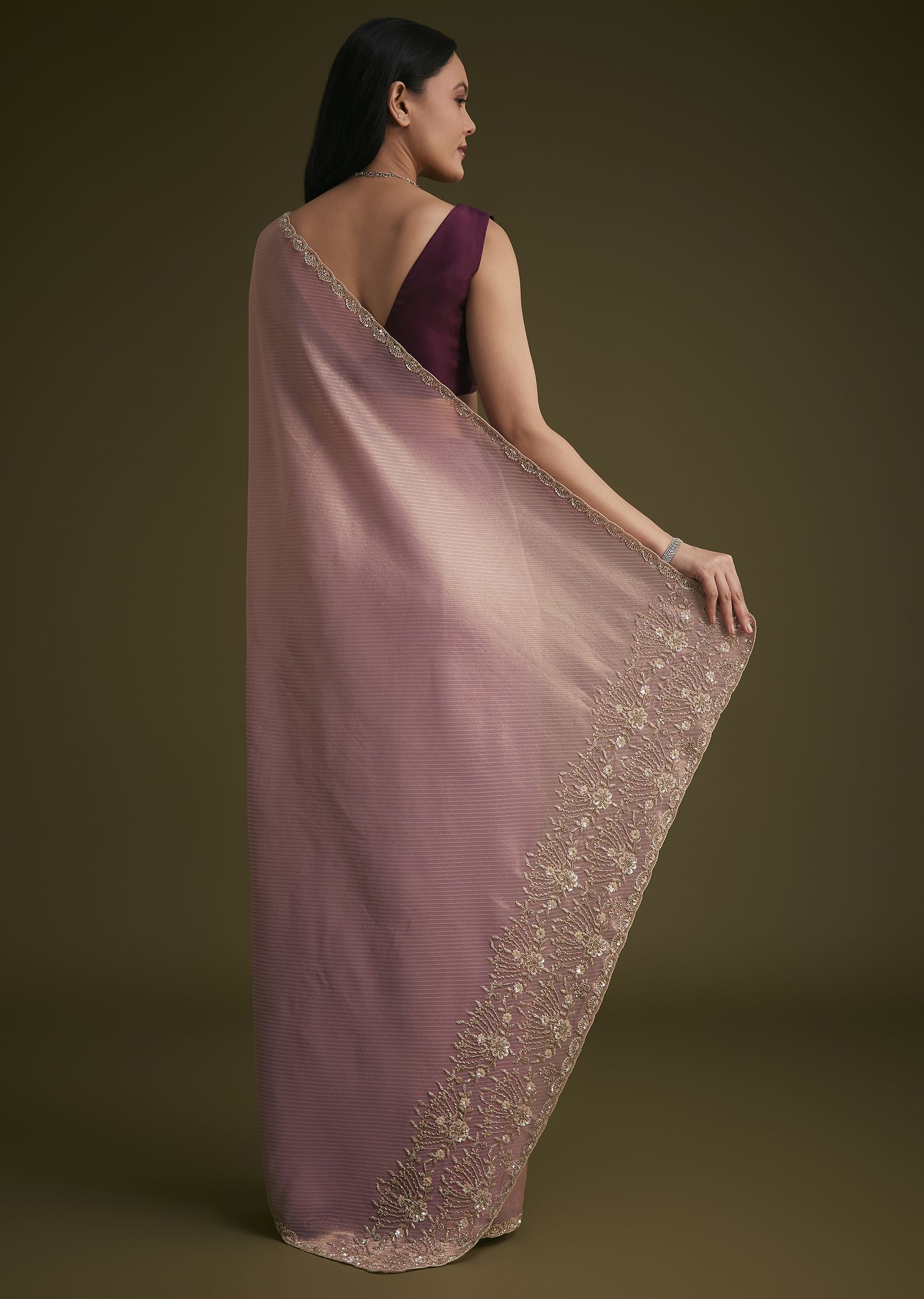 Elevate Your Wardrobe With This Purple Tissue Saree Adorned With Intricate Cutdana Stones And Sequins Embroidery. The Lustrous Tissue Fabric Adds A Luxurious Texture, While The Detailed Craftsmanship Enhances Its... More Product Details