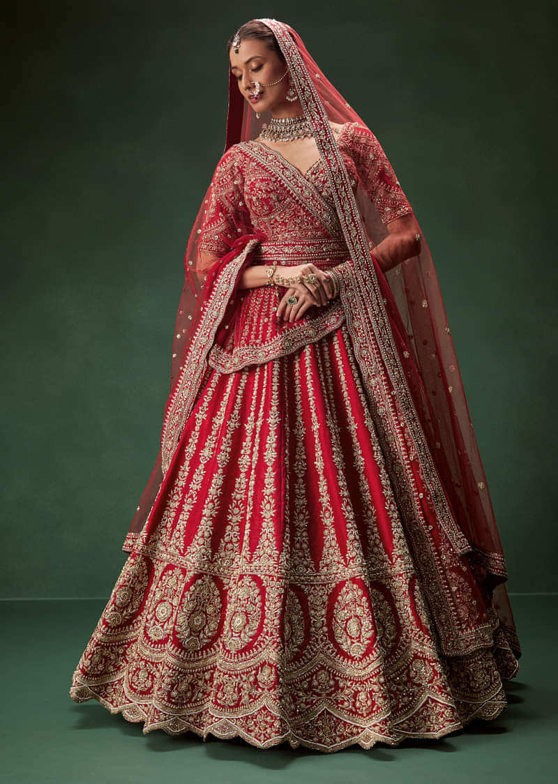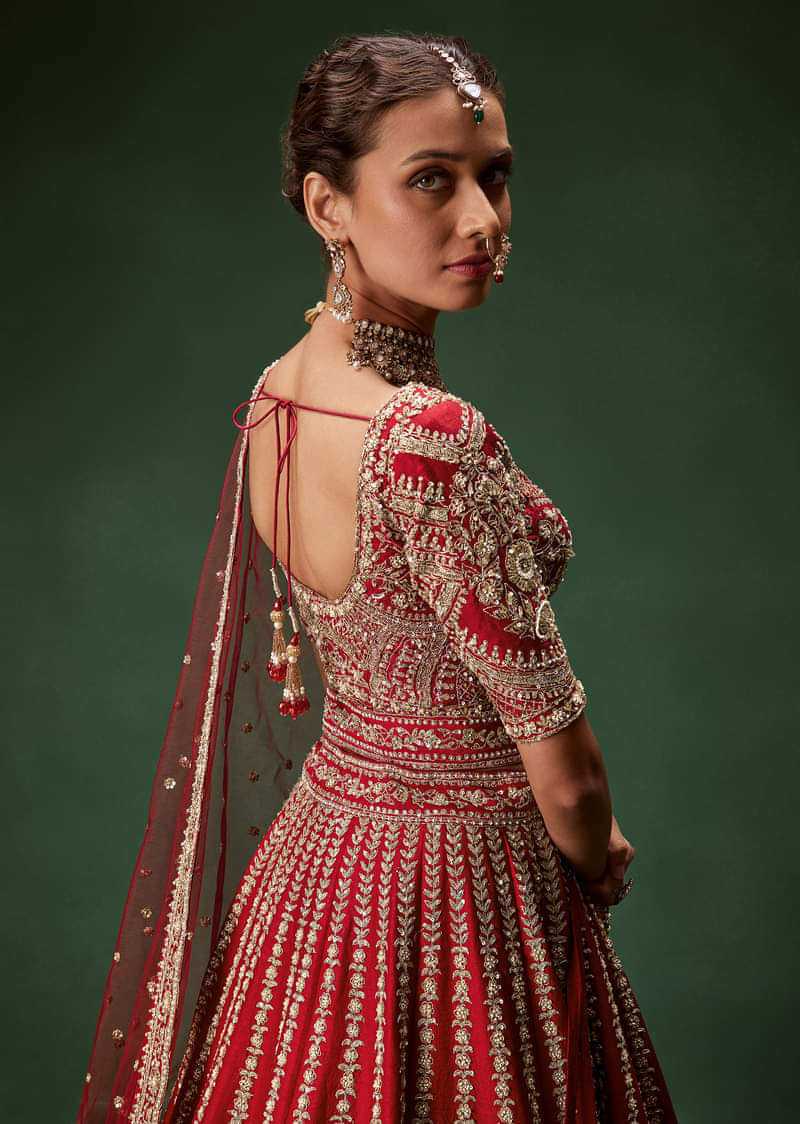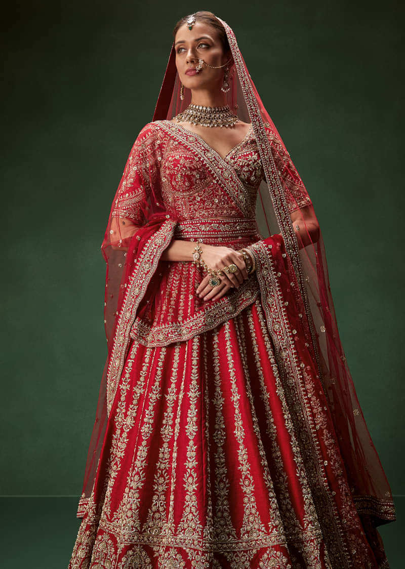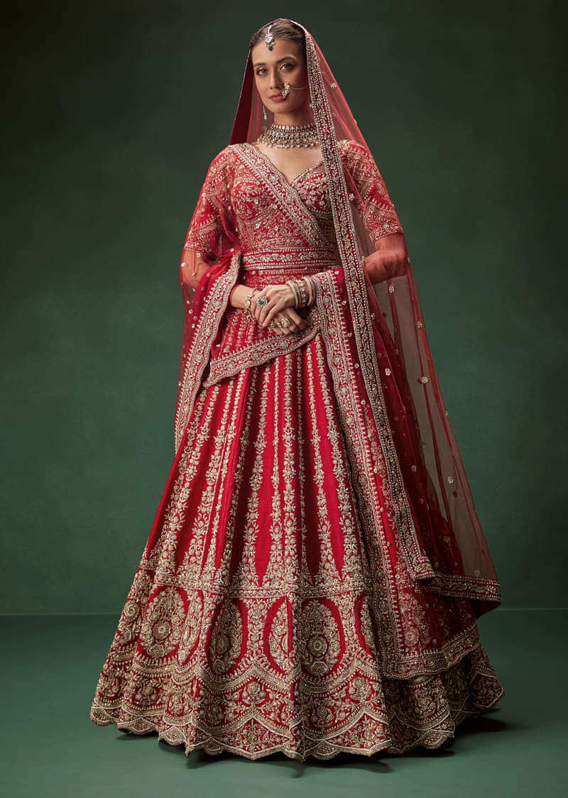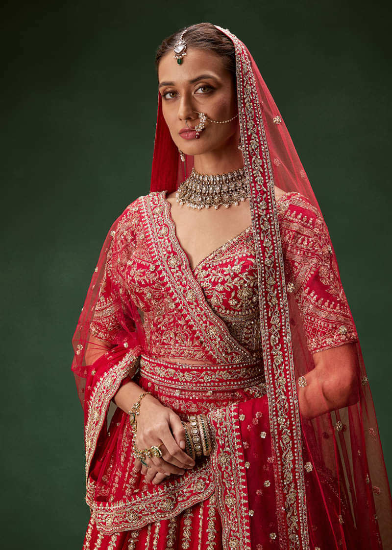 This heavily worked bridal lehenga is a classic with resham dori and sequin embroidery covering the ensemble. Styled in rani pink with coordinated dupattas and sweetheart blouse it's made for... More Product Details