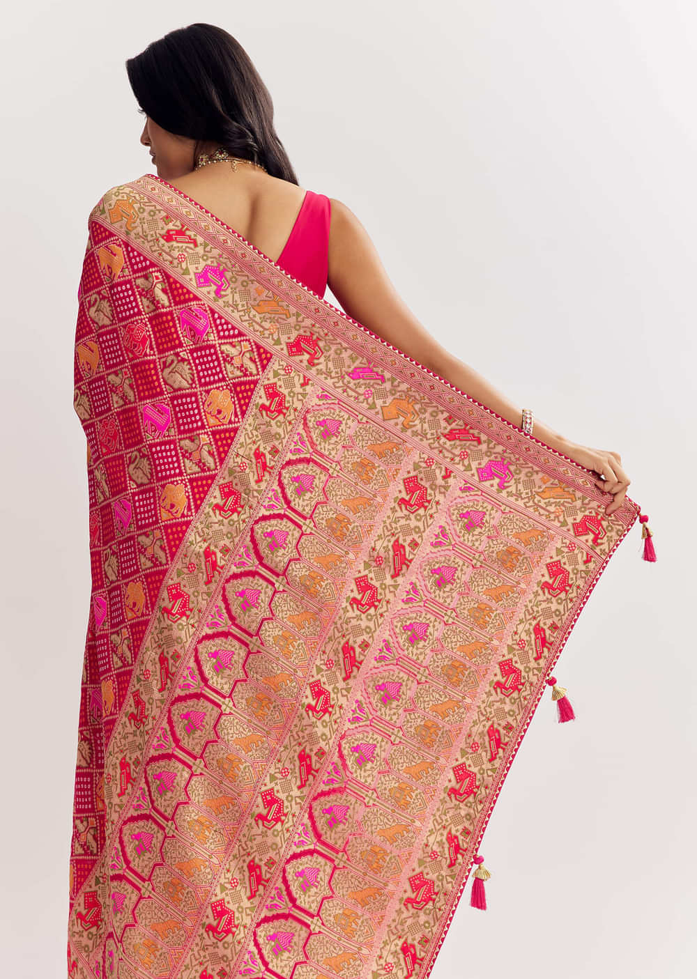 Rani Dola Silk Bandhani Saree With Multicolor Animal Motifs And Gota Border
