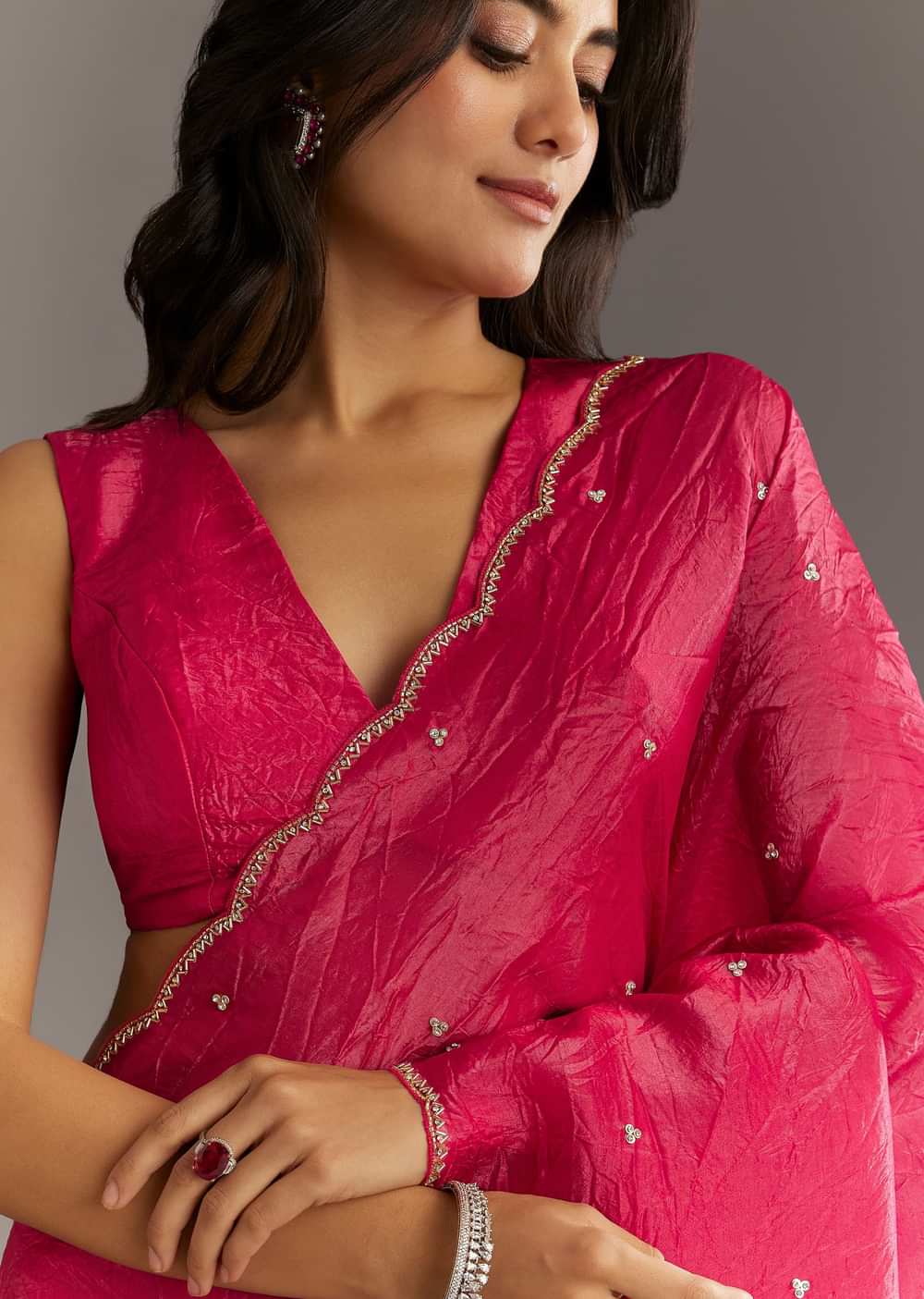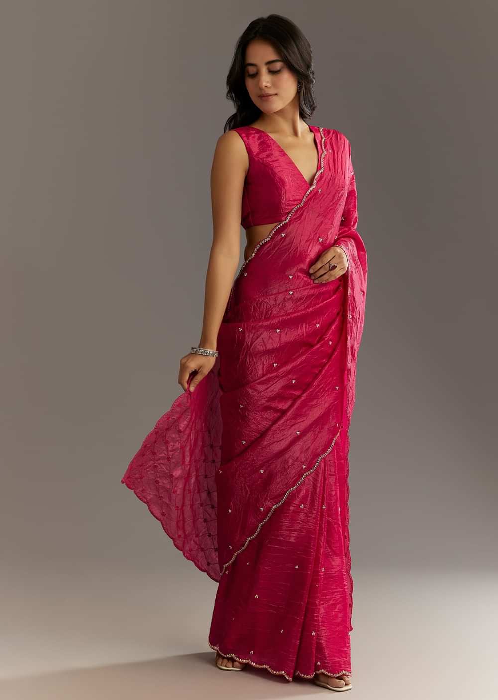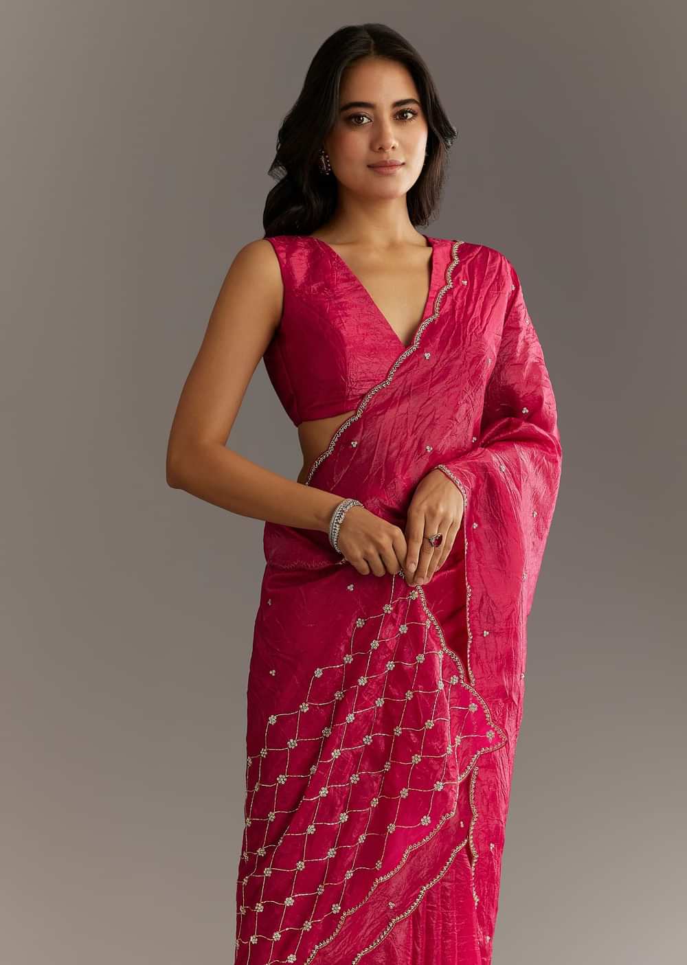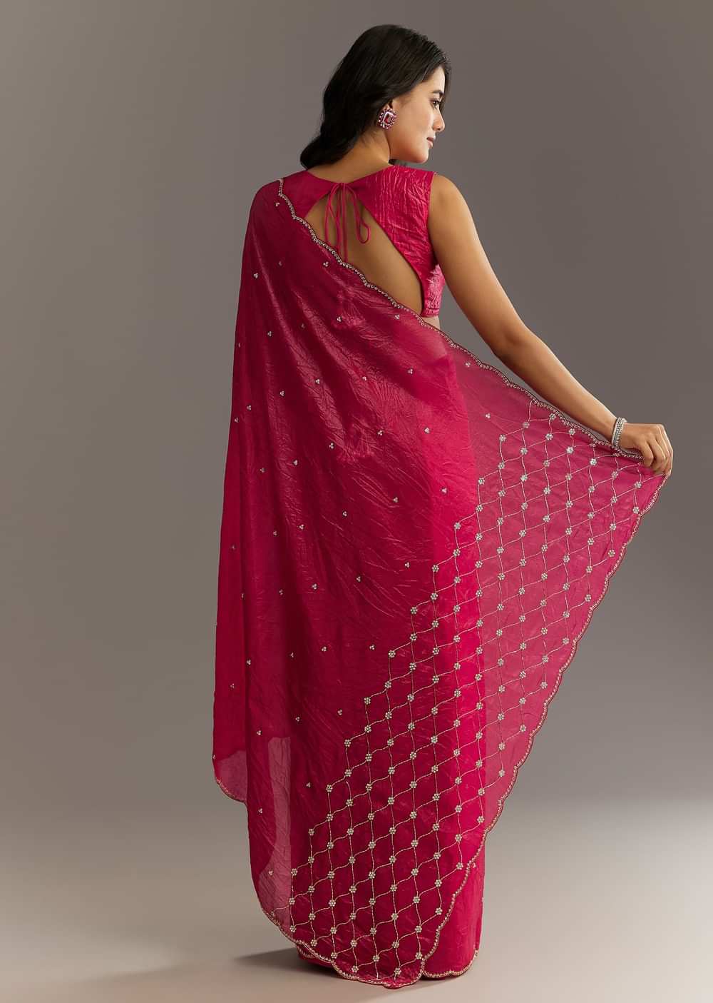 Rani Pink Crushed Tissue Saree With Cutdana And Sequin Embroidery