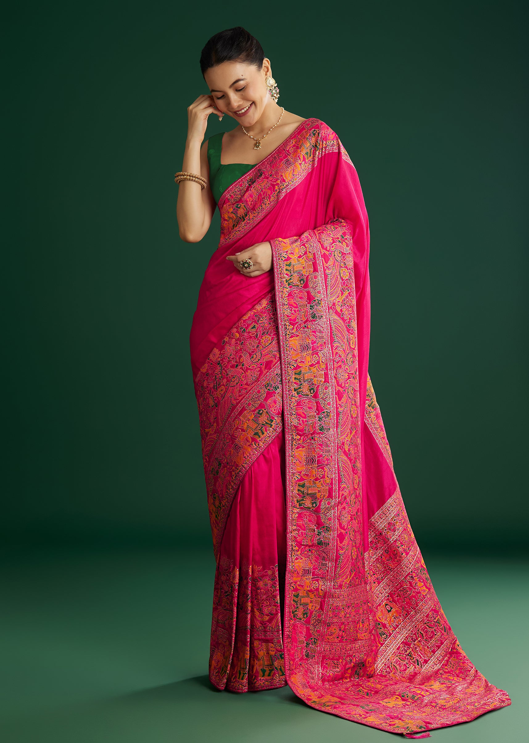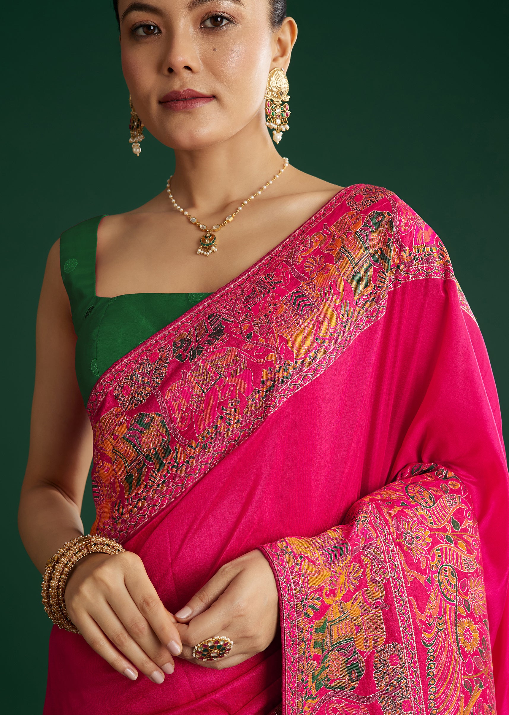 Rani Pink Dola Silk Woven Saree With Floral And Animal Prints