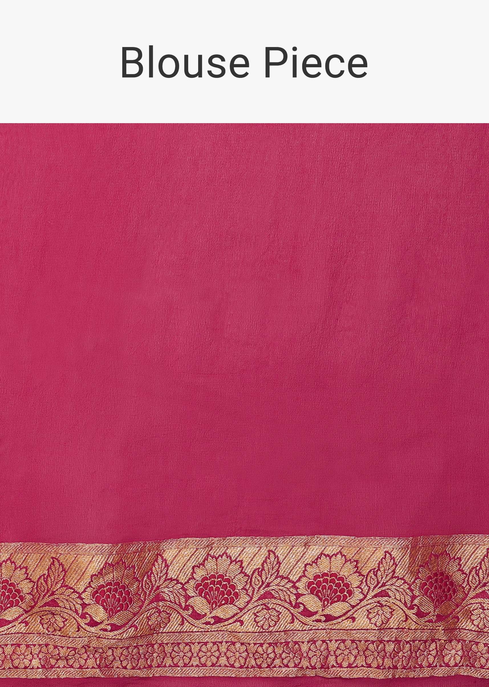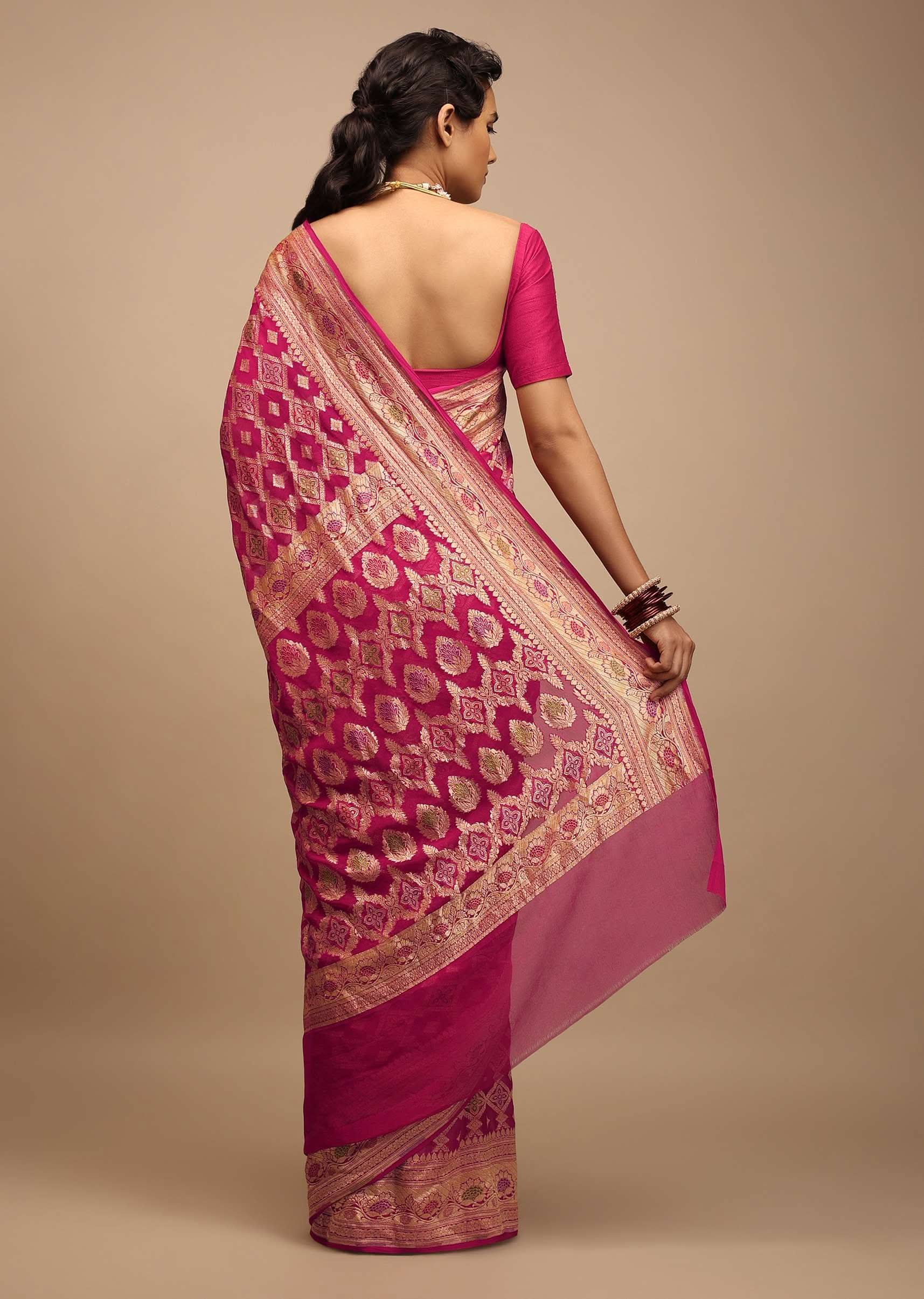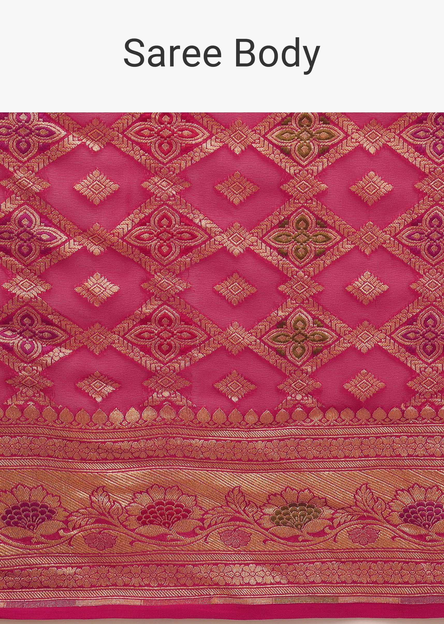 Rani Pink Saree In Georgette With Woven Geometric Jaal And Floral Border