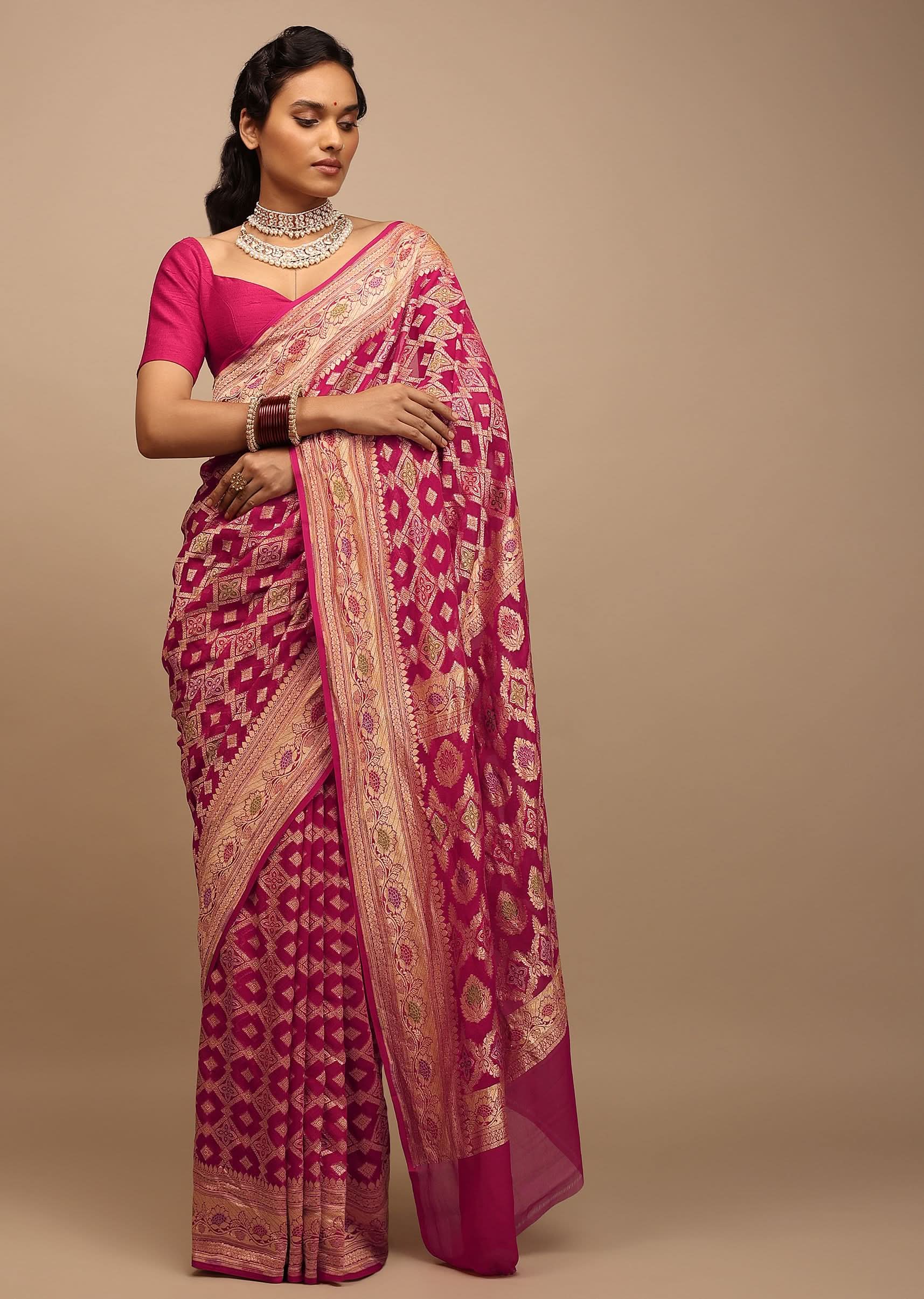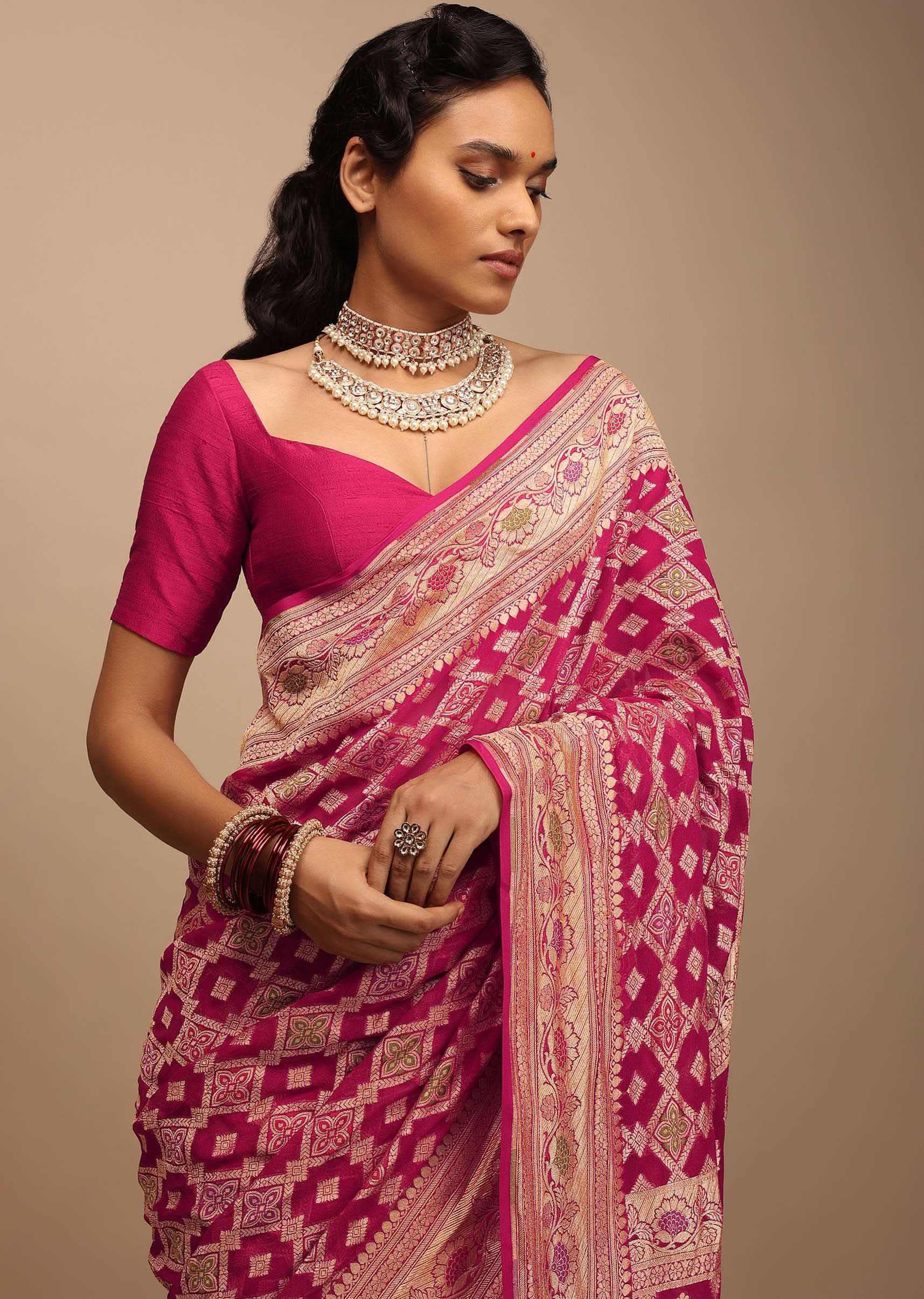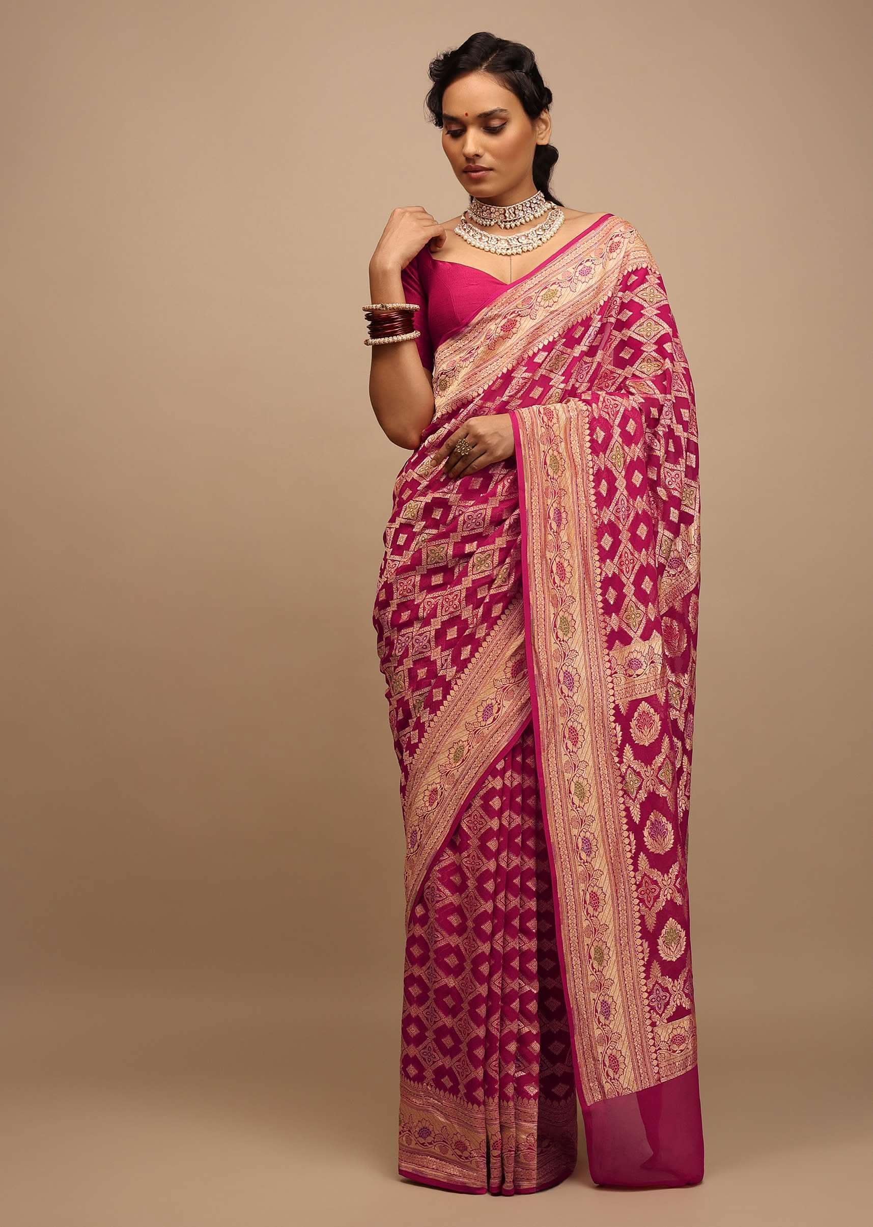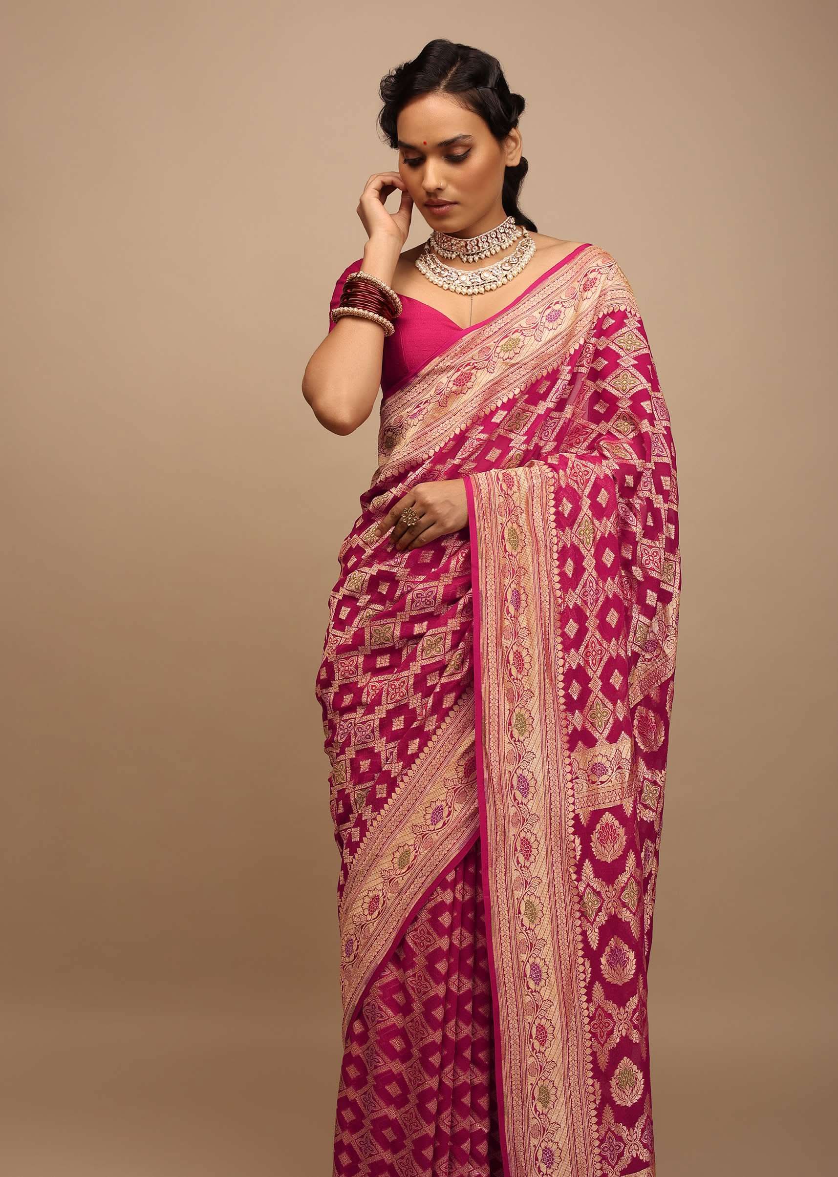 Rani Pink Saree In Georgette With Woven Geometric Jaal And Floral Border