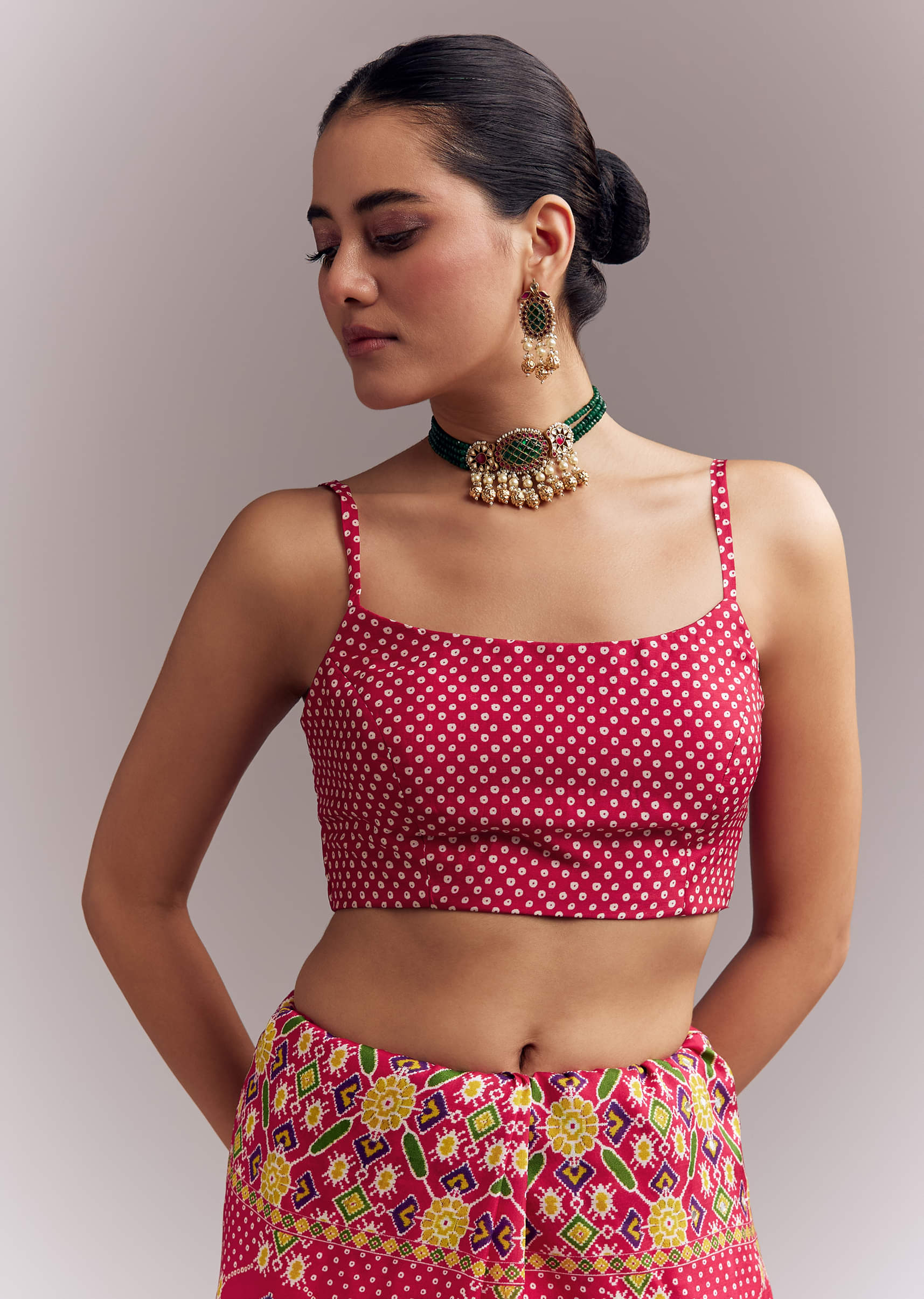 Graphic pattern takes center stage as this rani pink satin saree carries an all-over ikat print with smooth, fluid fall. Mirror work along the border and pallu adds bright little... More Product Details