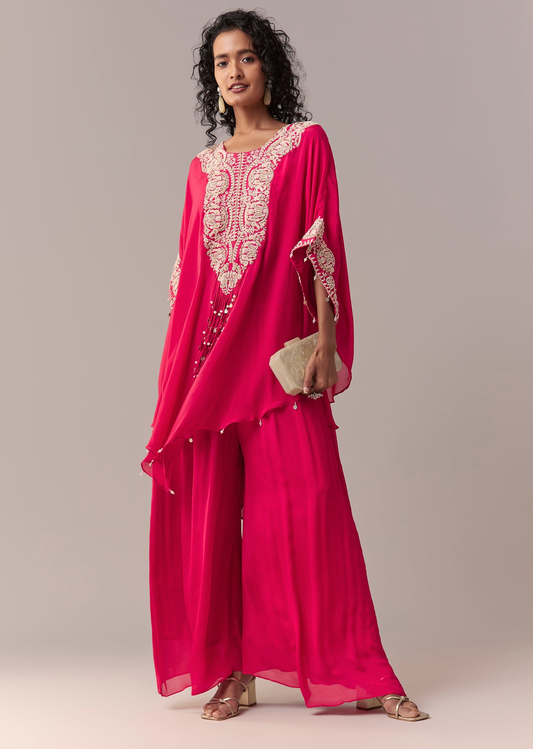 Crafted in airy chinon, this co-ord set features a threadwork cape paired with a coordinated crop top and flared palazzos. Designed with a round neckline and cape-style sleeves for soft... More Product Details