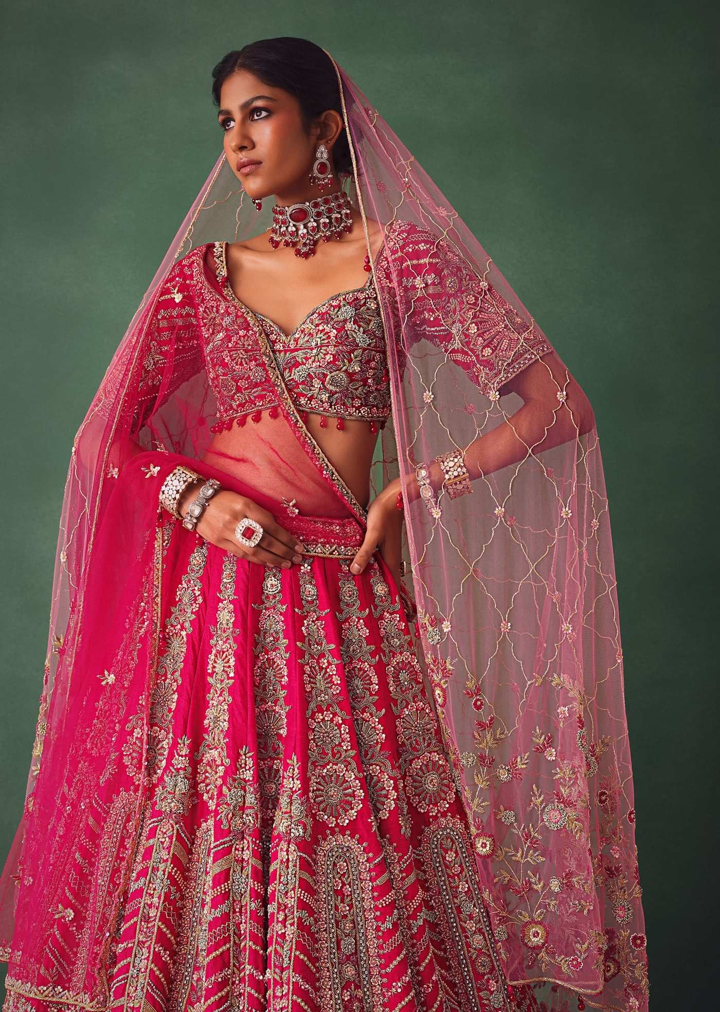 Step into a dreamlike bridal fantasy with this mesmerizing raw silk red lehenga paired with an exquisitely embroidered blouse and scalloped dupatta. The lehenga features intricate zardosi cutdana and moti... More Product Details